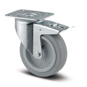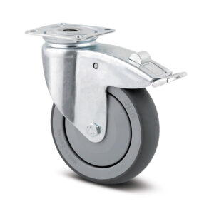 ZWENKWIEL MET DUBBELE REM, VORK VAN GEPERST STAAL, VERZINKT, DUBBELE KOGELDRAAIKRANS IN DE ZWENKKOP, WIELAS GESCHROEFD, PLAATBEVESTIGING. WIELKERN VAN POLYPROPYLEEN MET GRIJZE NIET-STREPENDE TENTEPRENE THERMOPLASTISCHE RUBBERBAND, WIELNAAF OP PRECIS