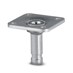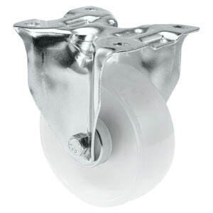 BOKWIEL, VORK VAN GEPERST STAAL, VERZINKT, WIELAS MET MOER, PLAATBEVESTIGING. WIELKERN VAN POLYAMIDE, WIELNAAF OP ROLLAGER, VOORZIEN VAN AFDEKKAPPEN