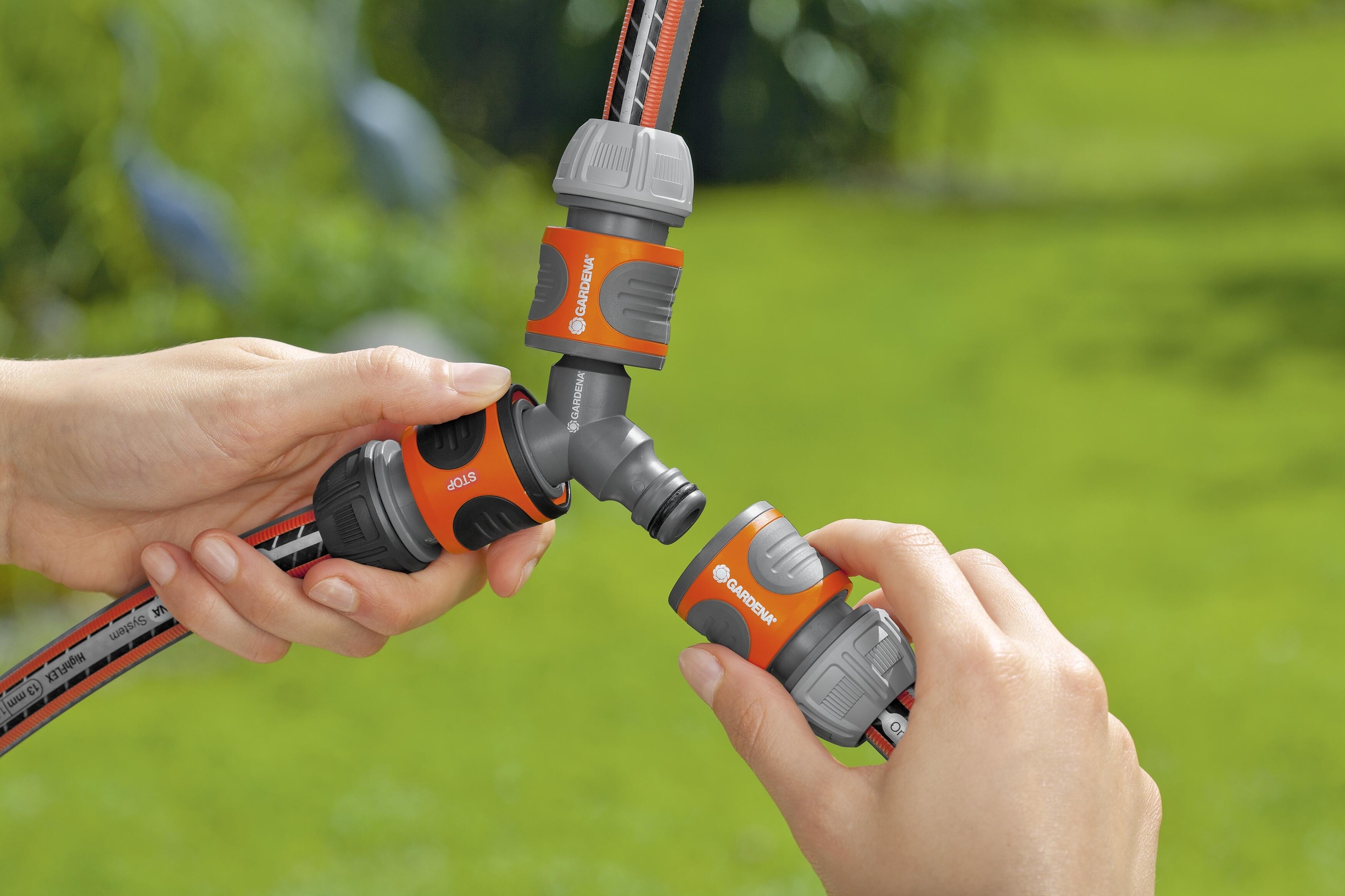 Wie kent dit probleem niet: uw tuin heeft maar één waterpunt, maar u zou graag twee installaties tegelijk op de tuinslang willen aansluiten. Door het GARDENA 3-wegstuk te gebruiken kunnen slangen eenvoudig worden afgetakt. Zo kunt u meerdere tuinwerkzaamheden tegelijk uitvoeren: u kunt het gazon sproeien terwijl u de tuinslang tegelijk gebruikt voor het besproeien van bloemperken. Het 3-wegstuk is geschikt om 19 mm (3/4")-slangen af te stemmen op 13 mm (1/2")-slangen. Voor elk probleem is er een oplossing.
