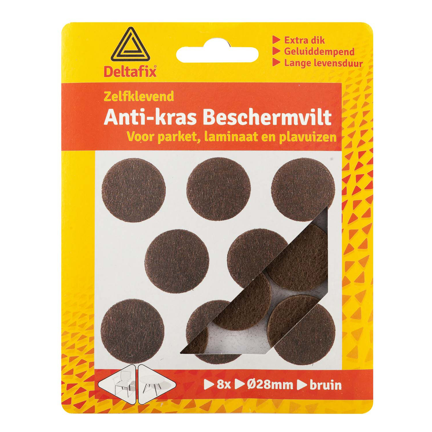 Zelfklevend anti-kras beschermvilt voor onder stoelen en andere meubels om vloeren te beschermen. Een ideale bescherming van parket, laminaat, plavuizen of stenen vloeren. Verkrijgbaar in de kleuren wit, bruin en zwart. Het vilt kan op maat geknipt worden.- extra dikke kwaliteit- geluiddempend- lange levensduurVerkrijgbaar in verschillende formaten:- 90mm x 100mm- 210mm x 297mm- rond ( 17, 22, 28 of 33mm)- vierkant (25x25mm)