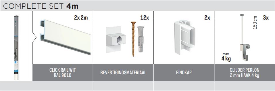 | samenstelling | 2 x Click rail wit 200cm, 4 x eindkap wit, 12 x Click&Connect+schroef+plug, 4 x perlonkoord + glijder 2mm 150cm, 4 x minihaak 4k |