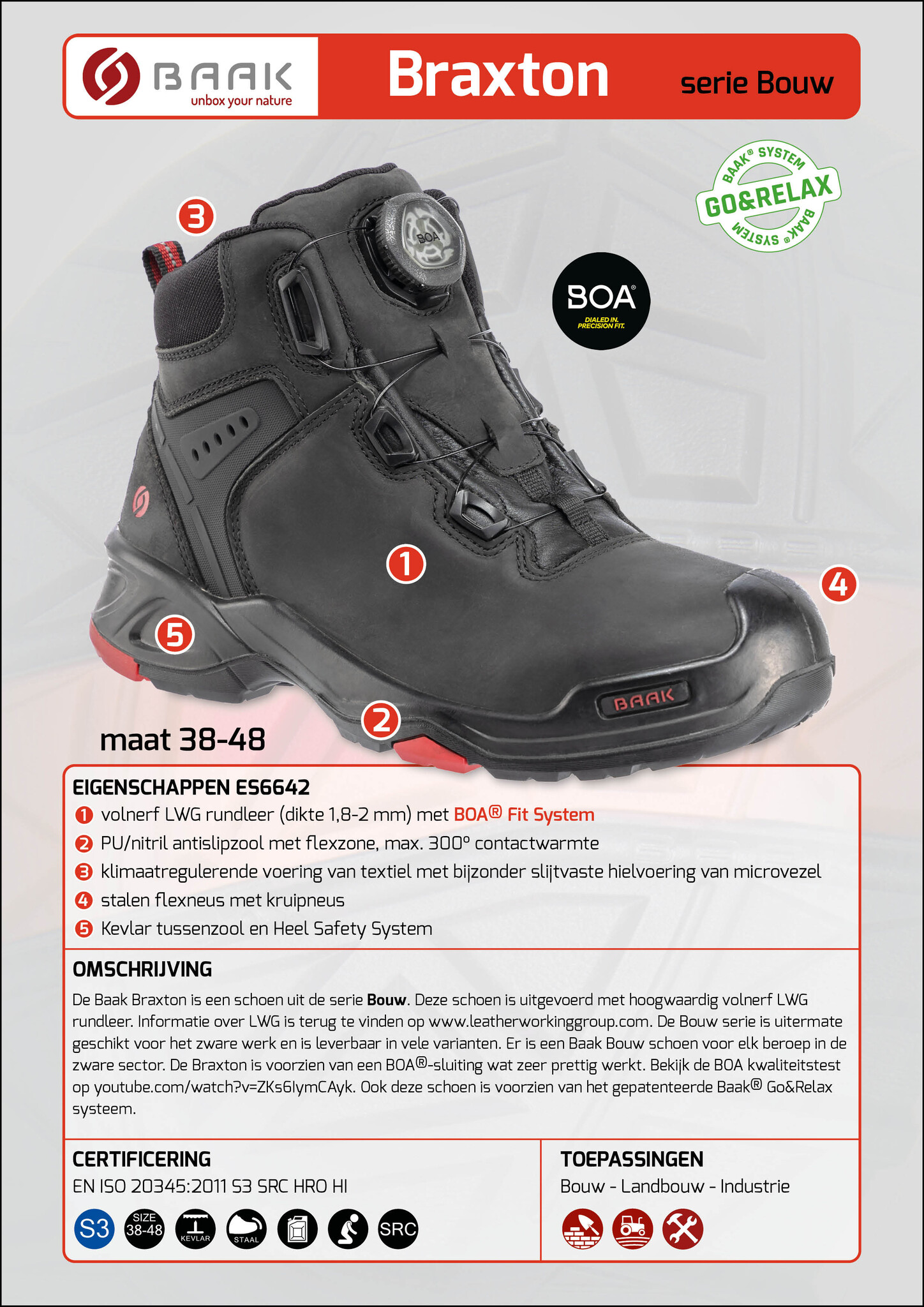 De Baak Braxton is een schoen uit de serie Bouw. Deze serie is uitgevoerd met hoogwaardig volnerf LWG rundleer. Informatie over LWG is terug te vinden op www.leatherworkinggroup.com. De Bouw serie is uitermate geschikt voor het zware werk en is leverbaar in vele varianten. Er is een Baak Bouw schoen voor elk beroep in de zware sector. De Braxton is voorzien van een BOA®-sluiting wat zeer prettig werkt. Bekijk de BOA kwaliteitstest op youtube.com/watch?v=ZKs6IymCAyk. Ook deze schoen is voorzien van het gepatenteerde Baak® Go&Relax systeem.