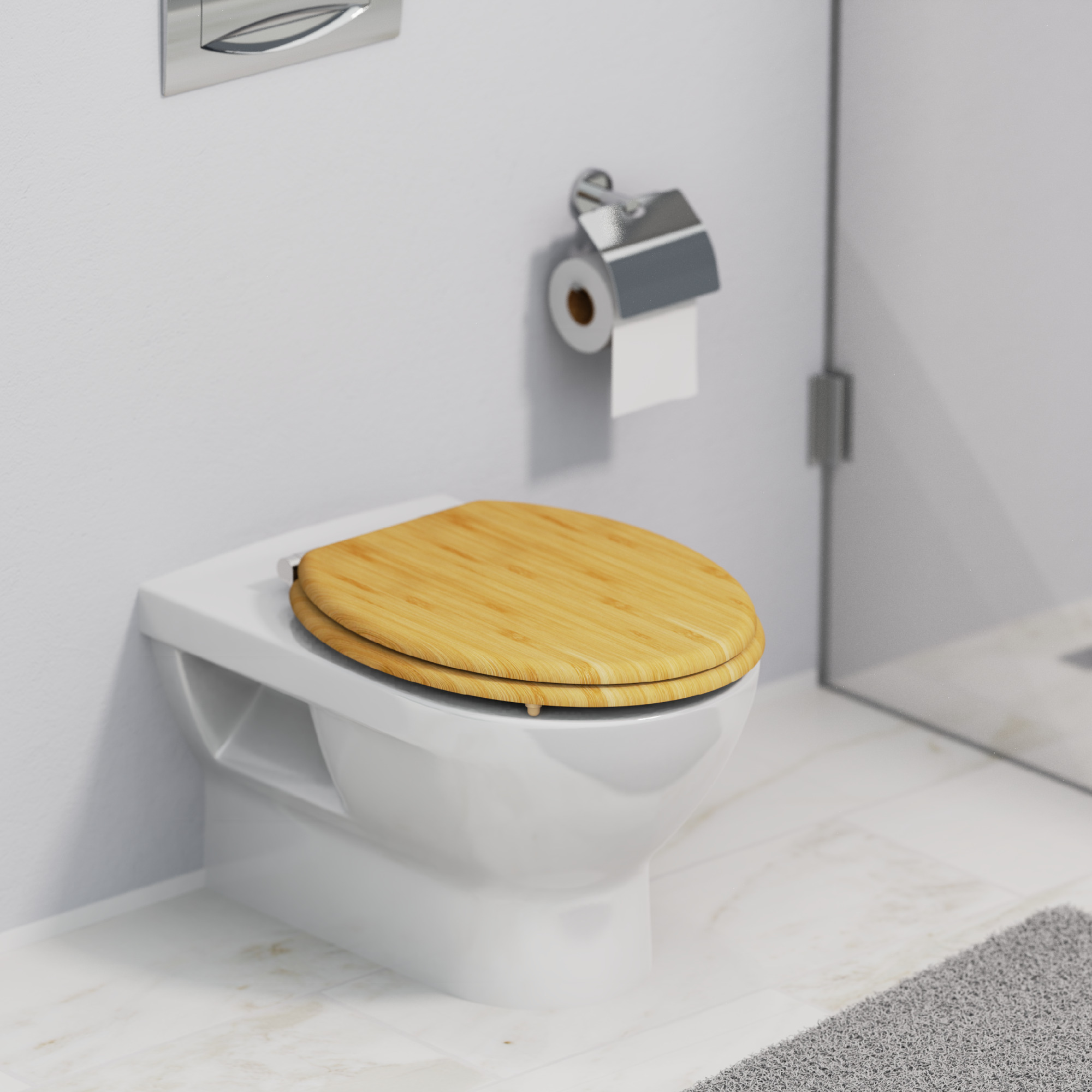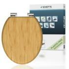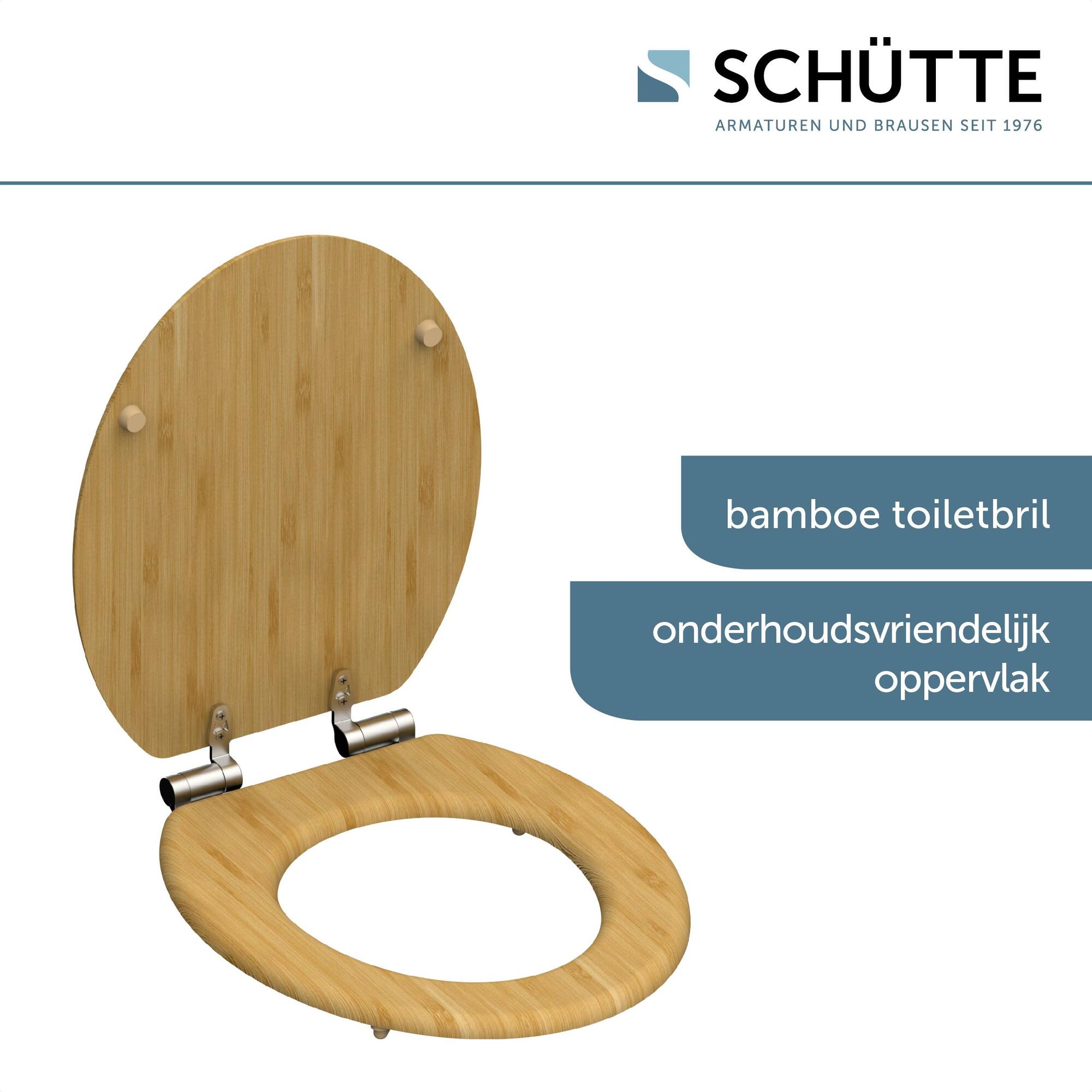 Bamboe WC-zitting, met valrem • gemak en functionaliteit: geruisloos sluiten dankzij de scharnieren met valrem • standaard formaat: compatibel met alle standaard toiletpotten • eenvoudige installatie: compleet bevestigingsmateriaal inbegrepen • Lange levensduur: extreem breukvast en robuust (bamboe) • Hernieuwbare grondstof