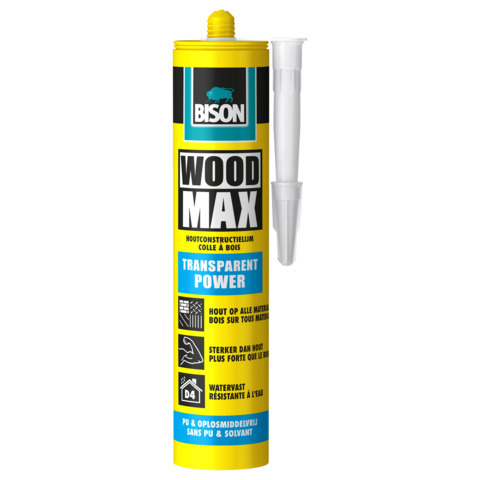 Home › Verf, lijmen en kitten › Lijmen en Kitten › BISON WOOD MAX TRANSPARANT POWER KOKER 320 G NL/FR