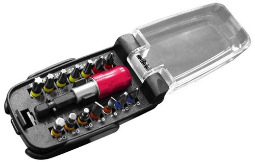 Inhoud: snelspanbithouder, bits PH1-PH2-PZ1-PZ2, SL4-6, BZK (binnenzeskant) 3-4-5, TX10-15-20-25-30.