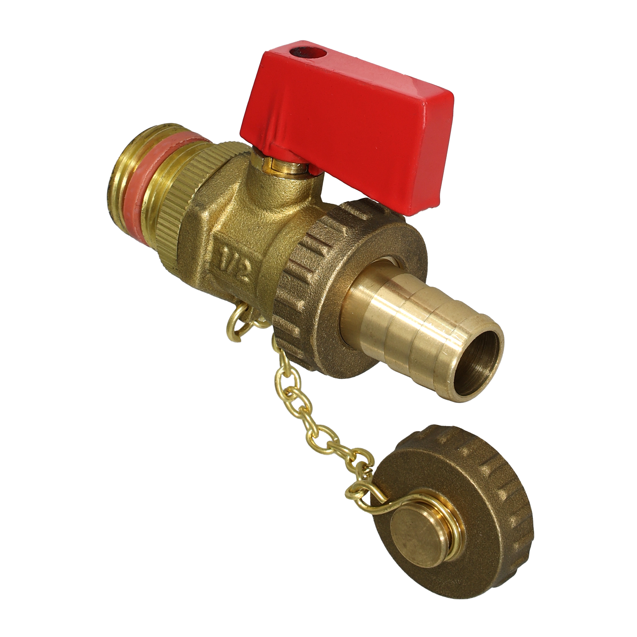 Kogel vul- en aftapkraan. Met rode knop en zelf-dichtend 1 x buitendraad.