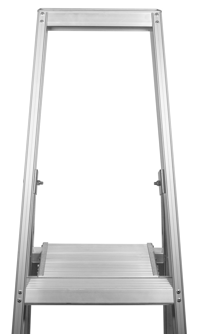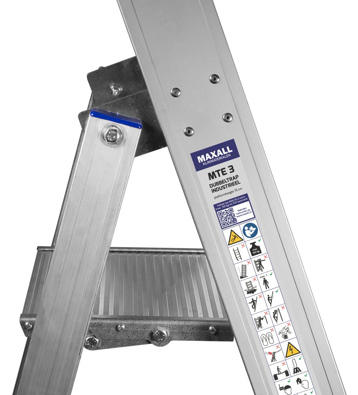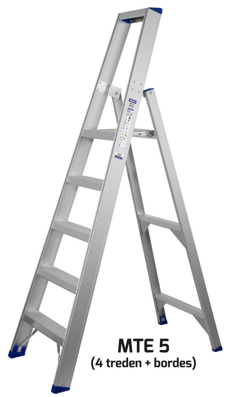 Industriële bordestrap van geanodiseerd aluminium met gereedschapsbakje en extra spreidbeveiliging van band vanaf MTE/6. De trapbomen hebben rubber/PE trapdoppen voor optimale grip. De treden zijn 83 mm breed en voorzien van dubbele popnagels. De metalen scharnieren en bordes zorgen voor optimale kwaliteit en stabiliteit. Het aantal treden is inclusief bordes (zie afbeelding van MTE/5 met type-aanduiding).