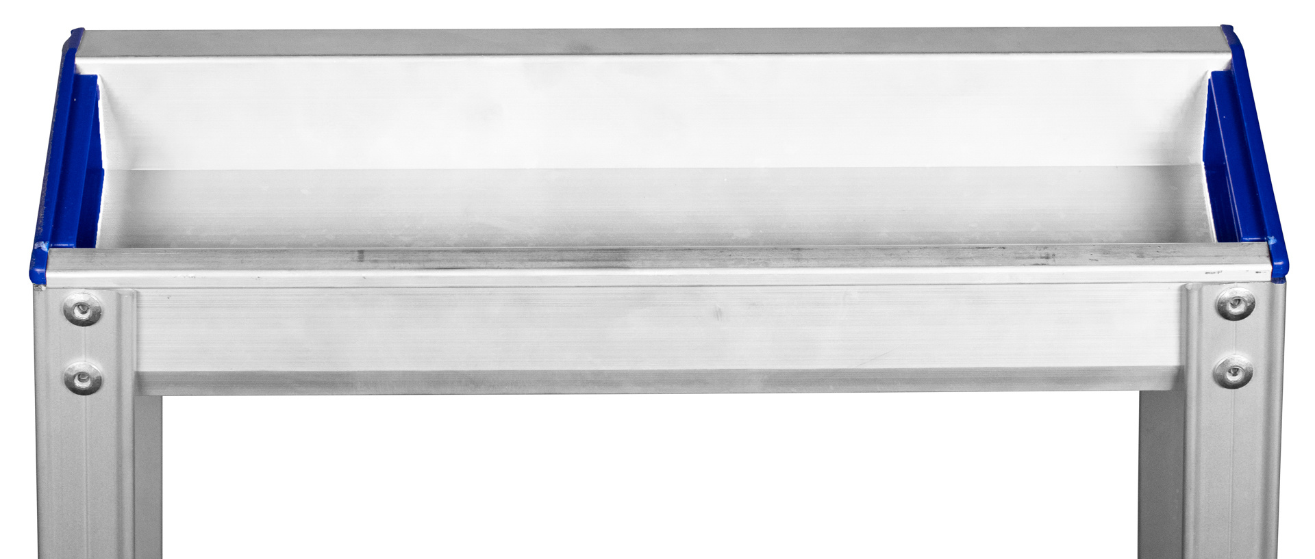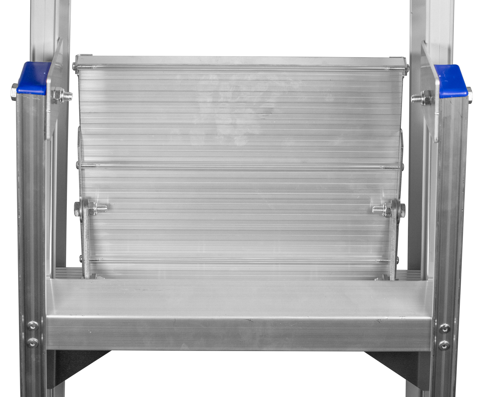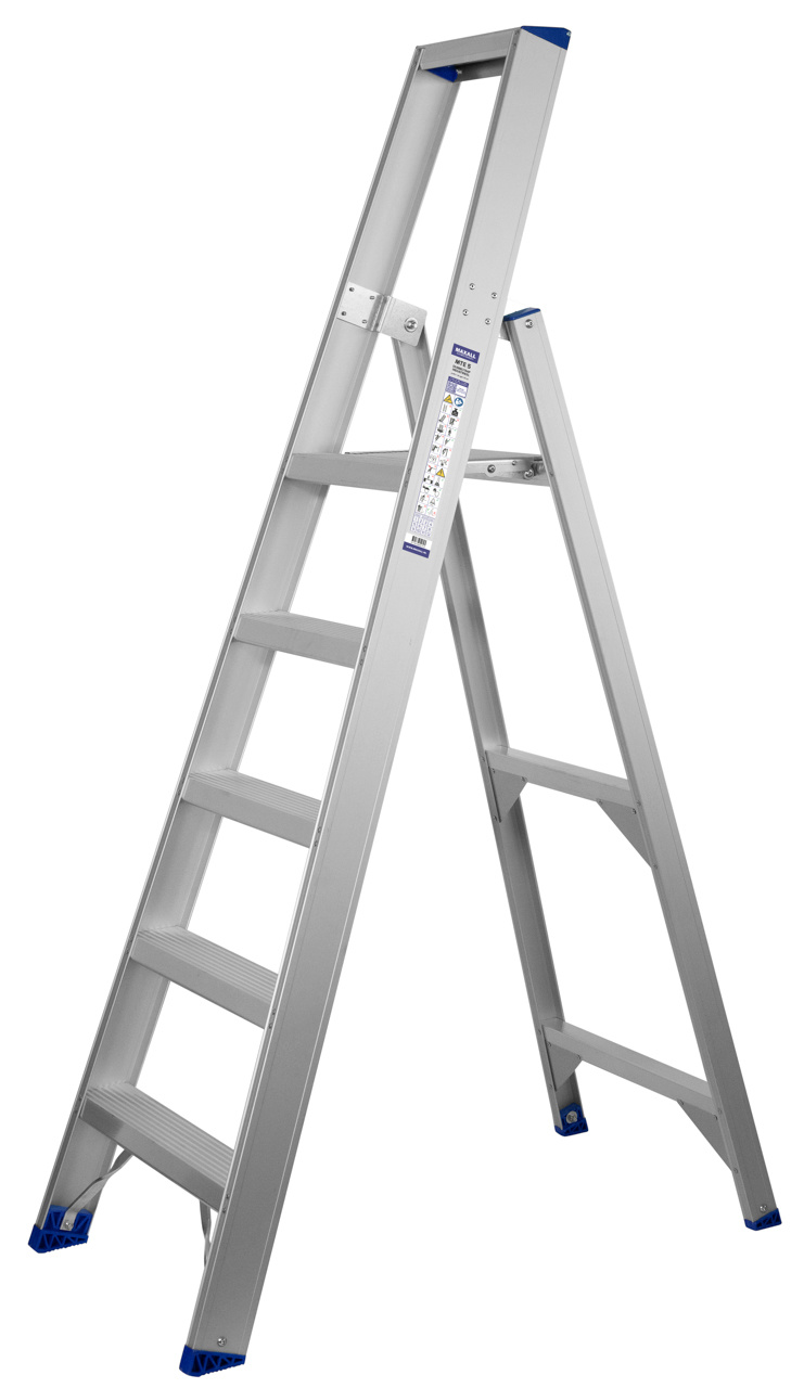 Industriële bordestrap van geanodiseerd aluminium met gereedschapsbakje en extra spreidbeveiliging van band vanaf MTE/6. De trapbomen hebben rubber/PE trapdoppen voor optimale grip. De treden zijn 83 mm breed en voorzien van dubbele popnagels. De metalen scharnieren en bordes zorgen voor optimale kwaliteit en stabiliteit. Het aantal treden is inclusief bordes (zie afbeelding van MTE/5 met type-aanduiding).