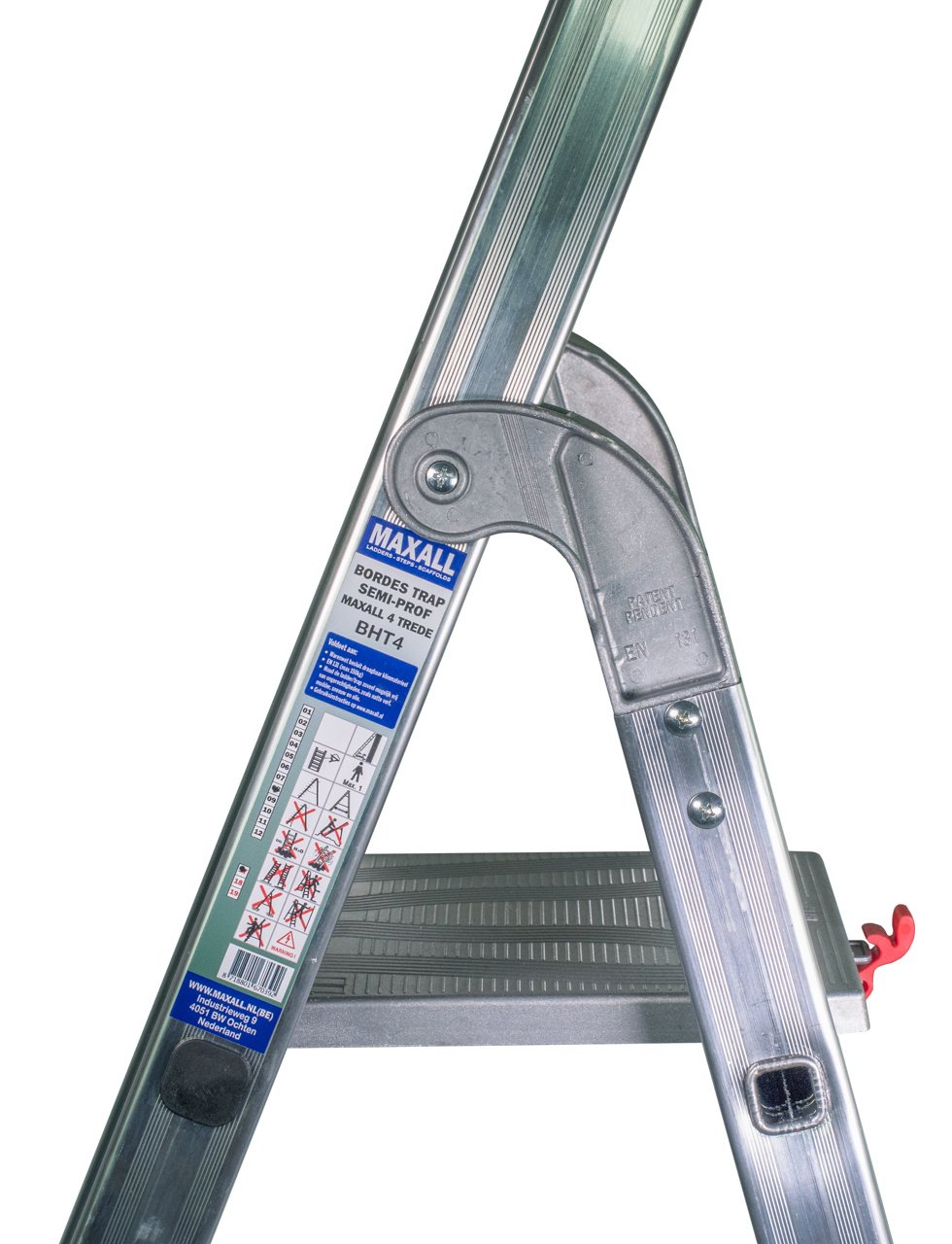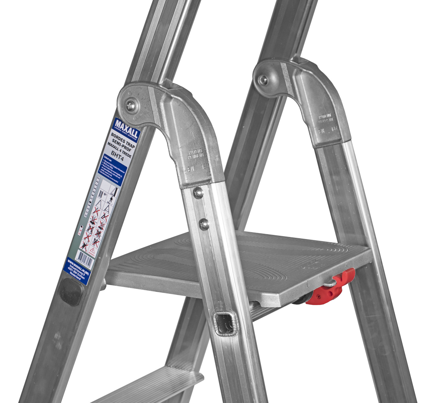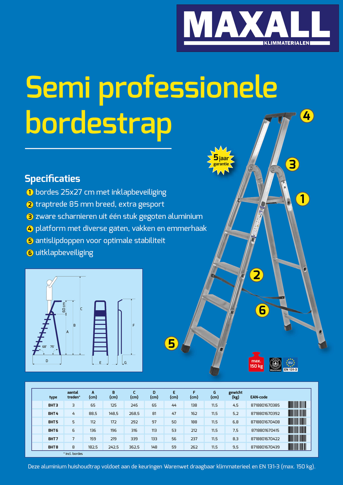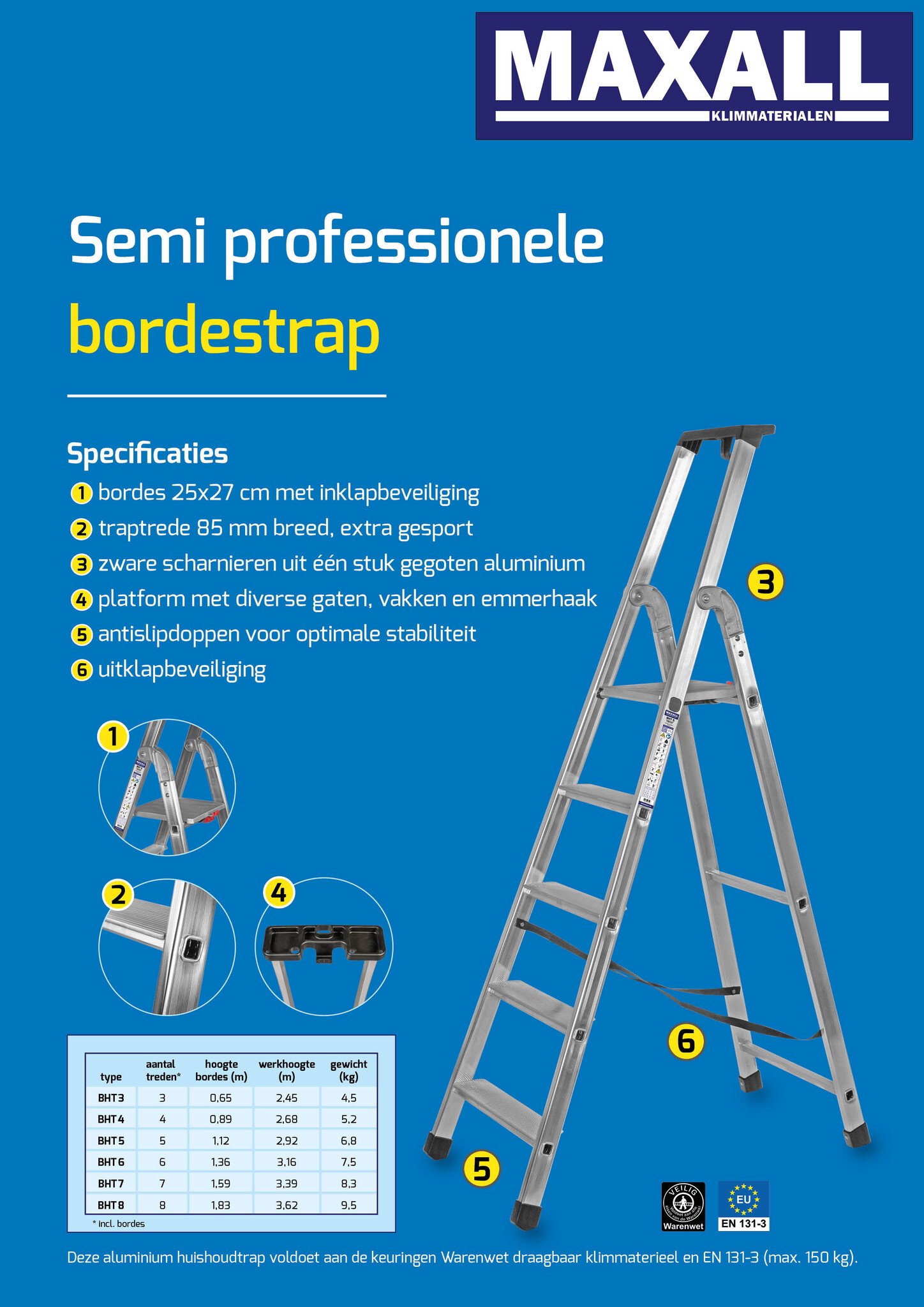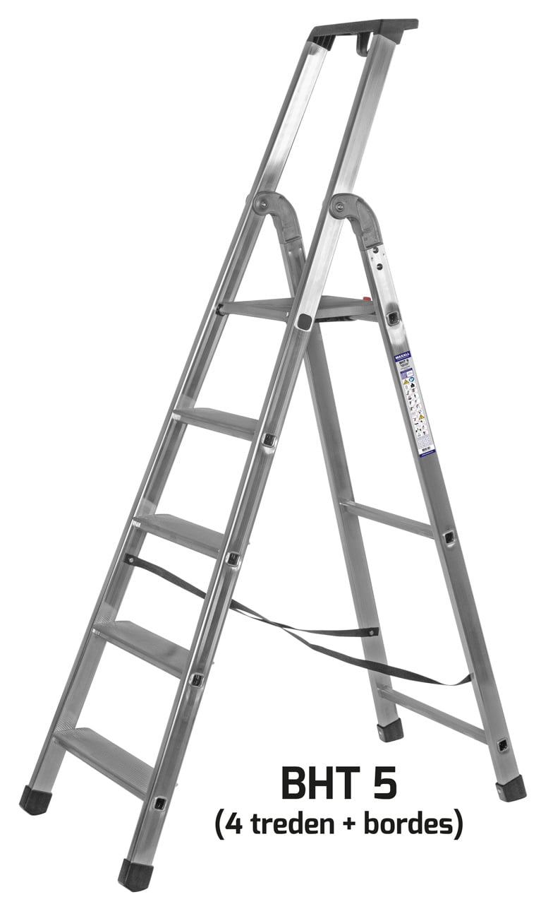 Stevige semi-professionele bordestrap van aluminium met gefelste treden en spreidbeveiliging van band. Bordes van 250×260 mm met veiligheidspal, diverse gereedschapsgaten, vakken en emmerhaak. De treden zijn 85 mm breed. De zware aluminium scharnieren en het aluminium bordes zorgen voor optimale kwaliteit en stabiliteit. Het aantal treden is inclusief bordes (zie afbeelding van BHT5 met type-aanduiding).