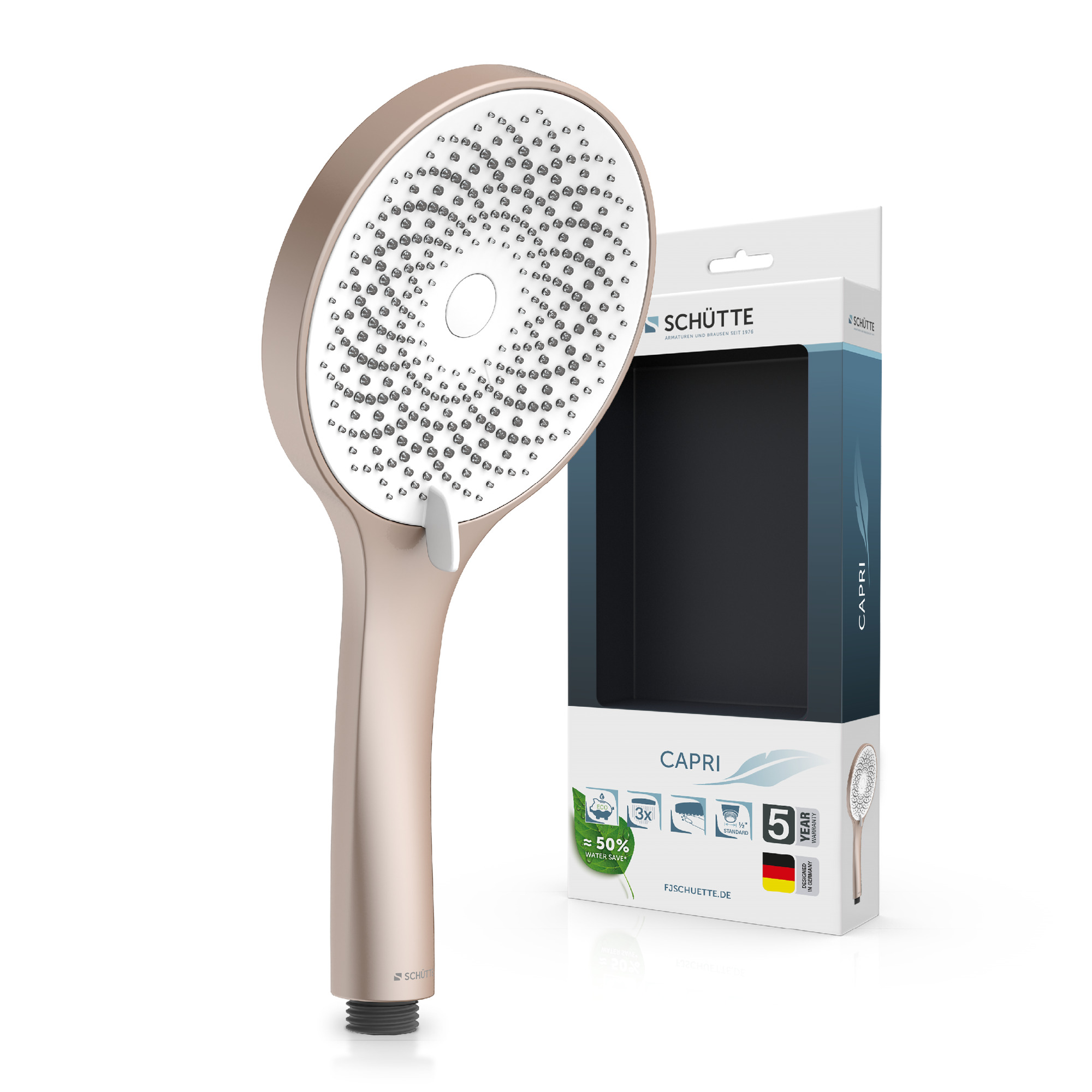 CAPRI Handdouche, rosé mat/wit • antikalk nozzles • ½” (Ø ca. 1,9 cm) doucheslang verbinding • 3 straalsoorten • Garantie: 5 jaar