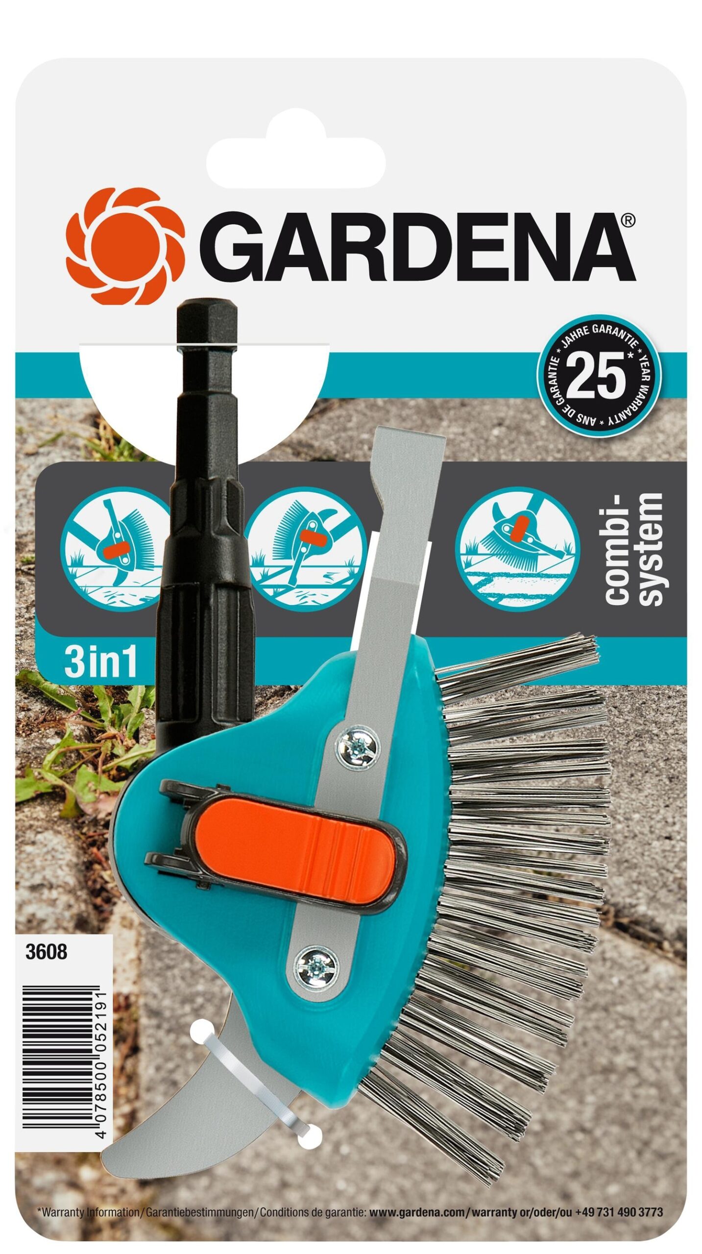 Met de GARDENA combisystem 3in1 Voegenkrabber/borstel verwijder je gemakkelijk onkruid en mos uit je achtertuin, voortuin of oprit. Dankzij de makkelijk verwisselbare accessoires is het GARDENA combisystem flexibel te gebruiken. De Voegenkrabber/borstel kan met alle stelen van het GARDENA combisystem gecombineerd worden en je bevestigt hem door hem op de steel te schuiven en vast te schroeven. GARDENA raadt een steel met een lengte van 130 of 150 cm aan, maar de keuze van de steel hangt ook af van de werkomstandigheden en je lichaamslengte. De betrouwbare aansluiting tussen de voegenkrabber/borstel en de steel zorgt ervoor dat je altijd comfortabel kan werken. De 3in1 Voegenkrabber/borstel combineert 3 gereedschappen in 1: het robuust en dun roestvrijstalen mes laat je precies en grondig werken in bijzonder nauwe spleetjes, zoals nauw aangesloten straatstenen op het terras of in de tuin. Met de driehoekig gebogen roestvrijstalen boog verwijder je onkruid en mos uit bredere voegen. Met de metalen borstels kan je mos bijzonder gemakkelijk verwijderen. Daarna veeg je het verwijderde mos gemakkelijk weg met de borstels. De Voegenkrabber/borstel werkt puur mechanisch, zodat je het milieu efficiënt beschermt. Je kan de roestvrijstalen boog en het roestvrijstalen met gemakkelijk vervangen zodra deze versleten zijn. Berg de Voegenkrabber/borstel op met het combisystem Gereedschapsrek Flex (art.nr. 3505-20). GARDENA geeft 25 jaar garantie op de combisystem 3in1 Voegenkrabber/borstel als je registreert op gardena.com/registration binnen 3 maanden na aankoop. Let your tool family grow. GARDENA combisystem. Verwisselbaar. Duurzaam. Voor al je tuinwerk.