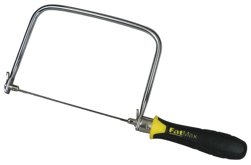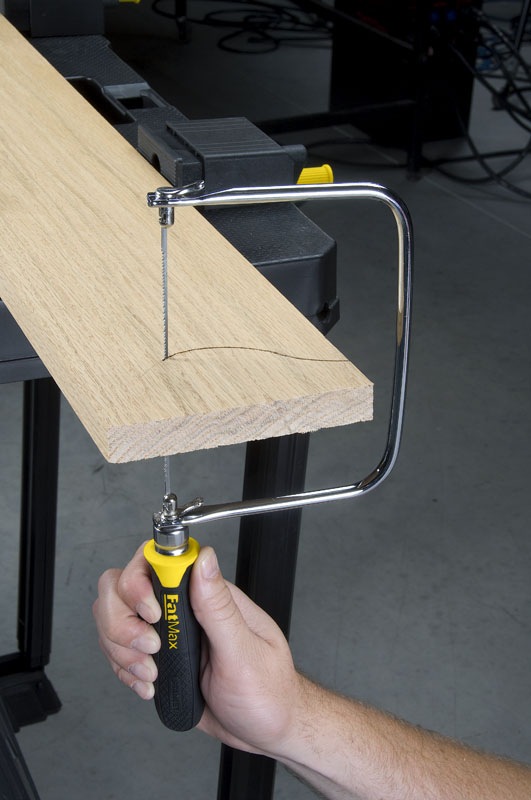 Rond, verchroomd stalen frame gespannenGehard en getemperd hoog kwalitatief carbon stalen zaagbladBlad wordt aangespannen door te draaien aan de hardhouten handgreepGeleverd met 3 reservebladen