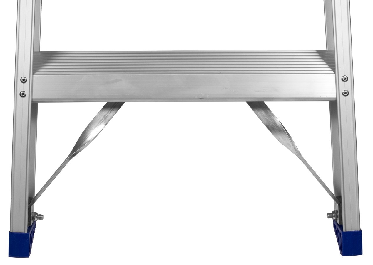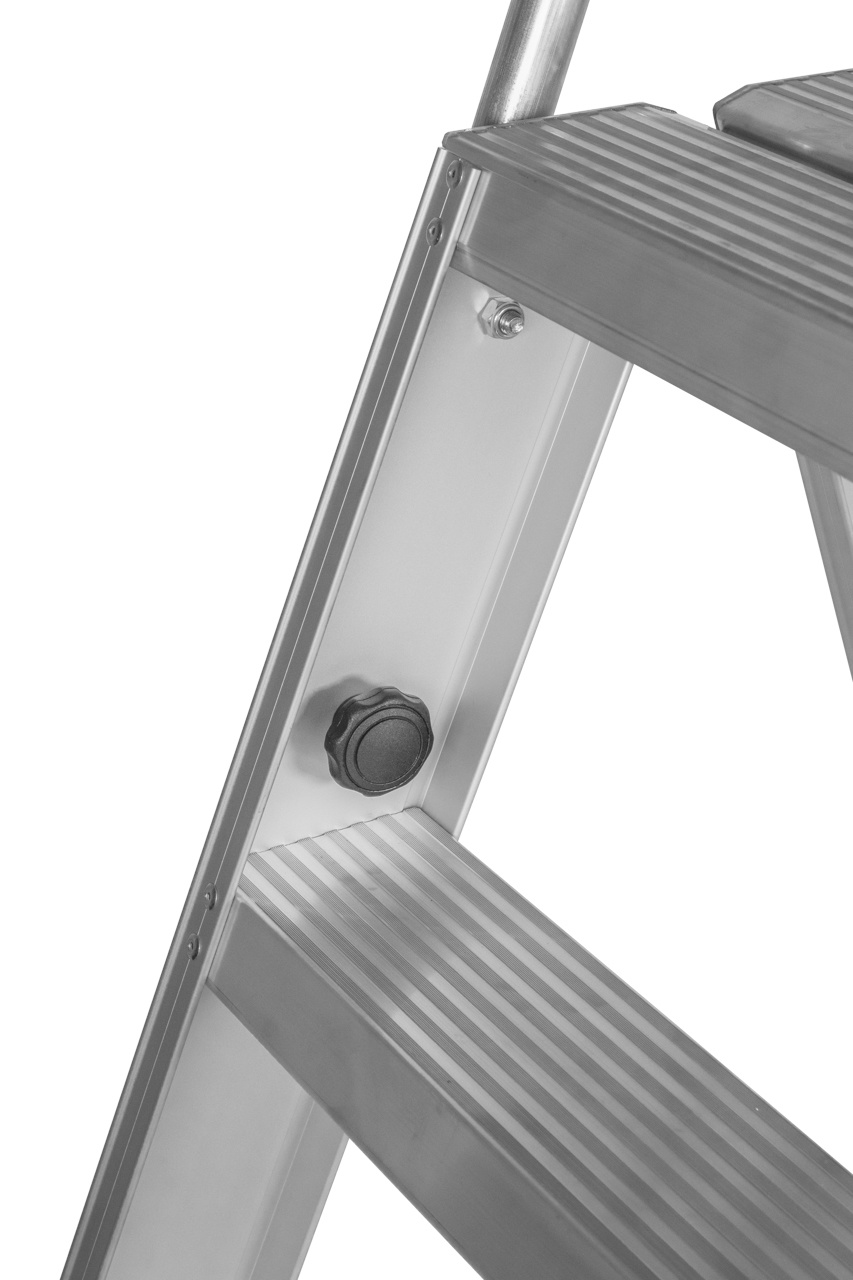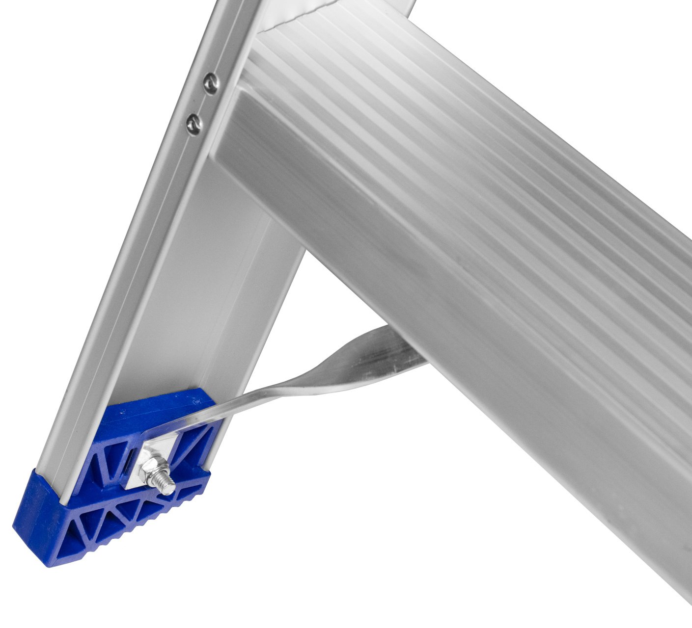 Industriële dubbeltrap van geanodiseerd aluminium met wegklapbare veiligheidsbeugel (verplicht vanaf 3 treden) en metalen spreidbeveiliging. De trapbomen hebben rubber/PE trapdoppen voor optimale grip. De treden zijn 83 mm breed en voorzien van dubbele popnagels. De metalen scharnieren en spreidbeveiliging zorgen voor optimale kwaliteit en stabiliteit. De veiligheidsbeugel wordt vanaf 3 treden los bijgeleverd en is eenvoudig te monteren en weg te klappen na gebruik. Het aantal treden is inclusief plateau (zie afbeelding van MTD/4 met type-aanduiding).