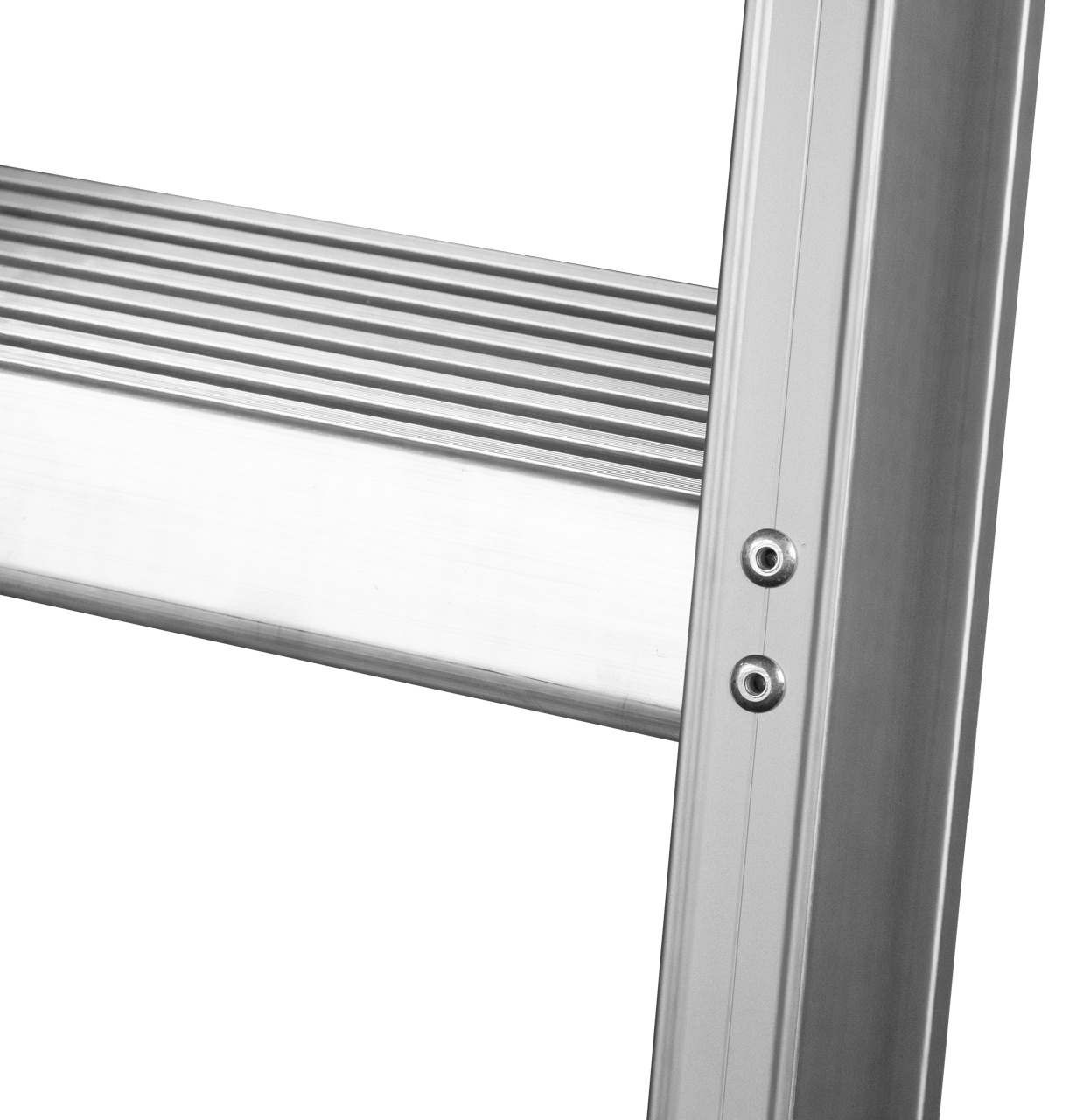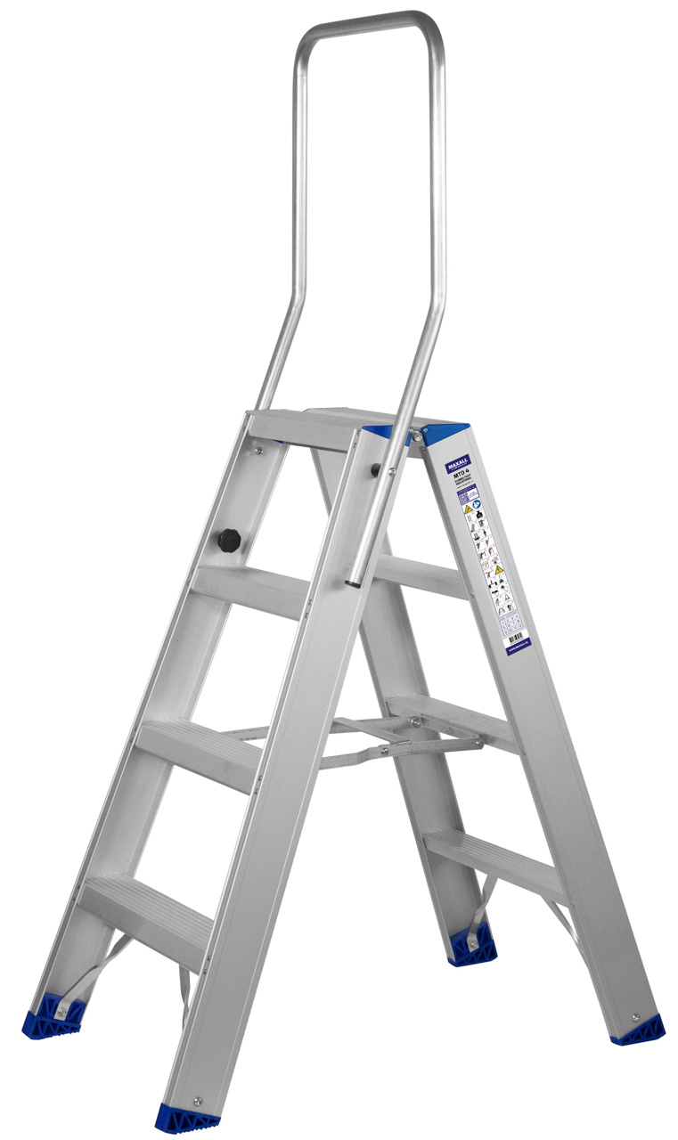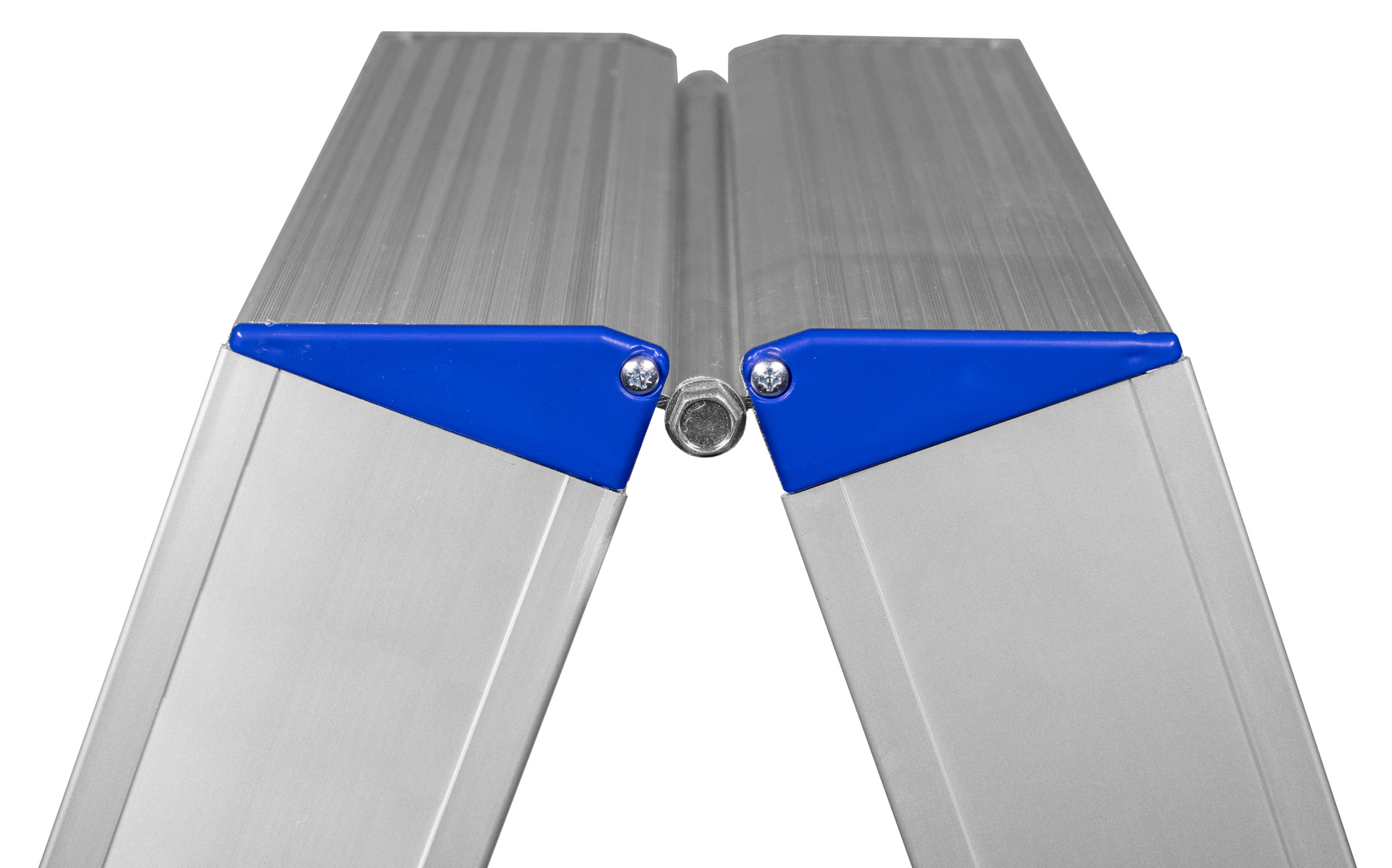 Industriële dubbeltrap van geanodiseerd aluminium met wegklapbare veiligheidsbeugel (verplicht vanaf 3 treden) en metalen spreidbeveiliging. De trapbomen hebben rubber/PE trapdoppen voor optimale grip. De treden zijn 83 mm breed en voorzien van dubbele popnagels. De metalen scharnieren en spreidbeveiliging zorgen voor optimale kwaliteit en stabiliteit. De veiligheidsbeugel wordt vanaf 3 treden los bijgeleverd en is eenvoudig te monteren en weg te klappen na gebruik. Het aantal treden is inclusief plateau (zie afbeelding van MTD/4 met type-aanduiding).
