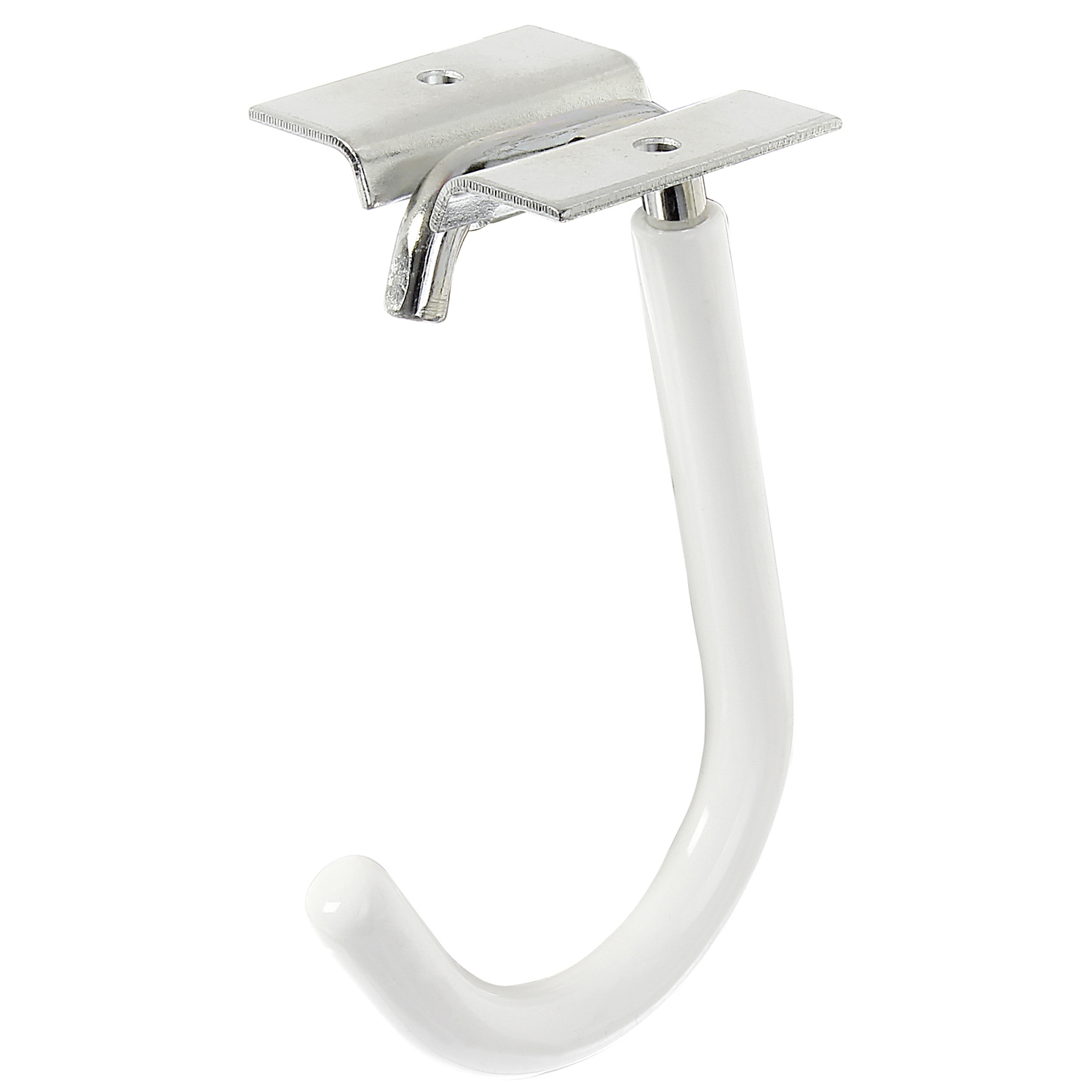 Deze gebogen fietshaak is ideaal om uw fiets op te hangen. Om uw fiets niet te beschadigen is deze haak voorzien van een witte kunststof hoes. De haak is gemaakt van verzinkt staal en heeft een afmeting van 90 x 115 mm. De haak is bedoeld voor bevestiging aan het plafond. Technisch gegevens: Plaathoogte: 60 mm Plaatdiepte: 50 mm Rond staal: Ø8 mm Belasting max.: 20 kg