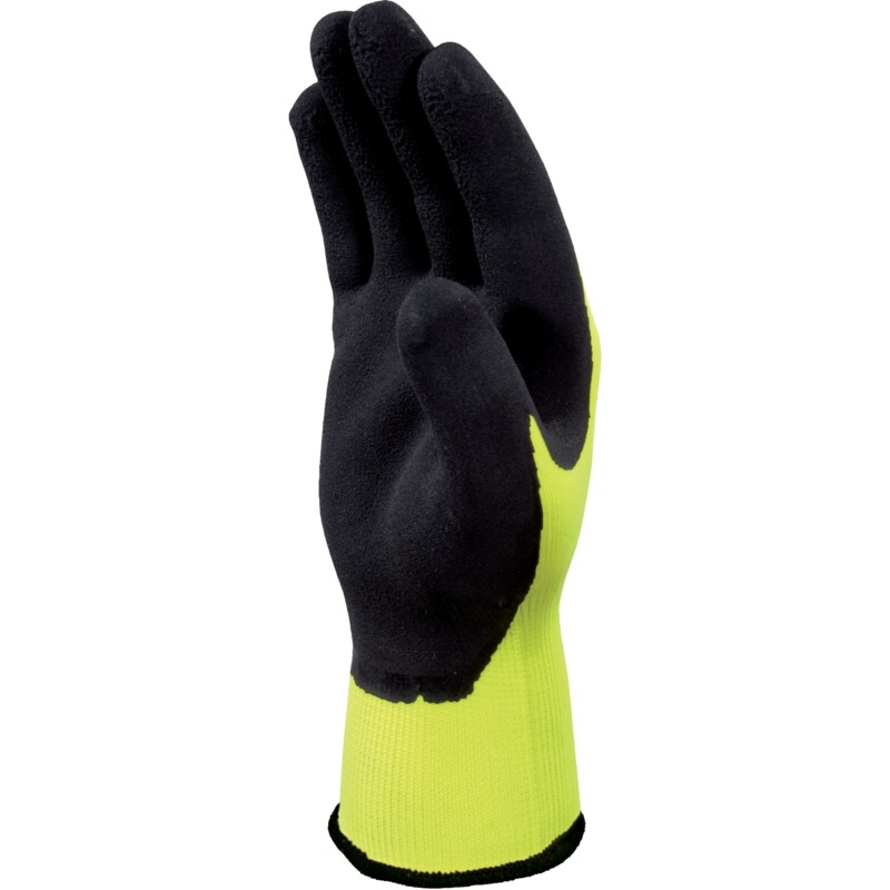 Mechanische handschoen, ideaal voor natte omstandigheden, met hoog ademend vermogen en gemakkelijk te herkennen door de fluorescerende rug Prestaties: Grote lichtheid voor optimale behendigheid | Zichtbaarheid: Fluorescerende ondersteuning om visuele identificatie van de handschoen te vergemakkelijken Ondersteuning : Gebreid – Polyester | Coating : Latexschuim – Palm coating | Jauge : 13