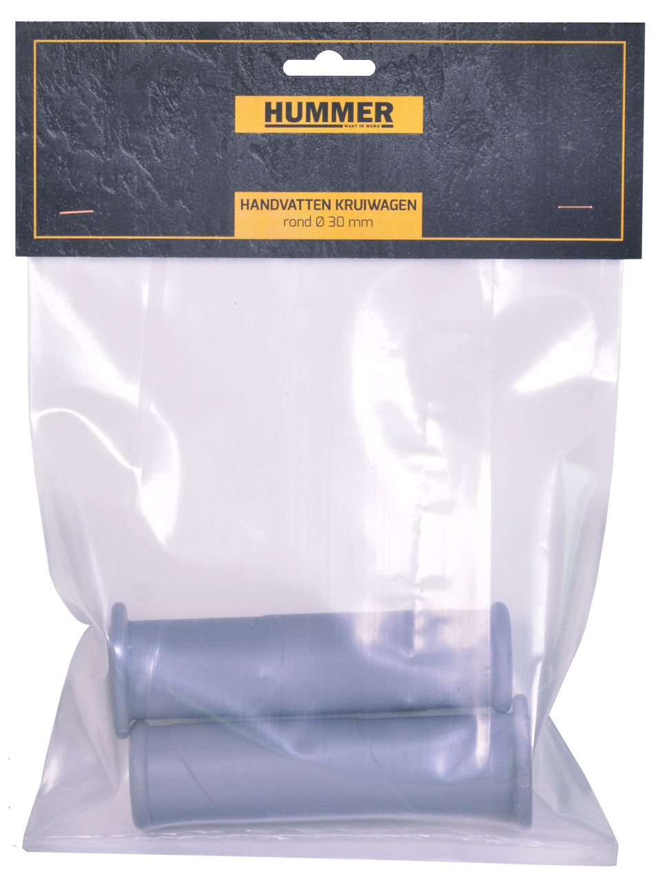 Grijs rond handvat (Ø 30 mm). Geschikt voor alle Hummer kruiwagens met een frame van ronde buis. Per 2 stuks verpakt met kopkaart en eurosleuf.