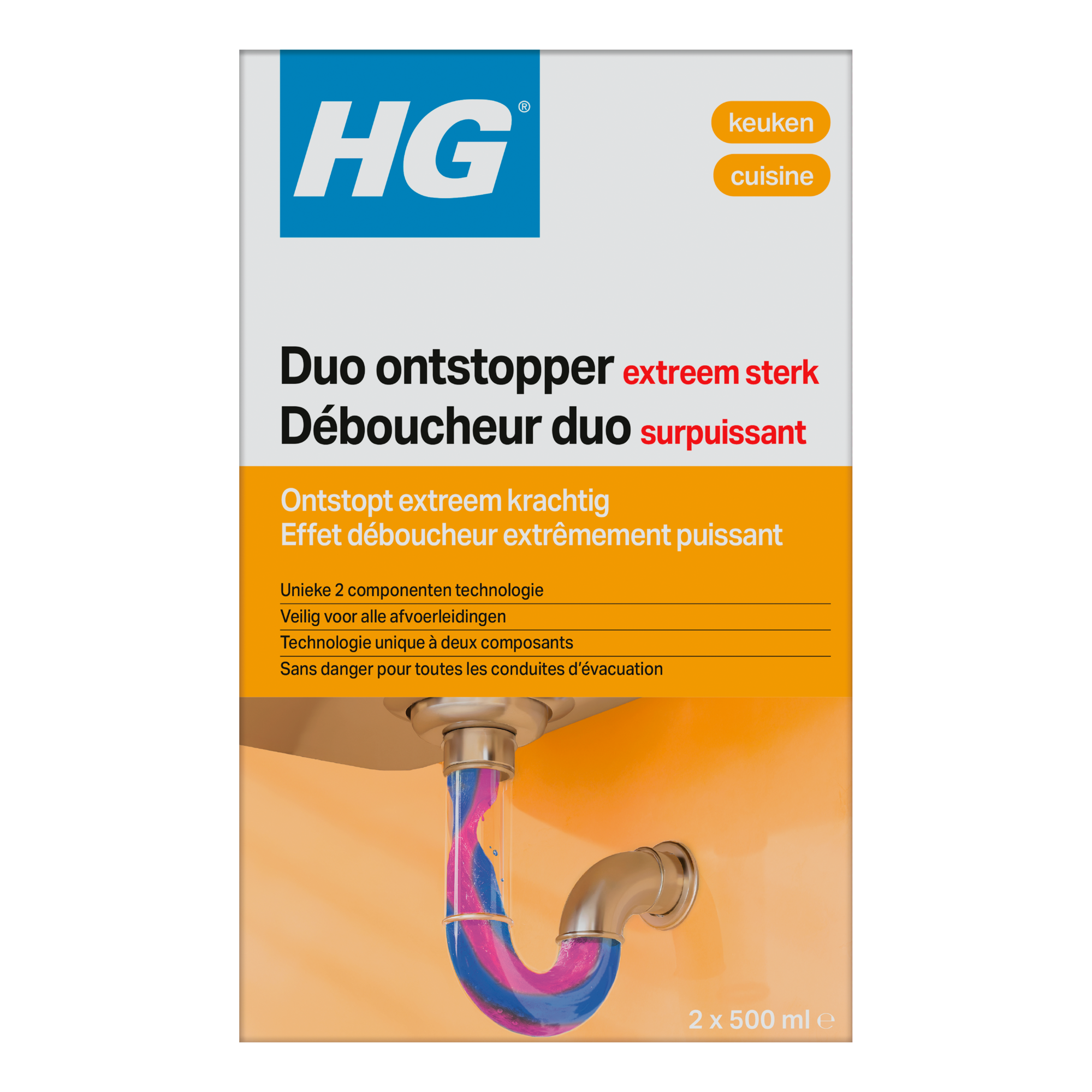 HG duo ontstopper is gebaseerd op een unieke 2-componententechnologie die werkt tegen verschillende extreme verstoppingen. In de keuken wordt dit vaak veroorzaakt door vet- en etensresten. In de badkamer vaak door tandpasta, haar, zeepresten en huidvetten. Beide componenten zijn gebruiksklaar en hoeven niet verdund te worden, waardoor het niet bruist en spat.