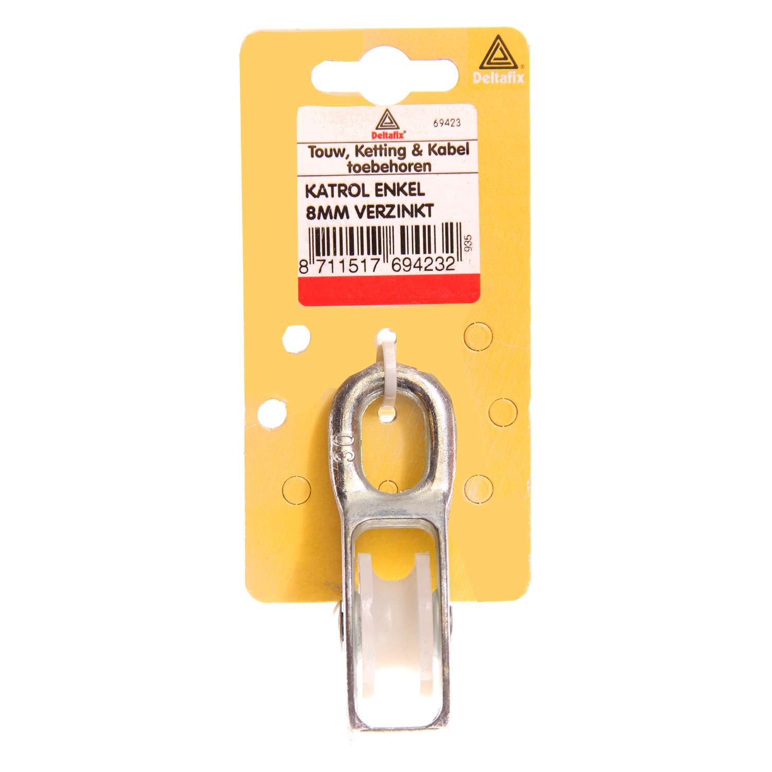 Enkele hijskatrol met een kunststof wiel en een enkel vast oog. Deze katrol is voor meerdere toepassingen te gebruiken.