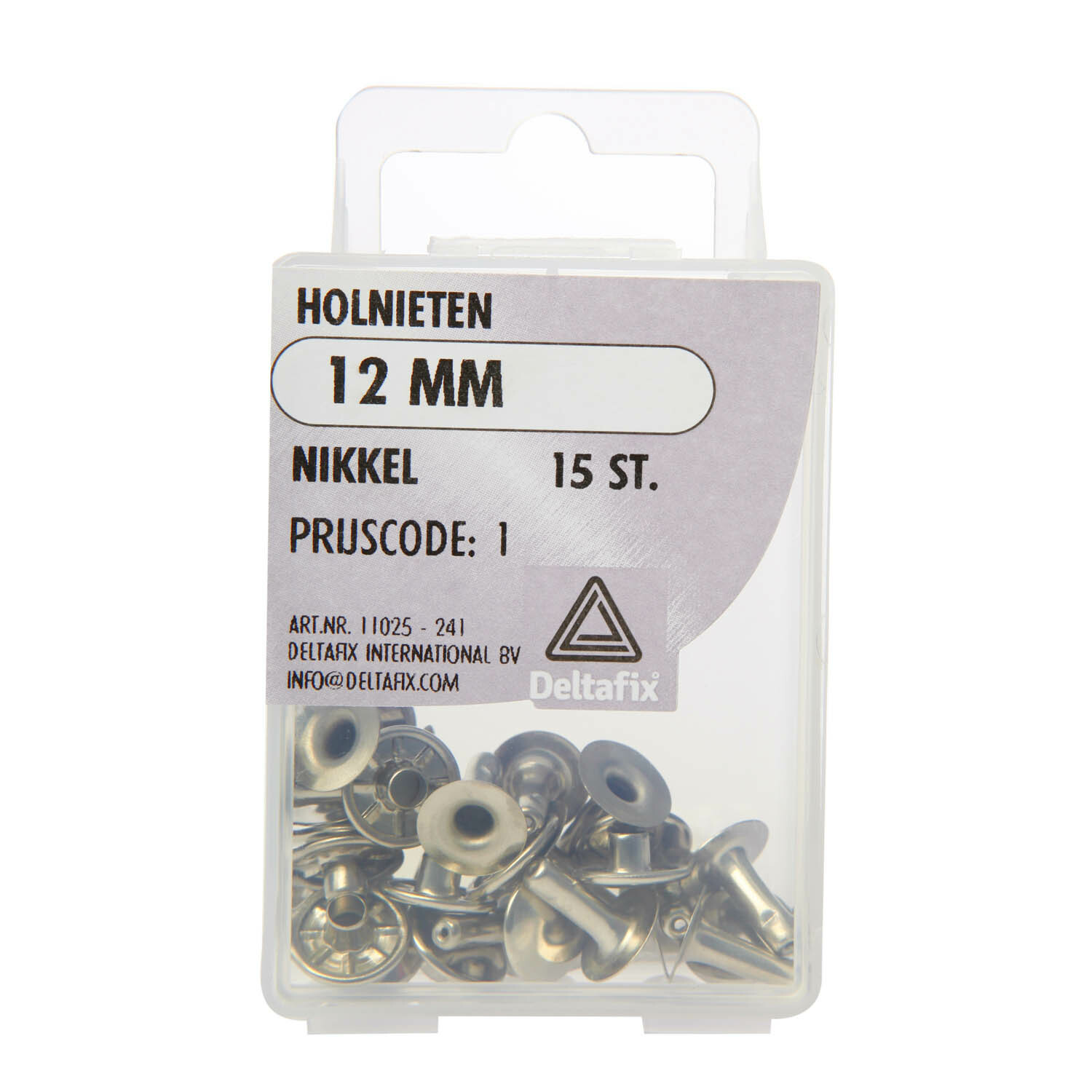 Nikkelen holnieten, ook wel klinknagels of rivetten genoemd. Een holniet is een tweedelige holle klinknagel. Hiermee worden lagen materiaal als textiel, karton en leer aan elkaar verbonden. Holnieten zijn redelijk sterk en hebben vaak een decoratief effect.