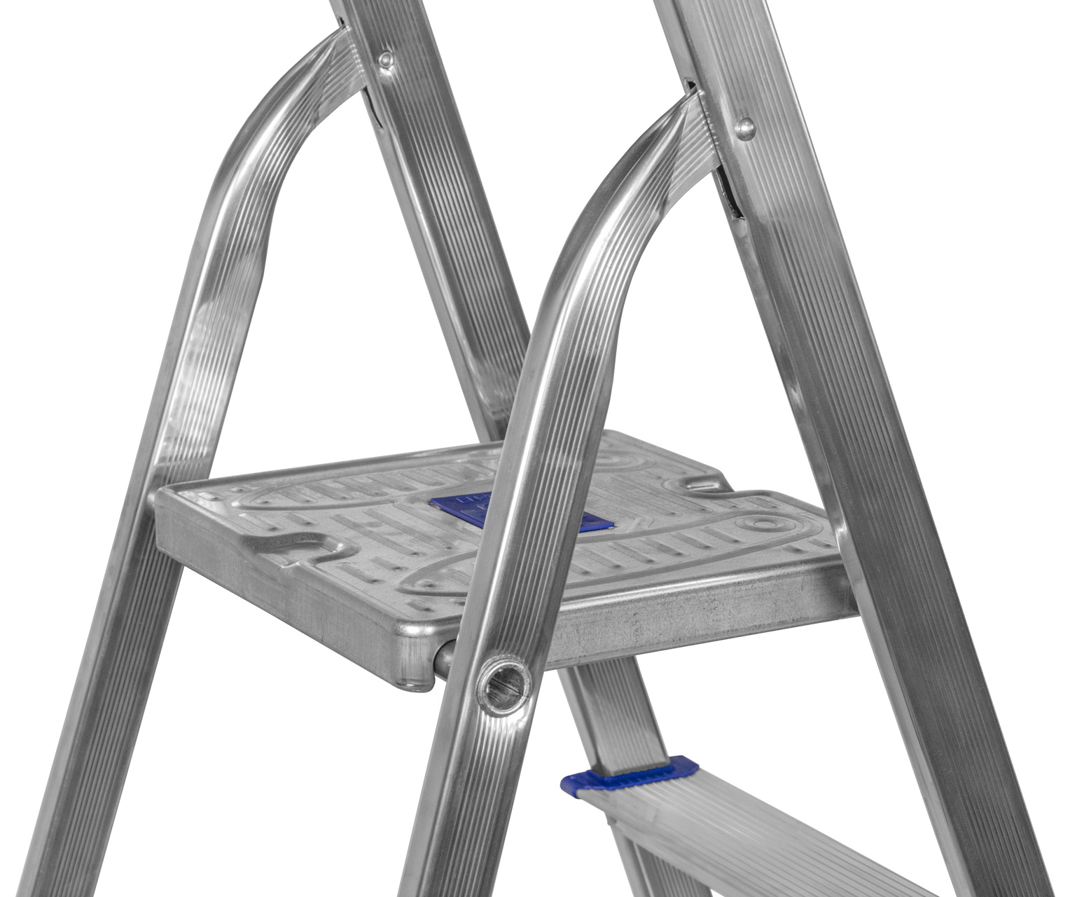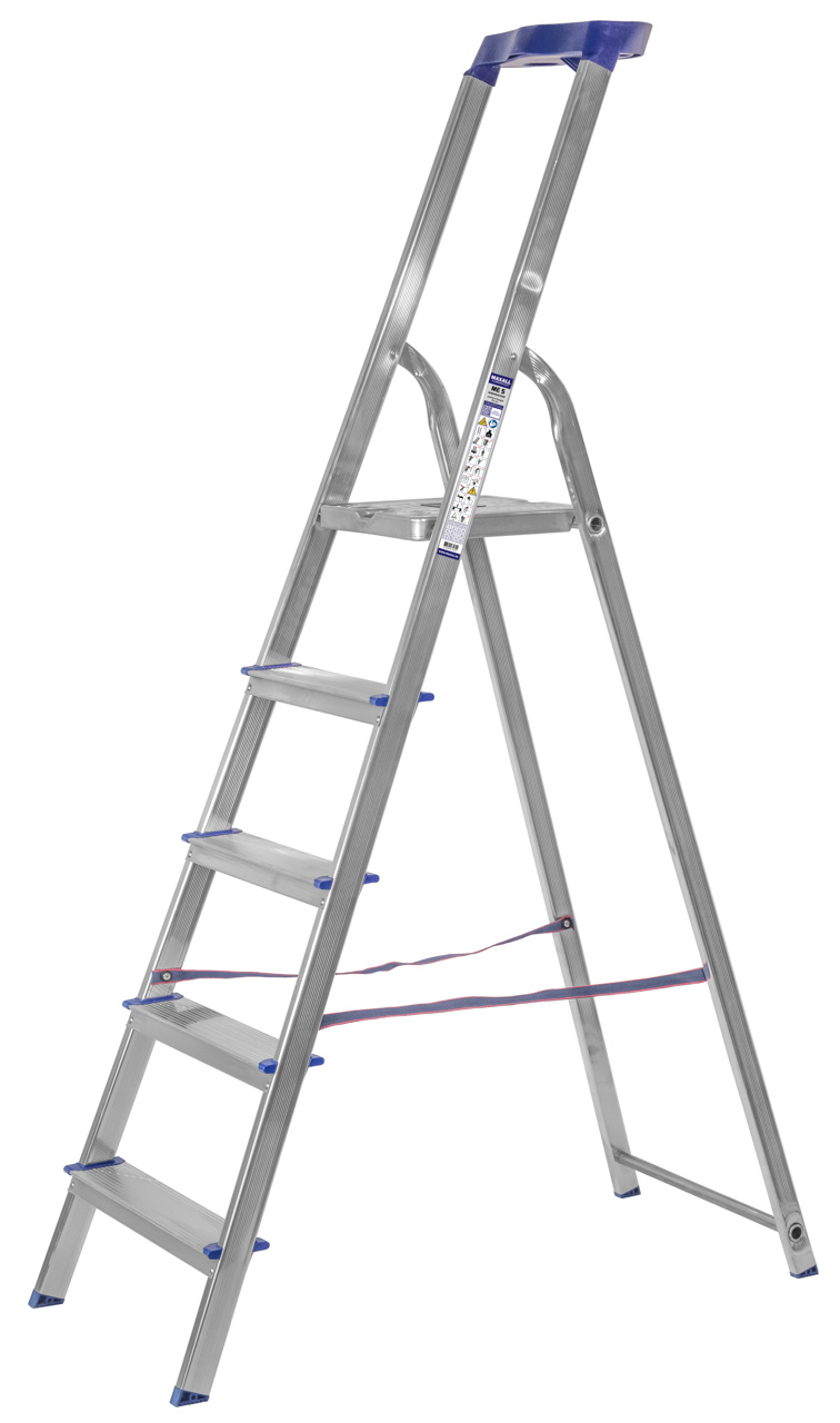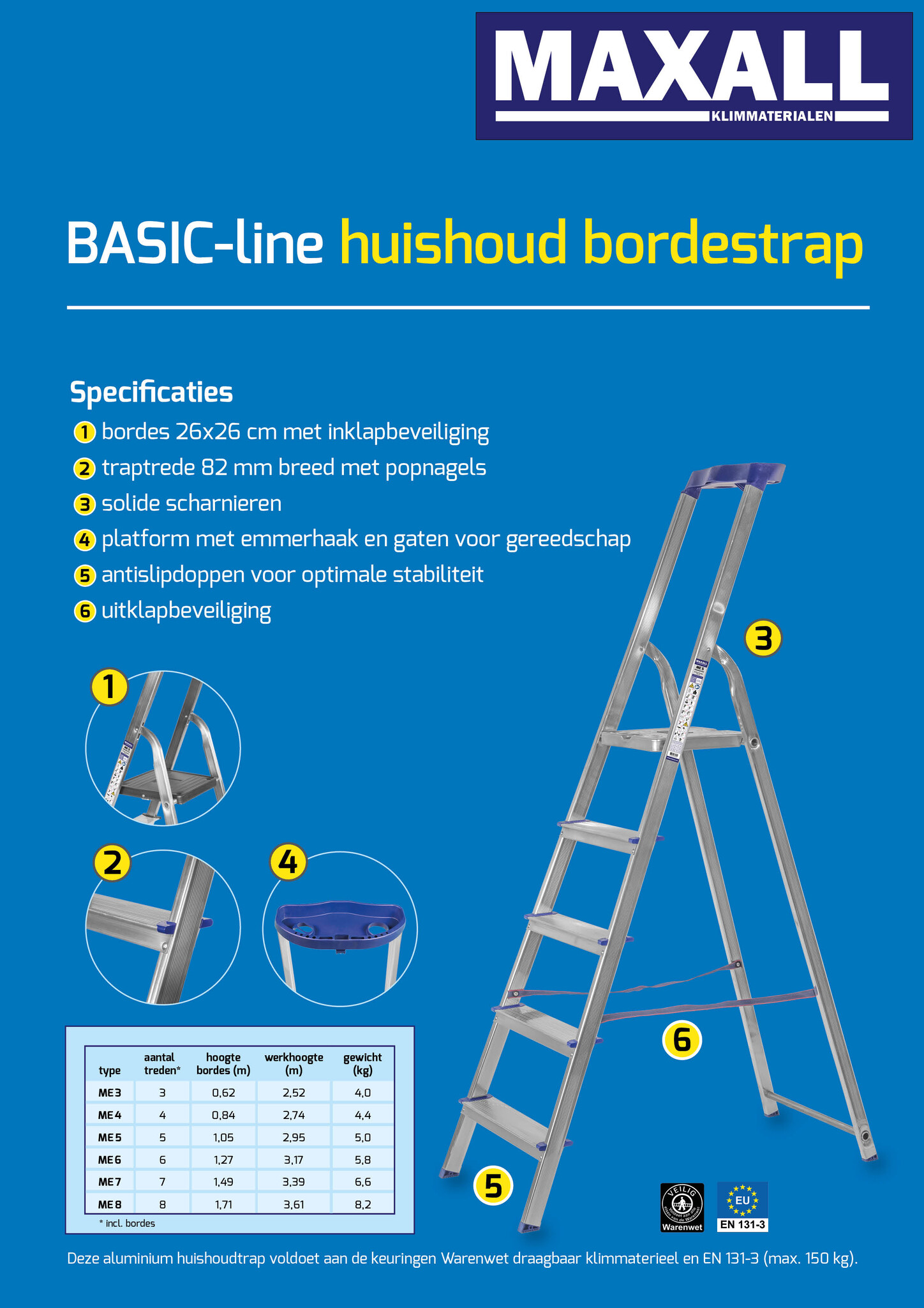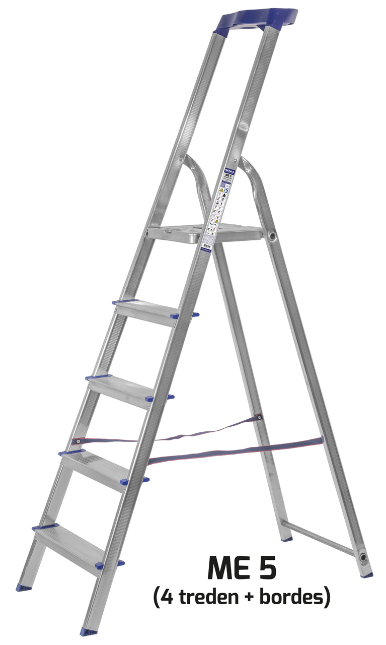 Lichtgewicht aluminium huishoud bordestrap BASIC-line met metalen bordes van ca. 26×26 cm en handige gereedschapshouder. De gereedschapshouder heeft meerdere gereedschapsgaten, een groot vak voor kleine onderdelen en een emmerhaak. De treden zijn 82 mm breed en zijn voorzien van popnagels en kunststof beschermkapjes. Het aantal treden is inclusief bordes (zie afbeelding van ME5 met type-aanduiding).