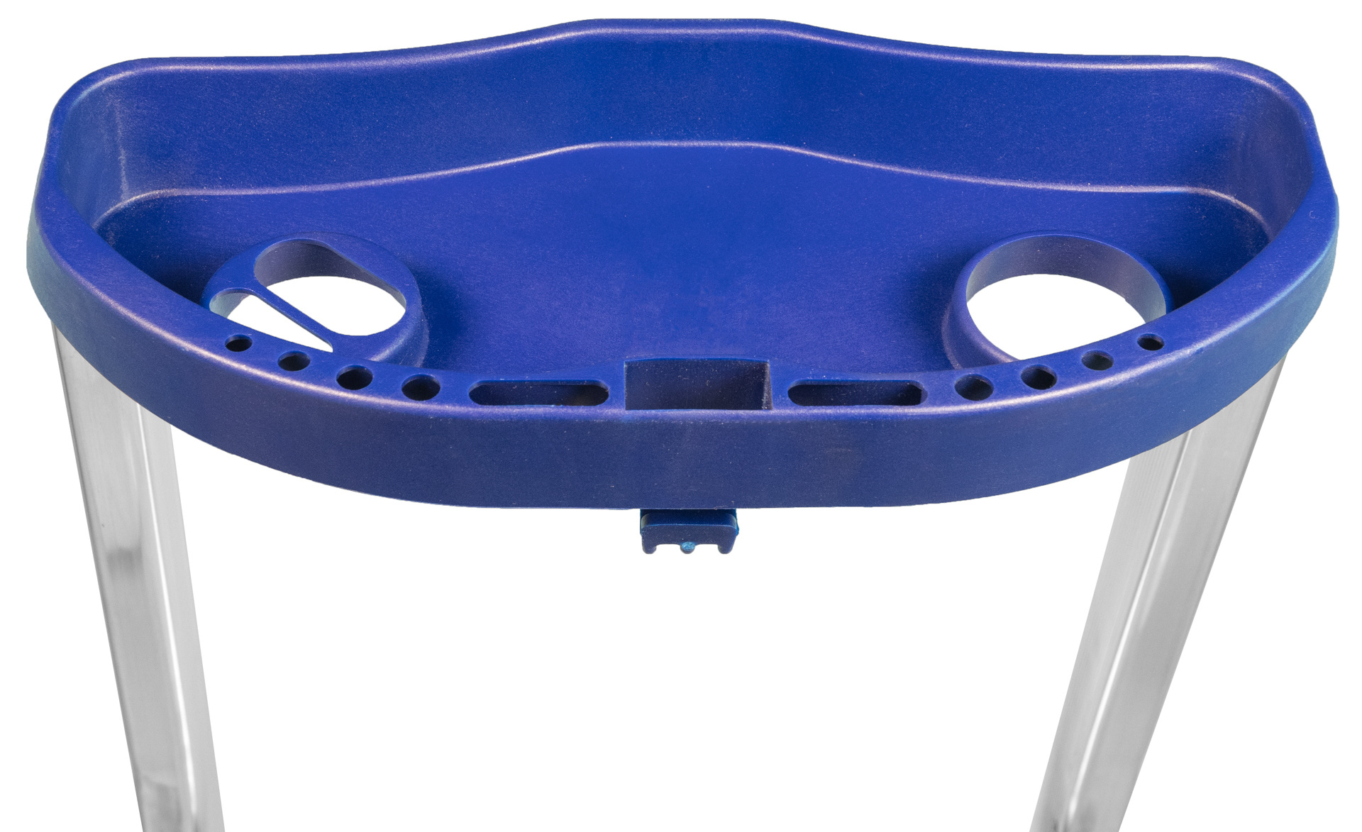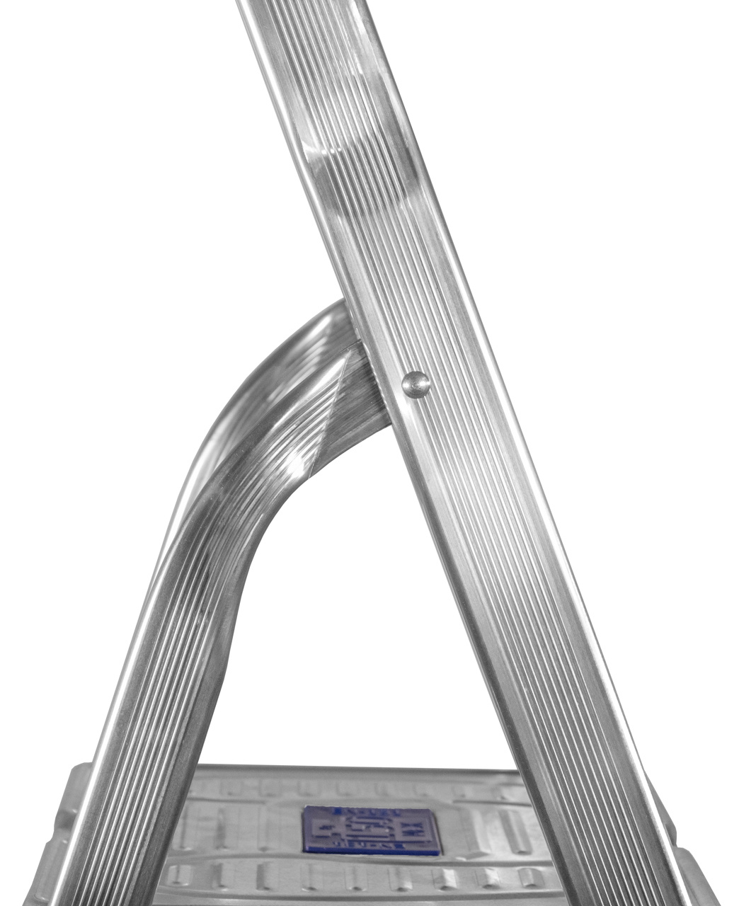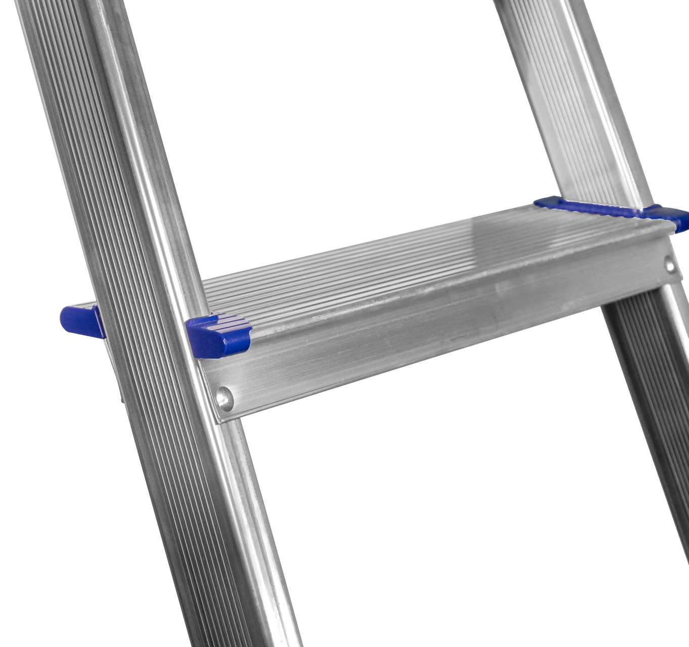 Lichtgewicht aluminium huishoud bordestrap BASIC-line met metalen bordes van ca. 26×26 cm en handige gereedschapshouder. De gereedschapshouder heeft meerdere gereedschapsgaten, een groot vak voor kleine onderdelen en een emmerhaak. De treden zijn 82 mm breed en zijn voorzien van popnagels en kunststof beschermkapjes. Het aantal treden is inclusief bordes (zie afbeelding van ME5 met type-aanduiding).
