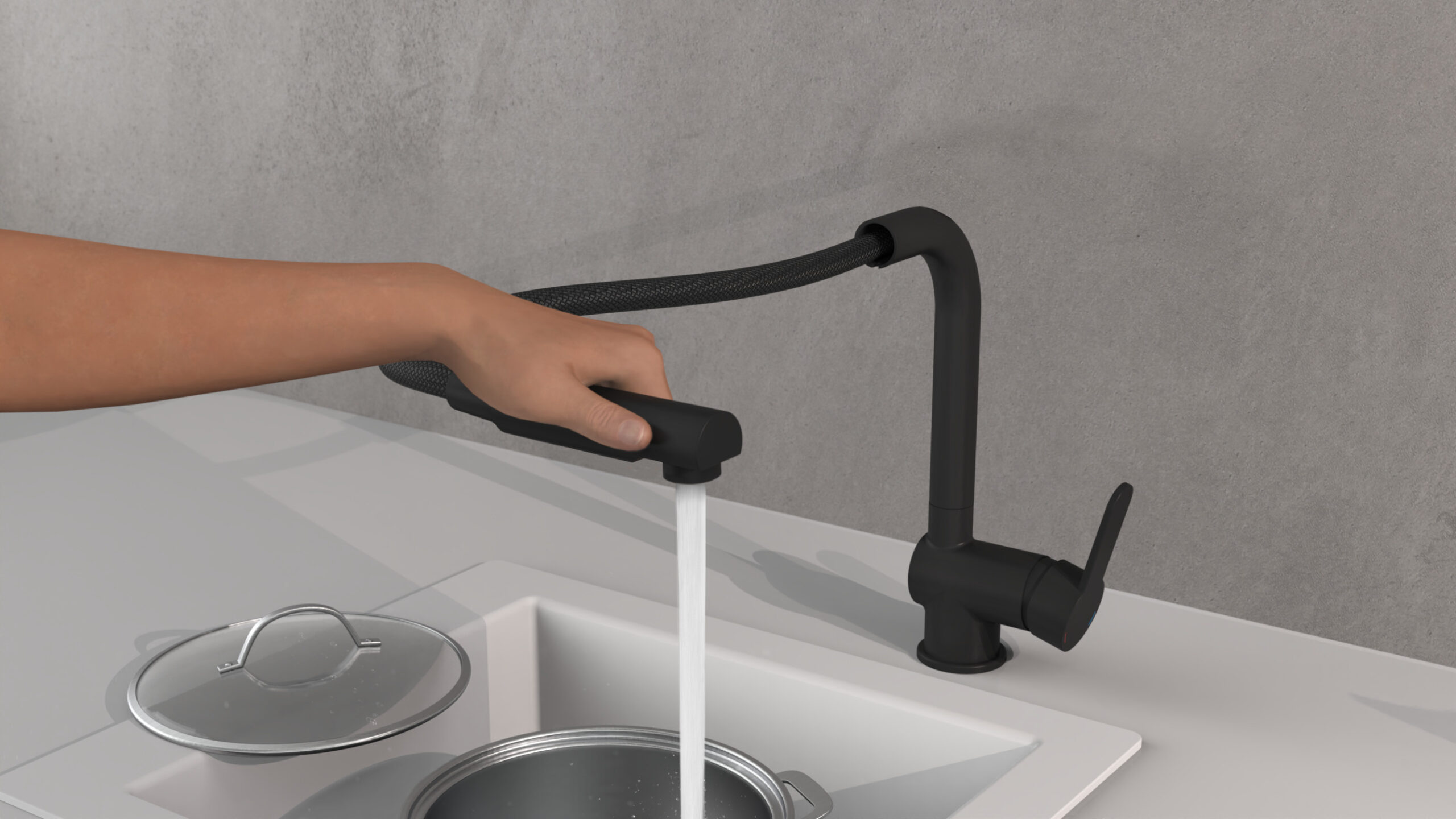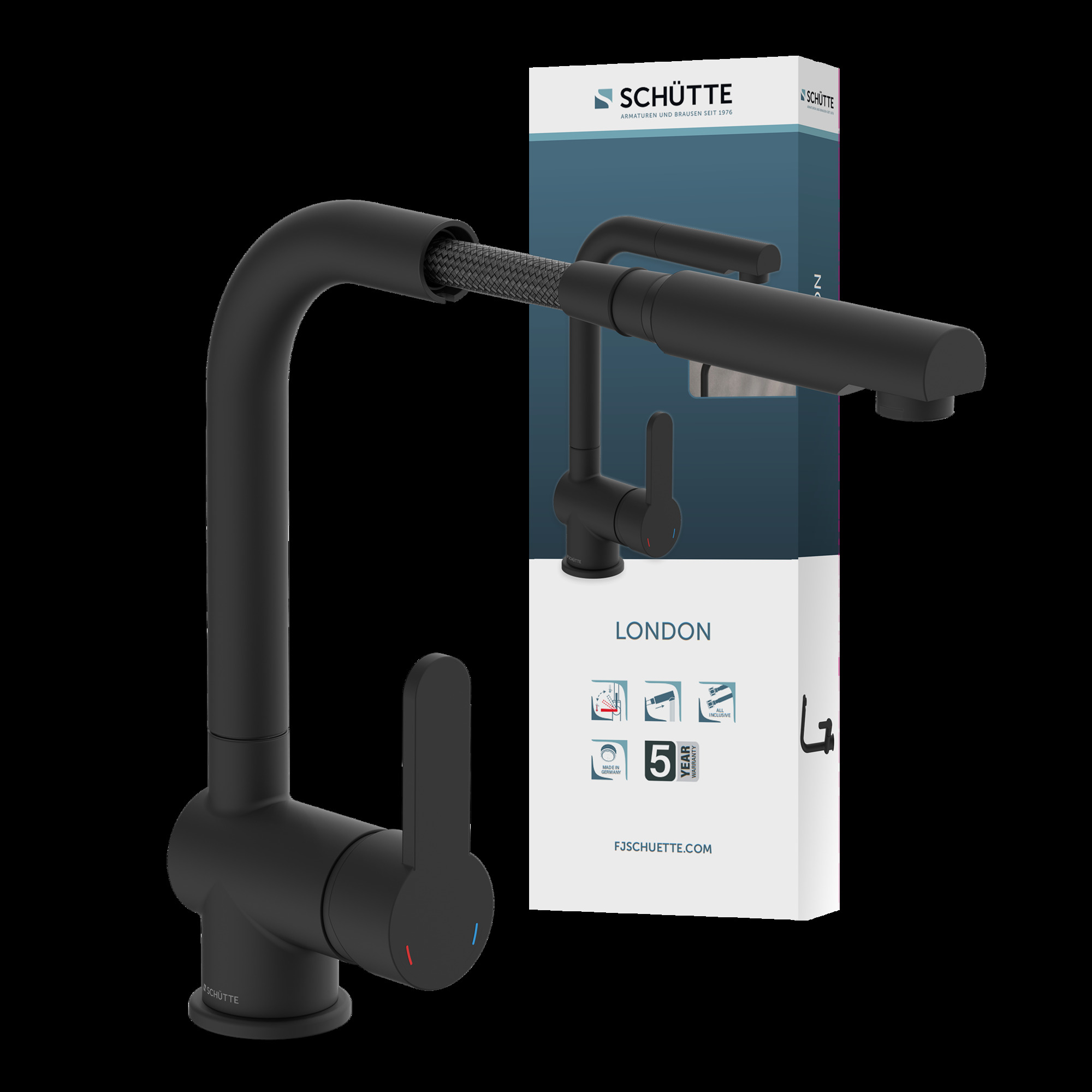 LONDON Keukenkraan, mat zwart, met uittrekbare uitloop • praktische cold-start functie om energie te besparen • 360° draaibare uitloop • uittrekbare uitloop • doucheslang, ca. 150 cm • geluidsarme, uitwisselbare 40 mm keramische cartridge • merk straalregelaar voor een perfect straalbeeld • extra eenvoudige montage door centrale bevestigingsmoer • flexibele aansluitslangen ca. 600 mm • Garantie: 5 jaar
