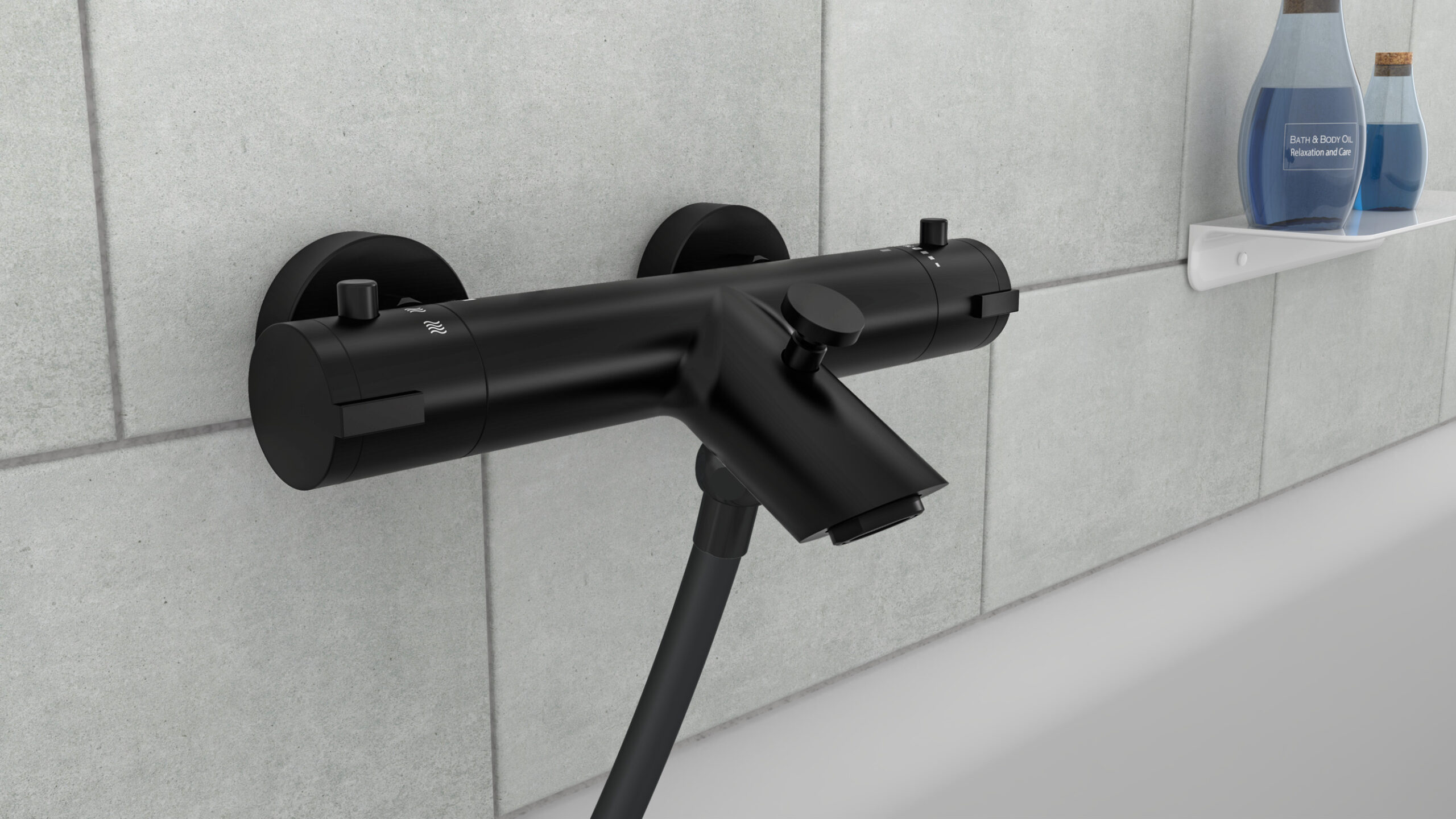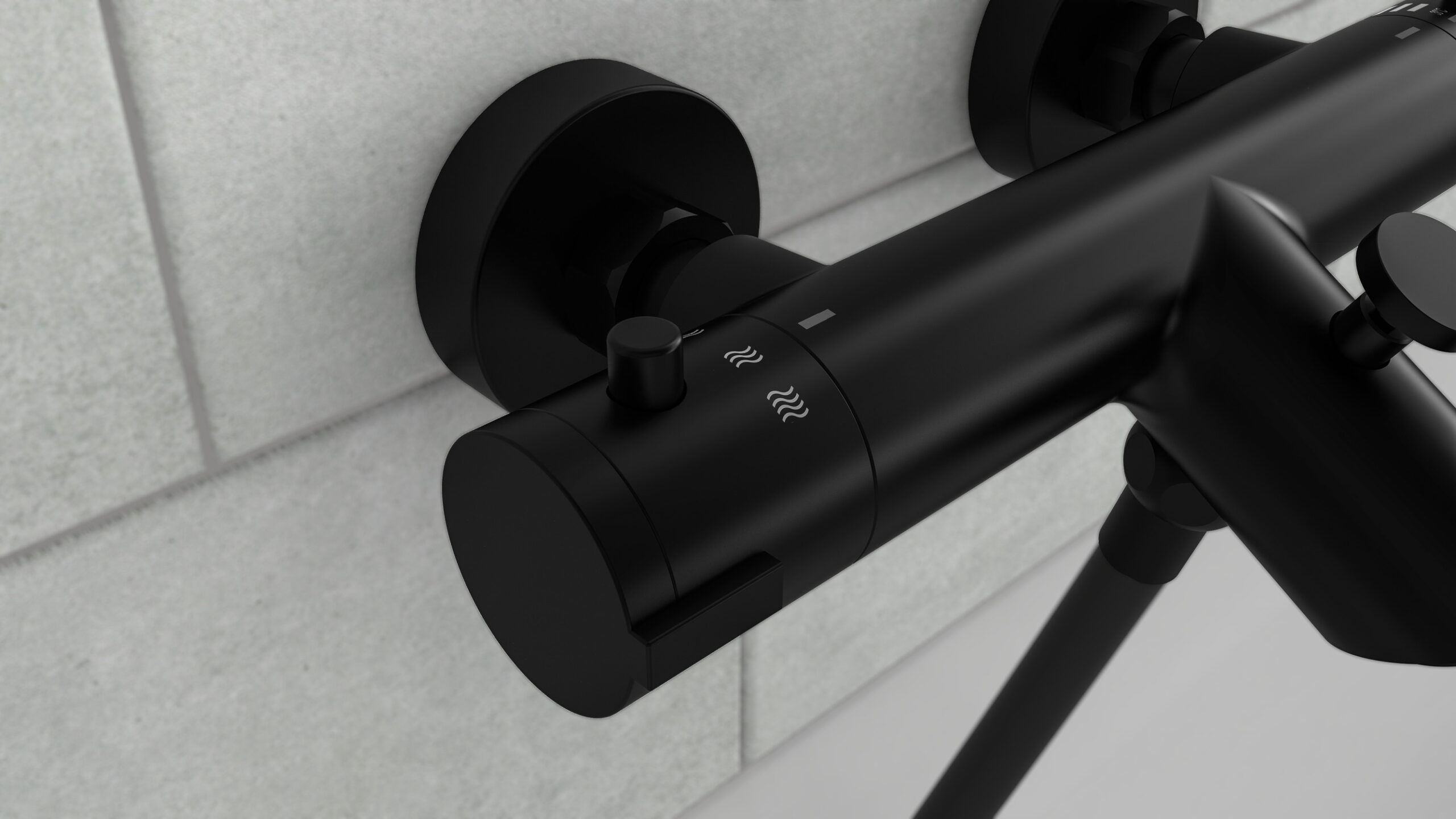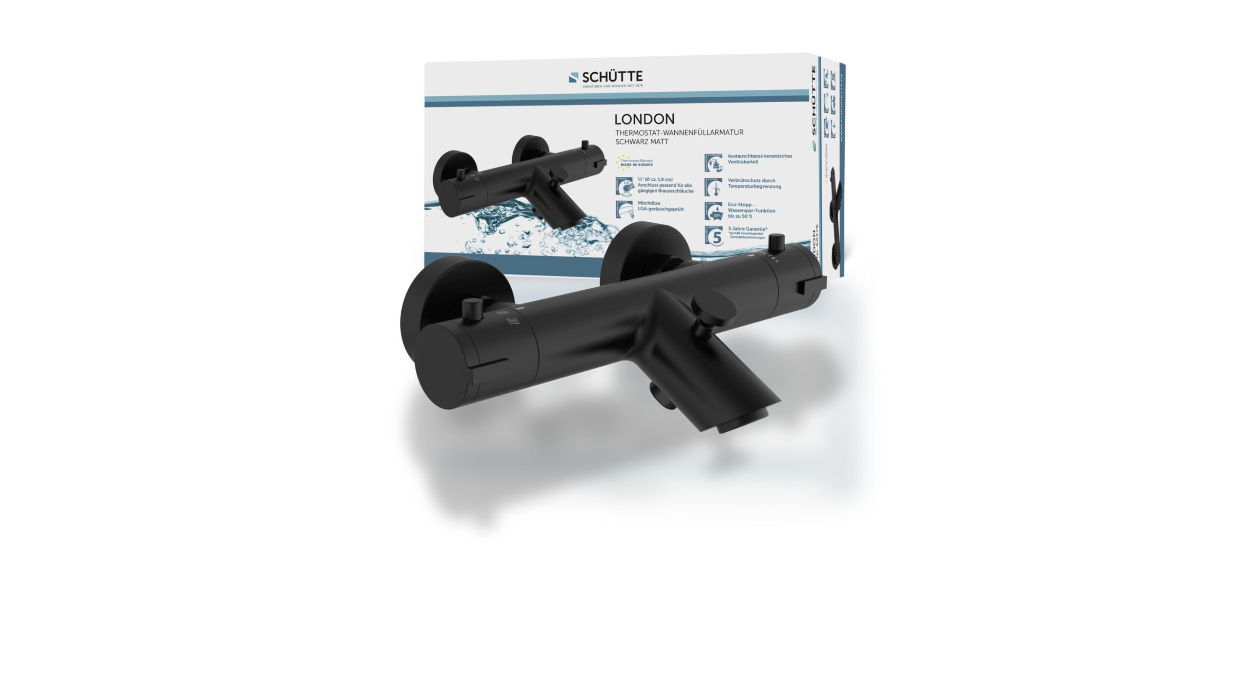 LONDON Thermostatische badkraan, mat zwart • thermostatisch element „Made in Europe“ • eco-stop functie — tot wel 50% water besparend • temperatuurschaal met veiligheidsstop op 38 °C • uitsteeksel ca. 165 mm • ½” (Ø ca. 1,9 cm) verbinding voor doucheslang • ½” (Ø ca. 1,9 cm) keramisch ventiel bovenstuk • uitwisselbaar thermostatisch element • merkstraalregelaar voor een perfect spuitpatroon • met montagemateriaal • Garantie: 5 jaar