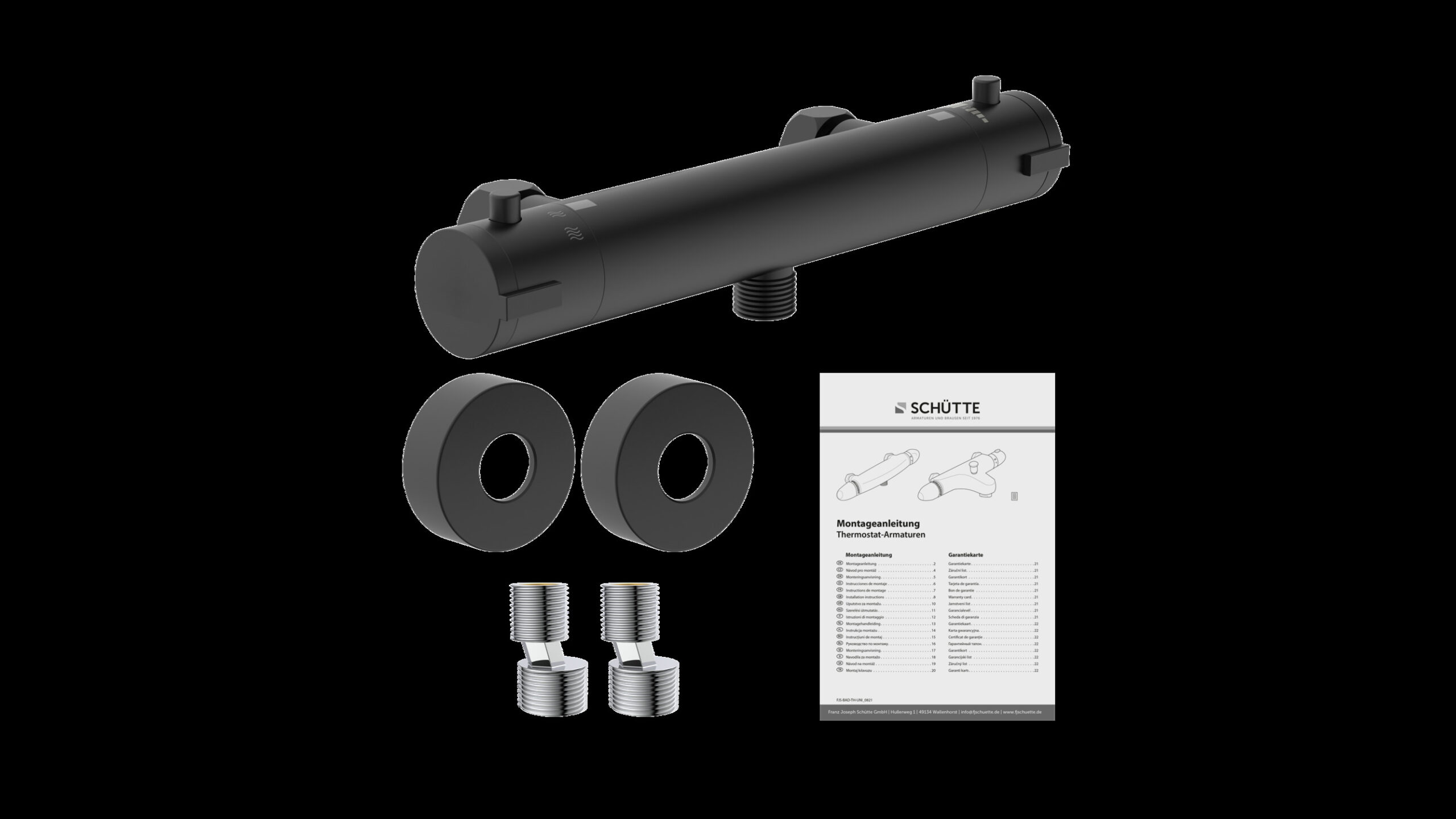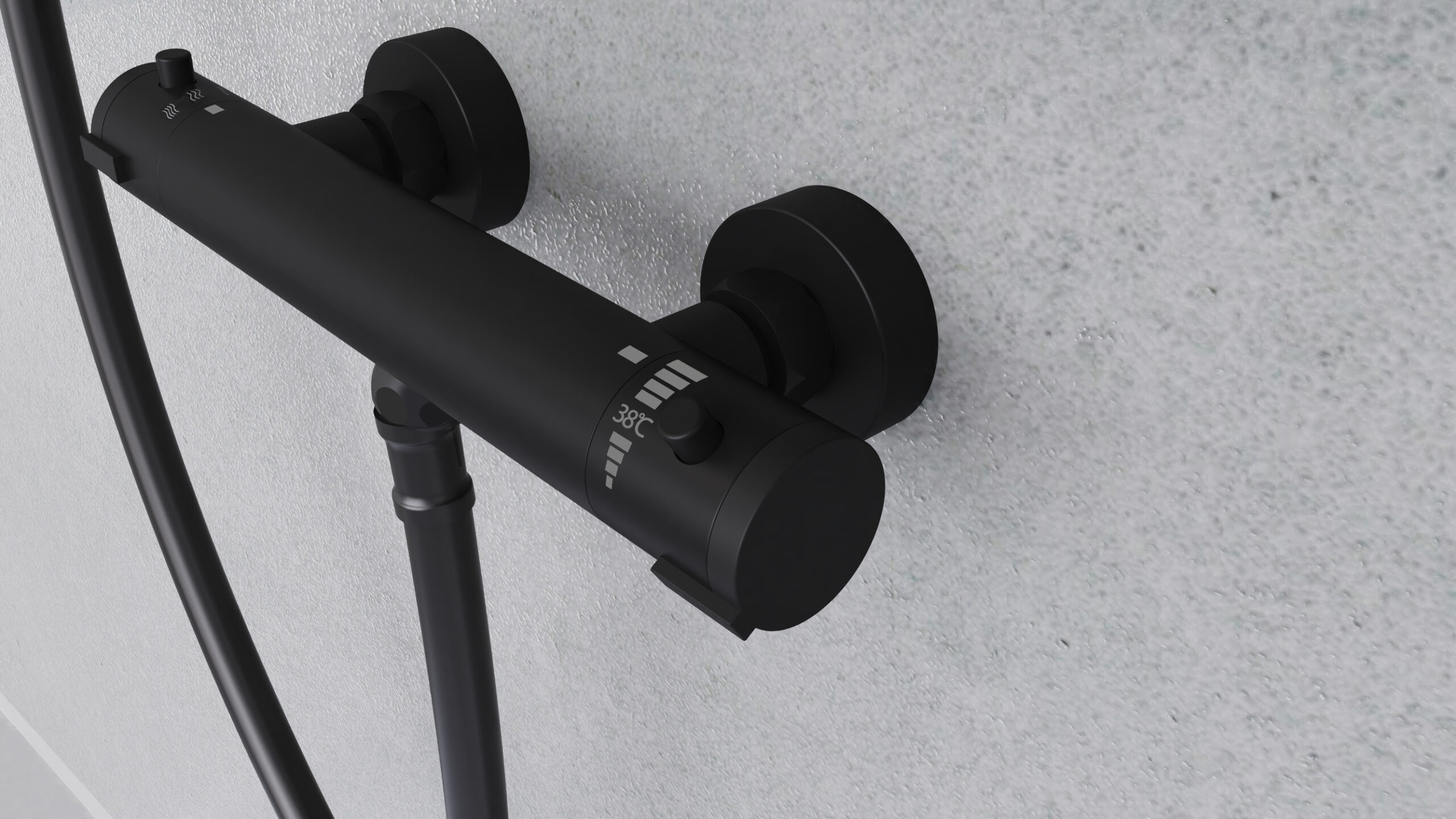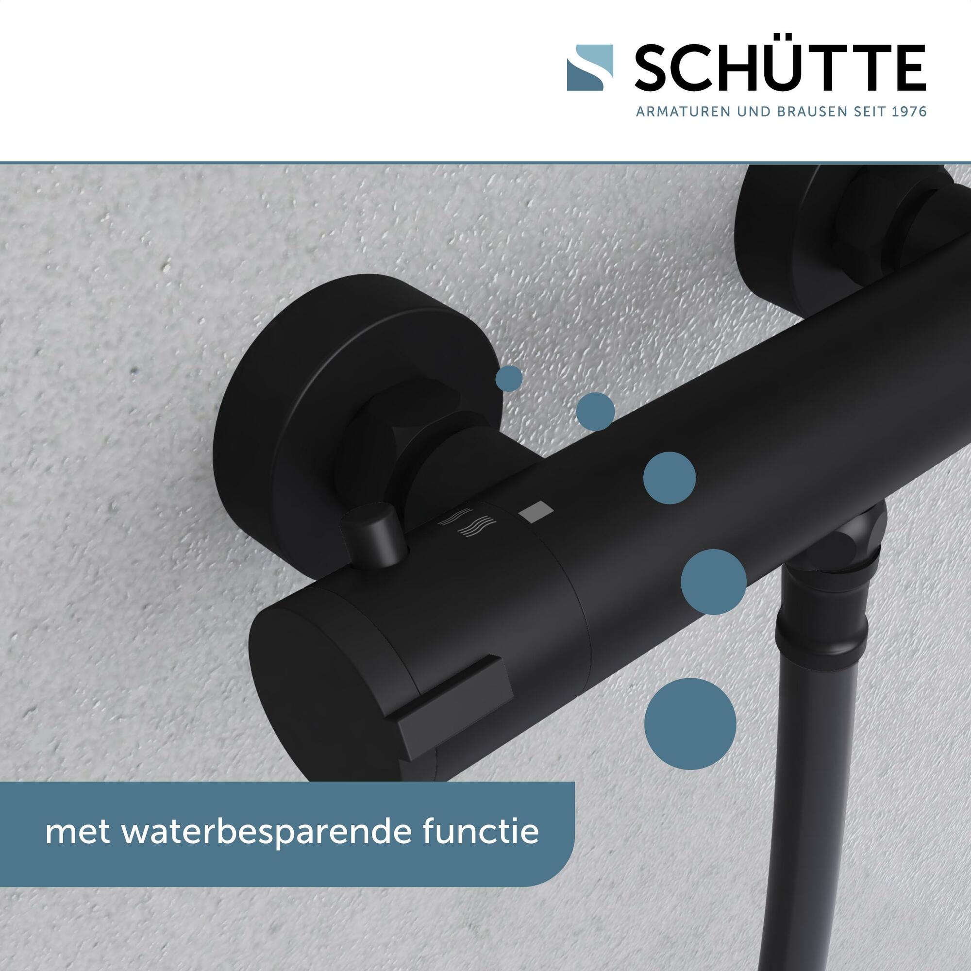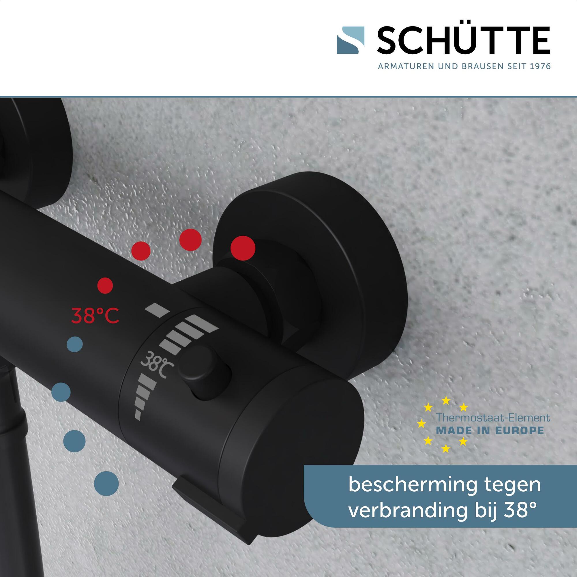 LONDON Thermostatische douchekraan, mat zwart • thermostatisch element „Made in Europe“ • eco-stop functie — tot wel 50% water besparend • temperatuurschaal met veiligheidsstop op 38 °C • ½” (Ø ca. 1,9 cm) verbinding voor doucheslang • ½” (Ø ca. 1,9 cm) keramisch ventiel bovenstuk • uitwisselbaar thermostatisch element • Garantie: 5 jaar
