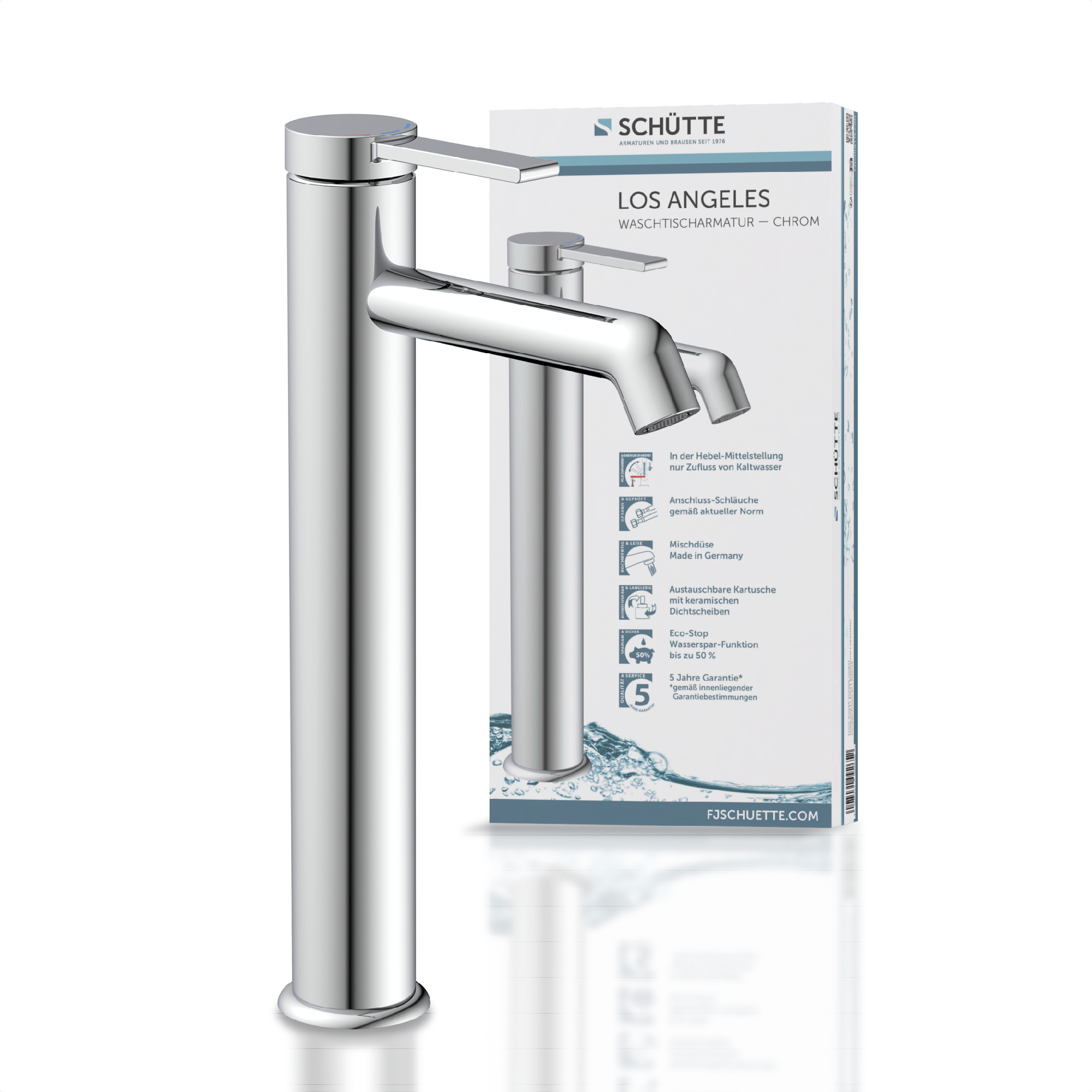 LOS ANGELES Wastafelkraan, chroom, voor opzetwastafel • eco-klik functie — tot wel 50% water besparend • praktische cold-start functie om energie te besparen • geluidarme, uitwisselbare 35 mm keramische cartridge • extra eenvoudige montage door centrale bevestigingsmoer • merkstraalregelaar voor een perfect spuitpatroon • Garantie: 5 jaar