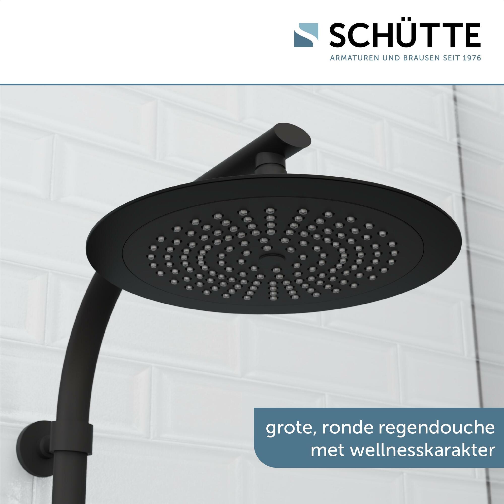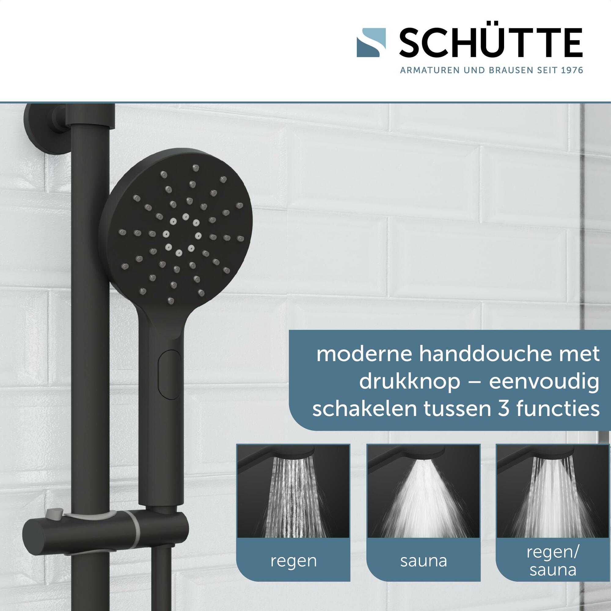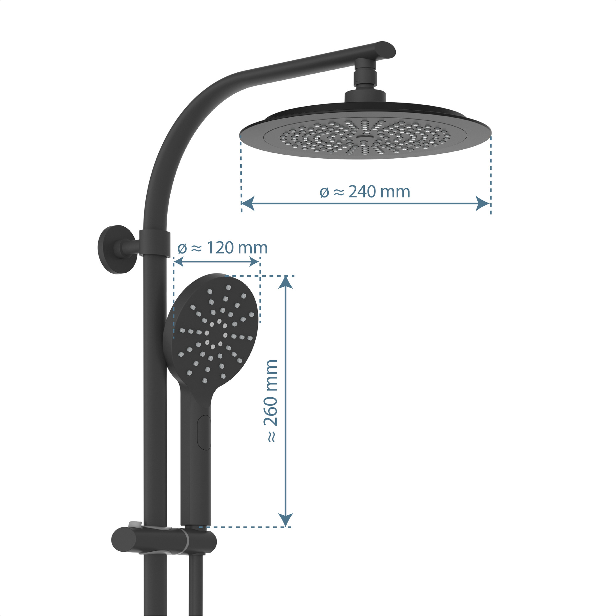 MADURA FRESH Regendouche set, mat zwart • wellness-hoofddouche • afmetingen: Ø ca. 24 cm • 3 straalsoorten • met drukknop voor het switchen van straalpatroon • antikalk nozzles • omsteller (switchen tussen hoofd- en handdouche) • uitwisselbaar thermostatisch element • Temperatuurschaal met veiligheidsslot bij 38°C • ½“ (Ø ca. 1,9 cm) keramisch ventiel bovenstuk • RVS douchestang • in hoogte verstelbare wandbevestiging • knikbestendige kunststof doucheslang in zilver look • lengte: ca. 150 cm • Bespaar tot 50% water bij gebruik van de handdouche (vergeleken met een standaard handdouche met een debiet van 16 l/min bij een debietdruk van 3 bar) • Garantie: 5 jaar