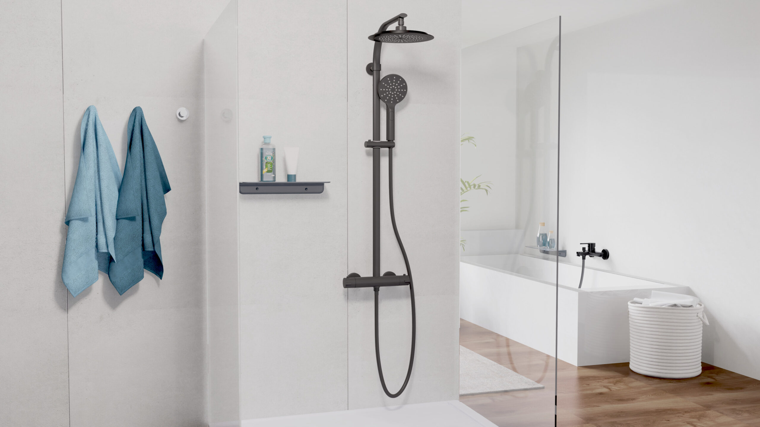 MADURA FRESH Regendouche set, mat zwart • wellness-hoofddouche • afmetingen: Ø ca. 24 cm • 3 straalsoorten • met drukknop voor het switchen van straalpatroon • antikalk nozzles • omsteller (switchen tussen hoofd- en handdouche) • uitwisselbaar thermostatisch element • Temperatuurschaal met veiligheidsslot bij 38°C • ½“ (Ø ca. 1,9 cm) keramisch ventiel bovenstuk • […]