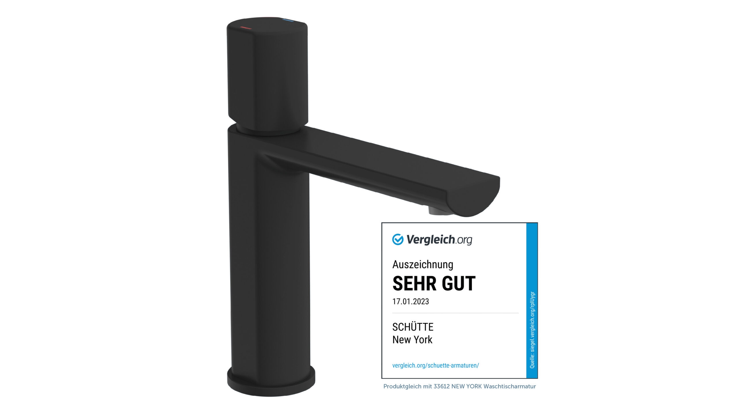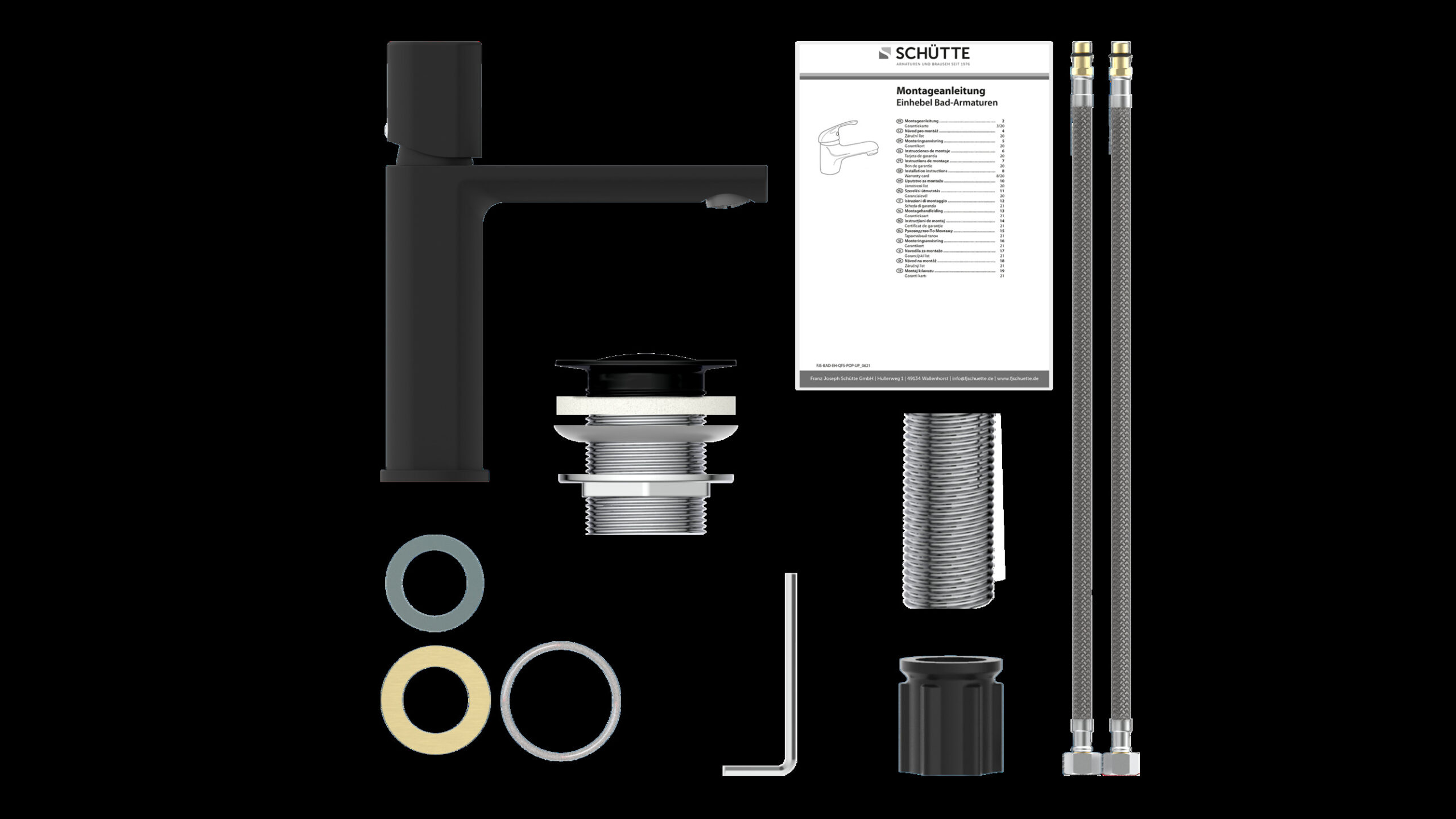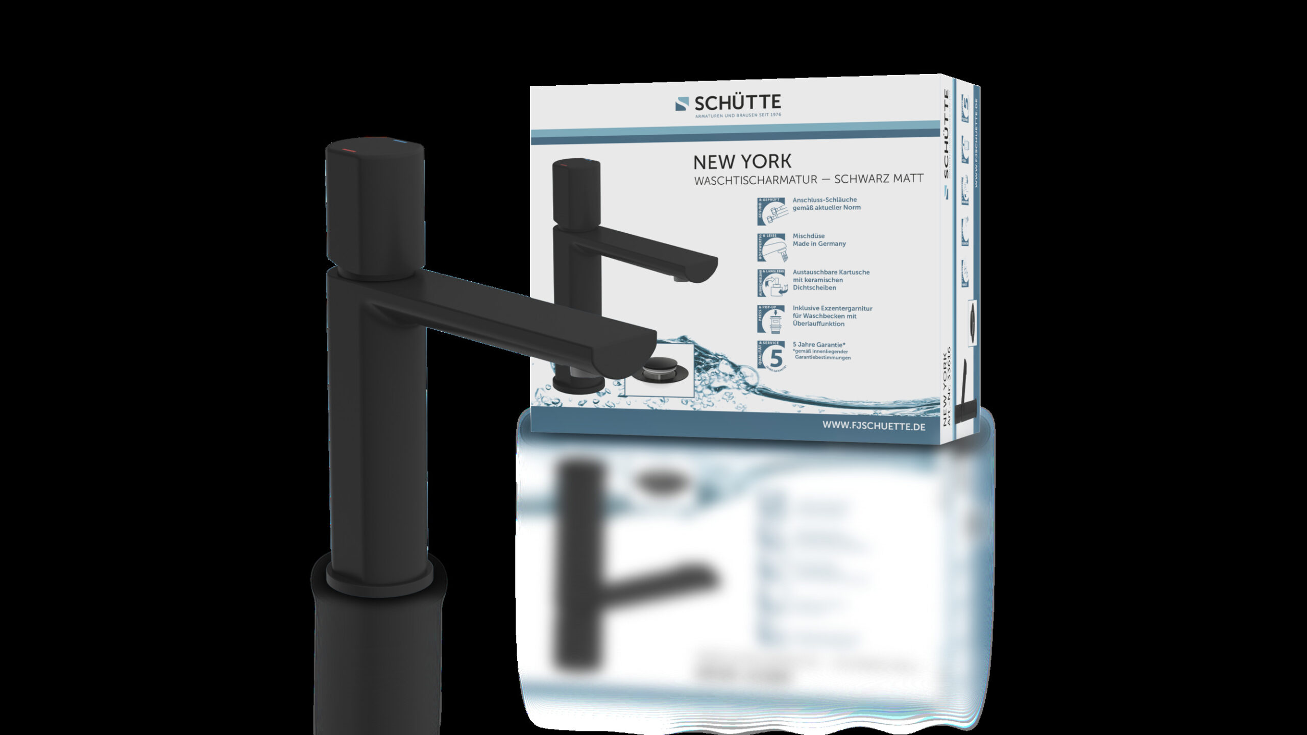 NEW YORK Wastafelkraan, mat zwart • 1 ¼” (Ø ca. 4 cm) quick-clac afvoerplug van metaal • Gat voor excentrische bediening beschikbaar • merkstraalregelaar voor een perfect spuitpatroon • geluidarme, uitwisselbare 25 mm keramische cartridge • flexibele aansluitslangen ca. 500 mm • extra eenvoudige montage door centrale bevestigingsmoer • Garantie: 5 jaar