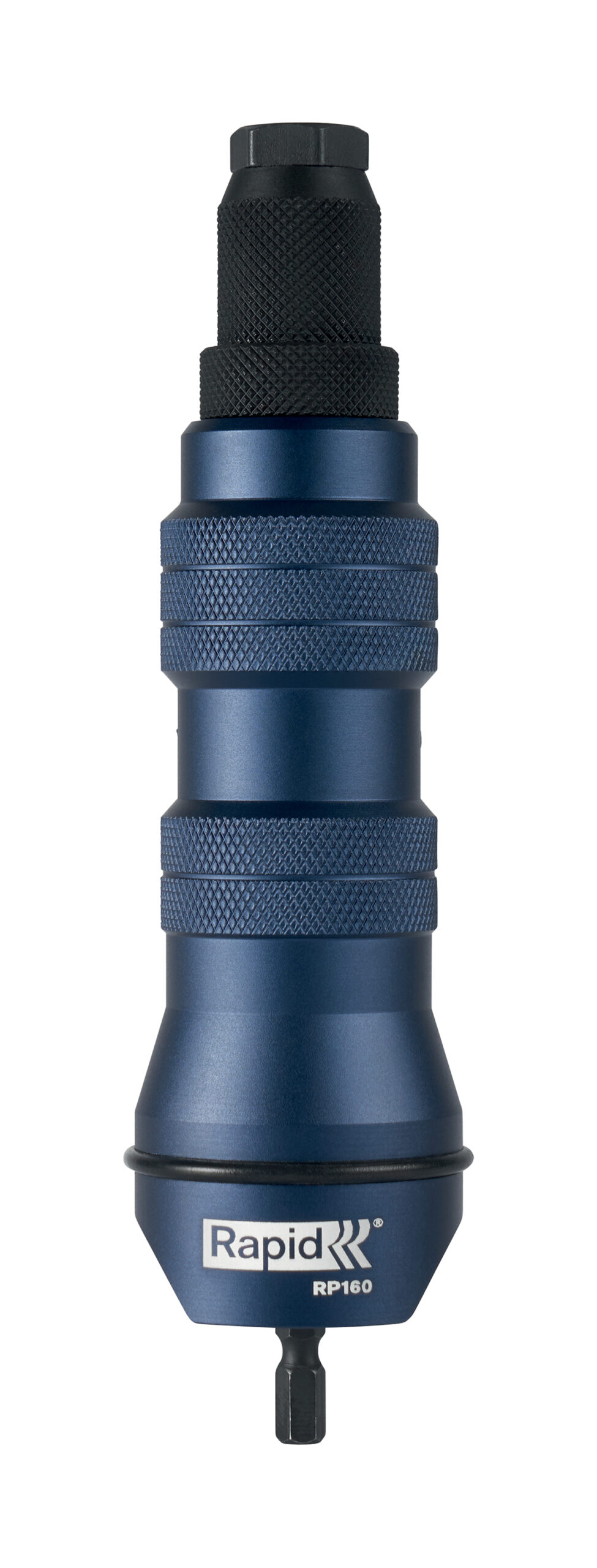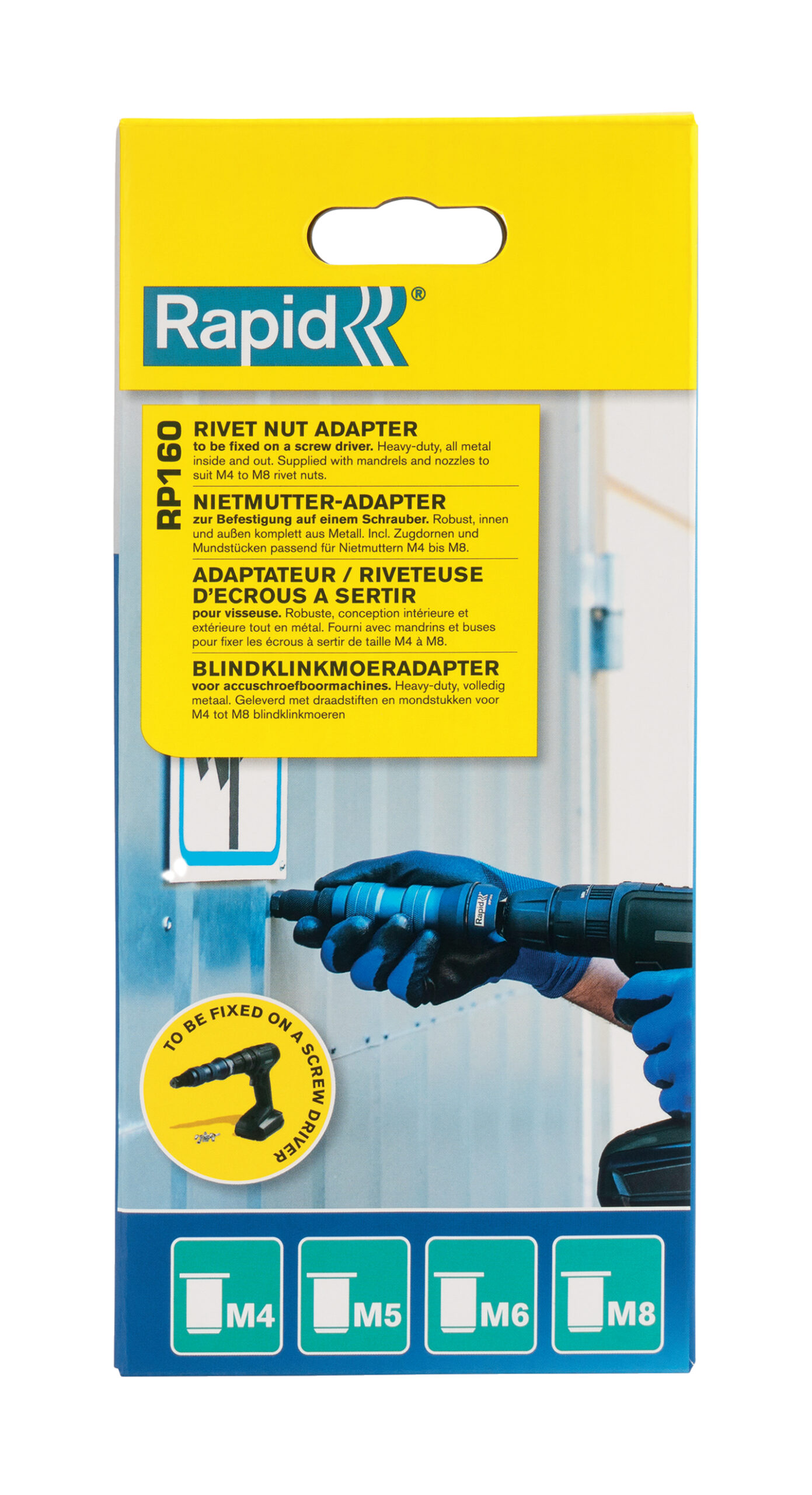 De Rapid RP160 maakt het eenvoudig om blindklinknagelmoeren te bevestigen aan plaatwerk en andere materialen, zodat je vervolgens een bout in de moer kunt draaien. Het gereedschap werkt als een adapter en wordt op een accuschroefboormachine bevestigd, op dezelfde manier als bij een normale boor of bit. De accuschroefboormachine dient een instelbaar koppel te hebben. De Rapid RP160 is vooral efficiënt voor grote klussen die veel blindklinknagelmoeren vereisen. De adapter heeft een stevige, aluminium behuizing en de grote greepgebieden maken het mogelijk om veilig en met precisie te werken. Alle mechanische onderdelen zijn gemaakt van gehard staal. Verder wordt er een steeksleutel meegeleverd voor eenvoudig onderhoud. De blindklinkmoeradapter is geschikt voor blindklinkmoeren M4, M5, M6 en M8. Inclusief draadstiften en mondstukken. Voor de beste resultaten adviseren we een 18V accuschroefboormachine te gebruiken.
