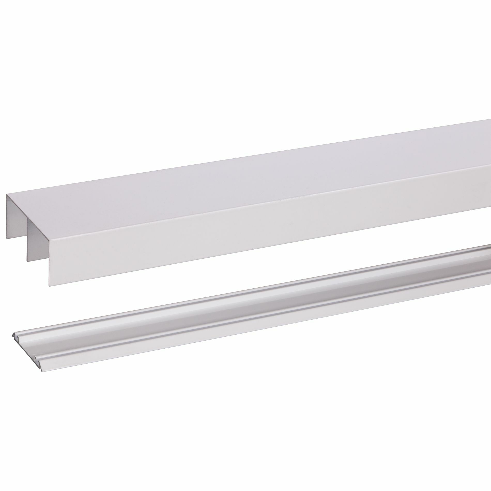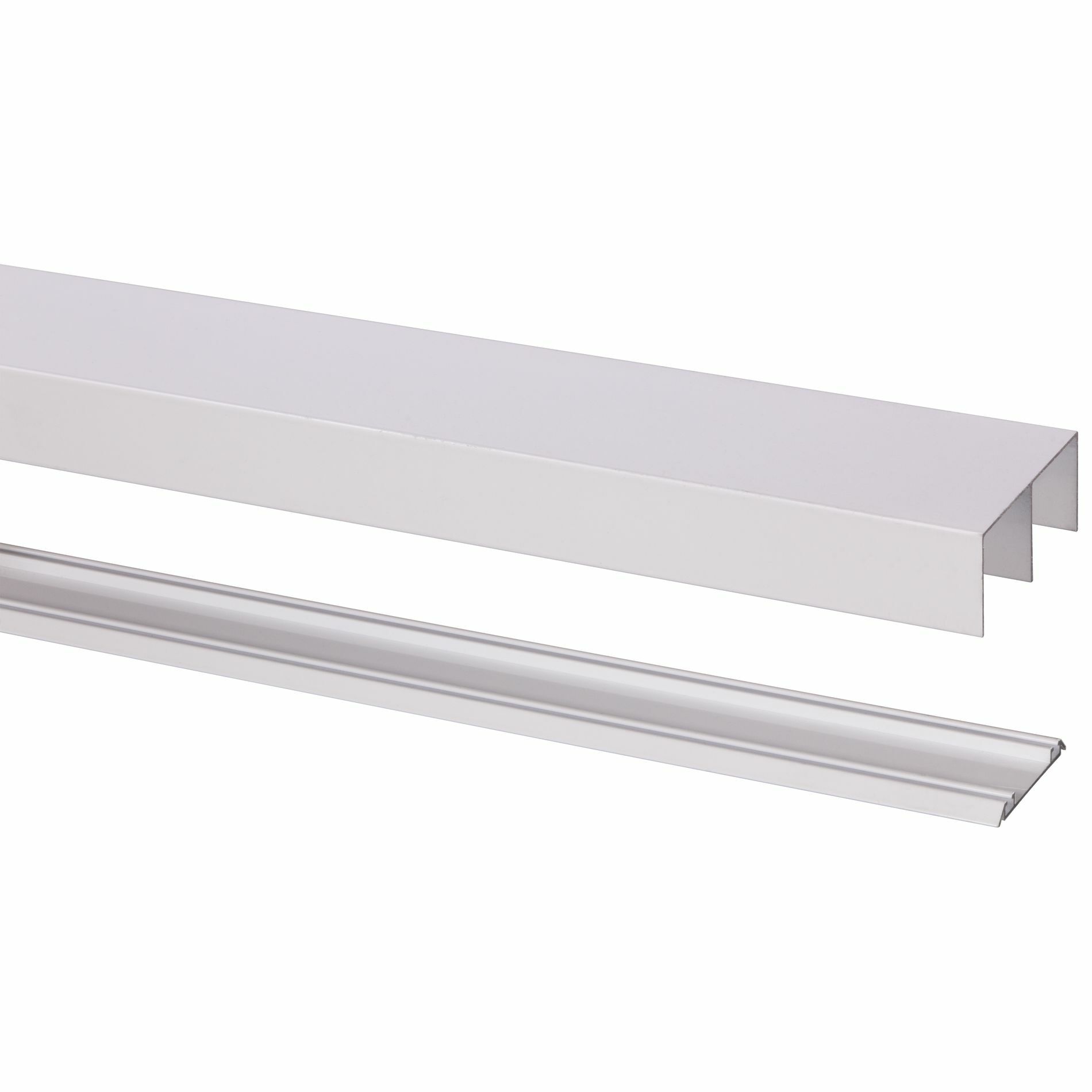 Boven- en onderrail voor het maken van je rollende schuifdeuren. Deze rail van StoreMax combineer je met StoreMax deursets R-40 of R-60. Met een lengte van 240cm is deze rail geschikt voor 3 deuren. Dit type rail is ook beschikbaar in lengte 180cm (2deuren) en 360cm (4deuren) en in de kleur aluminium i.p.v. wit. Bevestig de rail met de schuine kapclip van StoreMax bij het plaatsen van deuren onder een schuin dak.