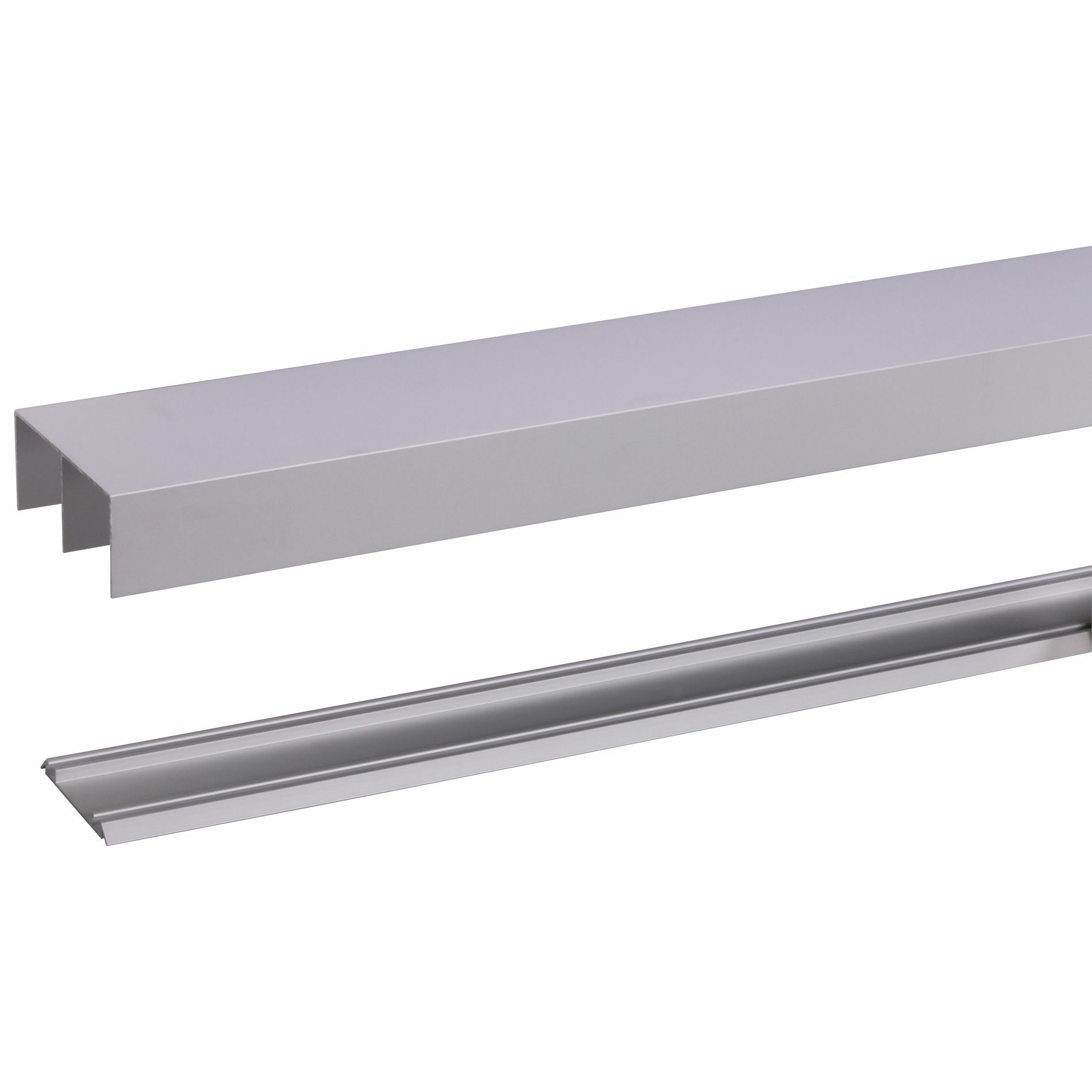 StoreMax basic railset R-40 in de kleur aluminium t.b.v wielset R-40. Voor het creëren van een bodemrollende schuifdeurkast. Van vloer tot plafond en van muur tot muur. Voordelen van dit systeem: stabiele schuifwand door onder- én bovengeleiding. Gewicht op de onderrail dus geen zware constructie aan de bovenzijde nodig. Lengte rail: 360 cm