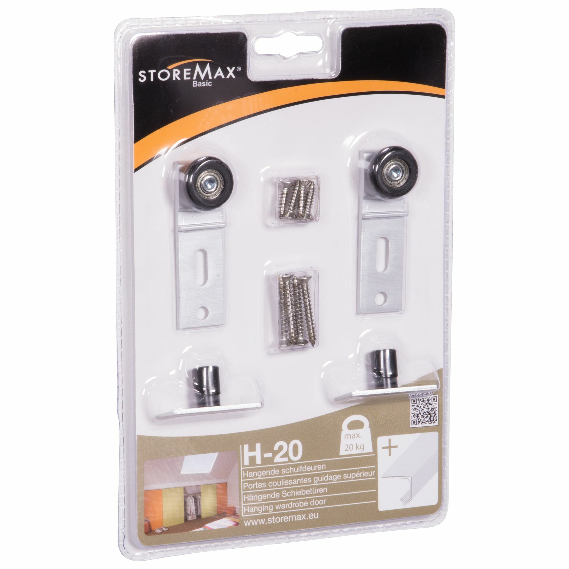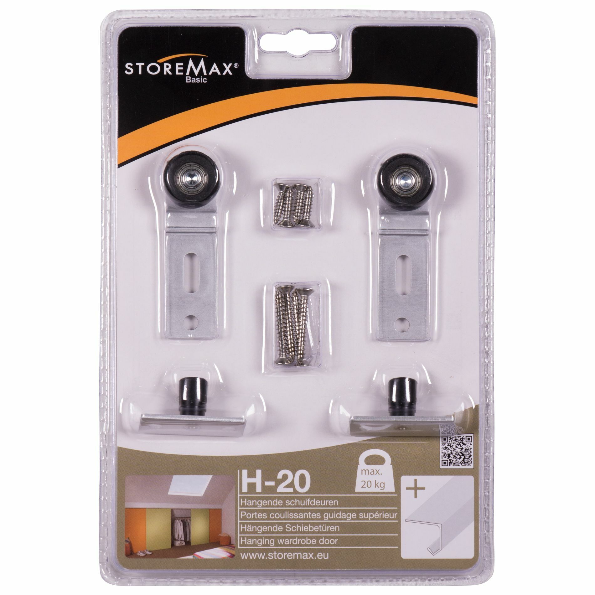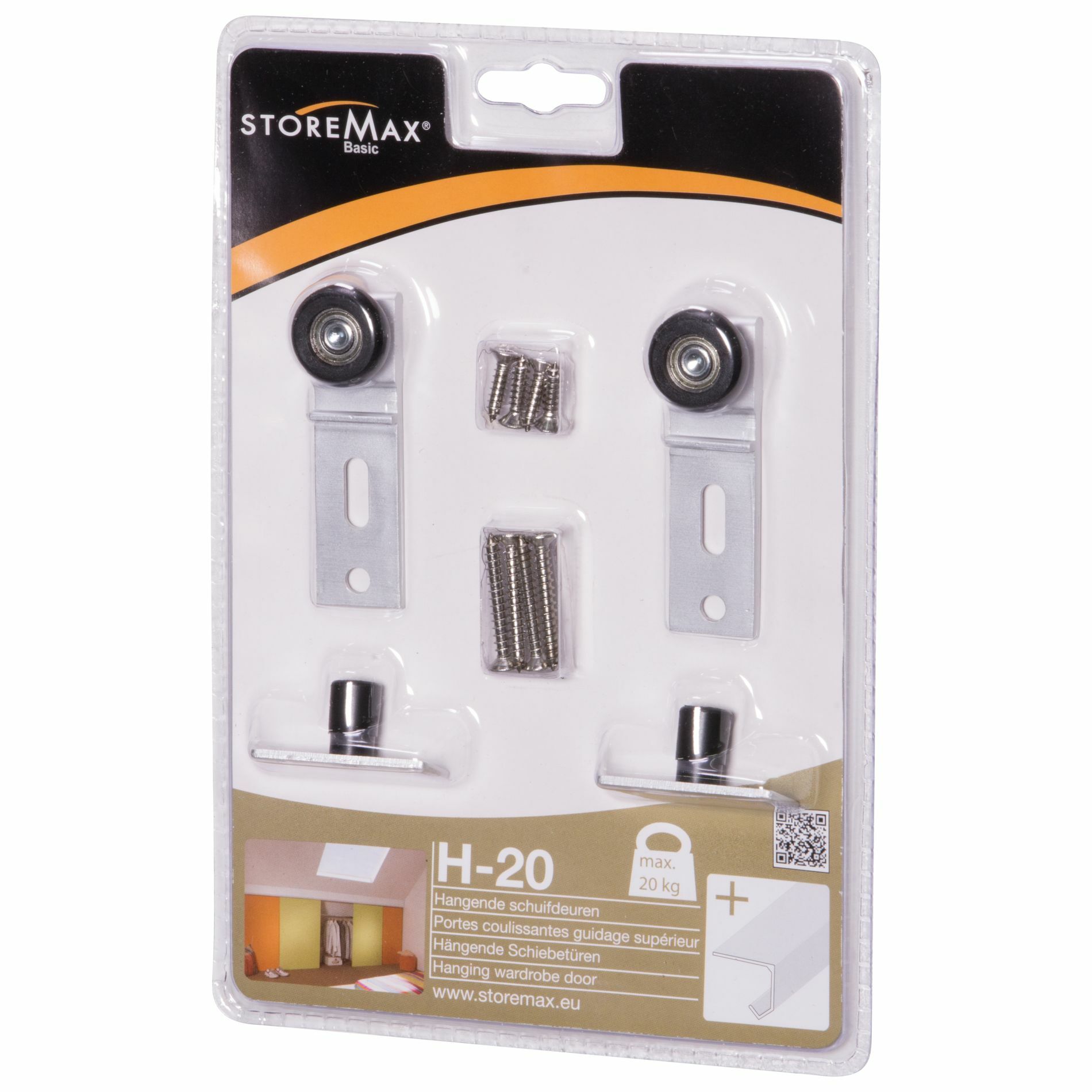 Met type H-20 van StoreMax kun je lage schuifdeuren maken voor op zolder, een werkplaats of als eenvoudig meubelstuk. Het gewicht van de deuren hangt aan de plafondrail. Op de vloer heb je geen rail, wel een aantal geleiders voor de deuren. De verpakking bevat 2 bovenwielen en 2 ondergeleiders inclusief schroeven voor bevestiging van één deur. Bijbehorende deurdikte is tussen de 12 – 38mm met een maximaal totaal gewicht van 20kg. De H-20 wielset combineer je met de rail H-20. Beschikbare railsets bij deze deur: 180 cm (2 deuren), 240 cm (3 deuren), 360 cm (4 deuren). Voor verfraaing van de deuren kun je een handgreep op de deuren schroeven. De keuze hierin vind je terug onder de accessoires van Storemax schuifdeuren.