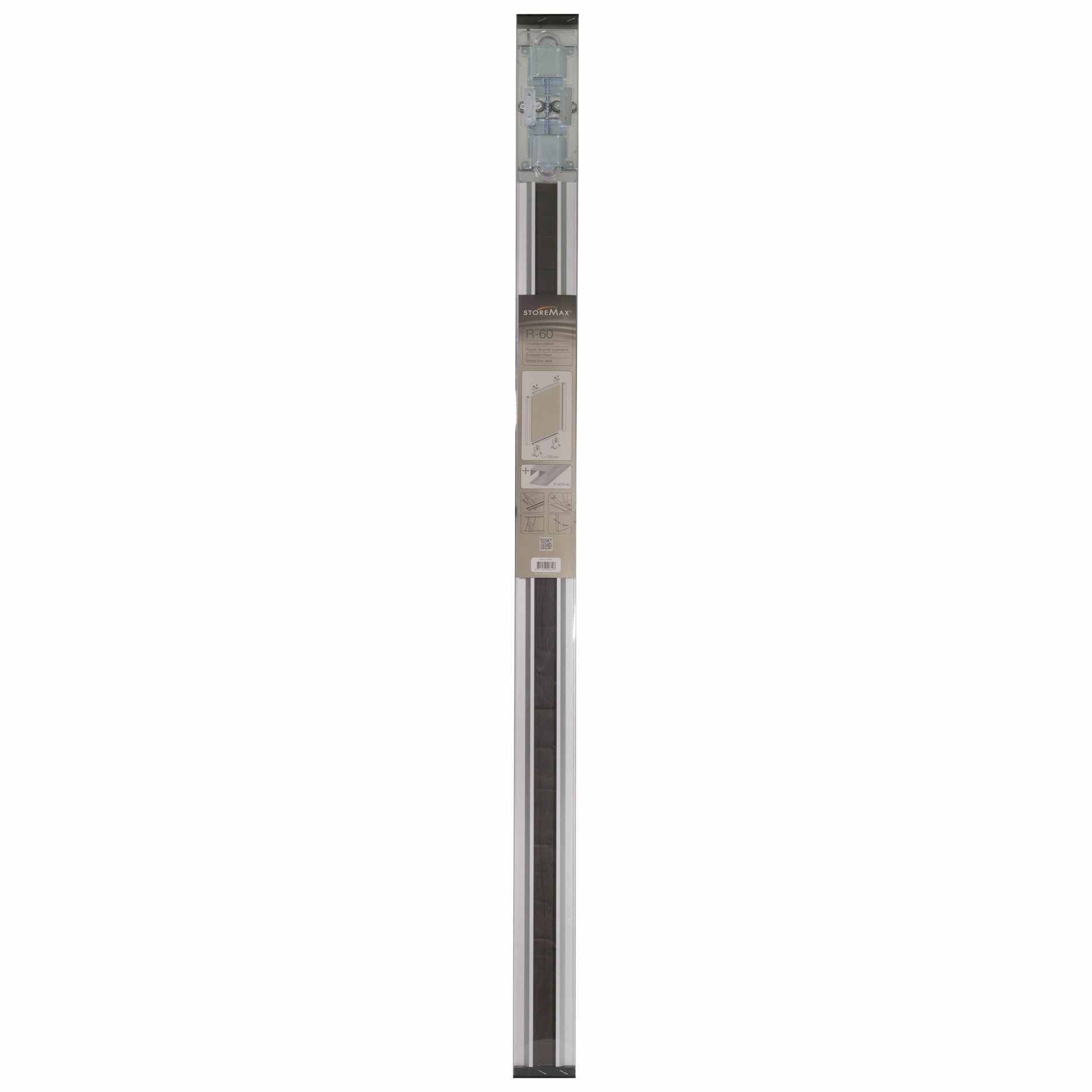 Met type R-60 125cm van StoreMax kun je lage schuifdeuren maken met strak vormgegeven aluminium omlijsting en hoogwaardige wielen. Het gewicht van de deuren rolt over de vloerrail met als voordeel dat geen zware constructie aan het plafond nodig is. De verpakking bevat 2 onderwielen en 2 bovenwielen inclusief schroeven en 4 stuks deuromlijsting voor één deur. Kies een 8mm dikke deurvulling van Storemax die perfect te combineren is in jouw unieke woonstijl. De R-60 125cm verpakking combineer je met de rail R-60. Beschikbare railsets bij deze deur: 180 cm (2 deuren), 240 cm (3 deuren), 360 cm (4 deuren) in de kleur aluminium of wit.
