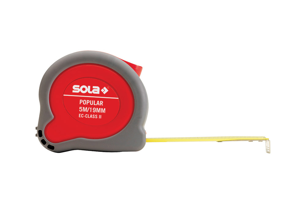 Stalen band – geel gelakt. Anti-Reflect gecoate band. Doorlopende mm maatverdeling. Automatische terugloop van de band. Tweevoudige rem met vergrendeling. Slagvaste rode behuizing met grijze softgrip bekleding. Terugloopvergrendeling. Met riemclip. Voordelen: Zelfcorrigerende eindhaak meervoudig bevestigd en versterkt. Reductie van spiegelingen op de band door Anti-Reflect coating. Schokdemper voor opvangen van de eindhaak. Afneembare riemclip (bij 5/8m)