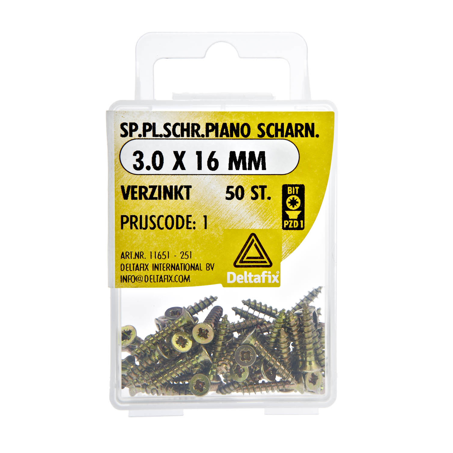 Verzinkt stalen spaanplaatschroeven met platverzonken pozidrive kop speciaal voor het bevestigen van pianoscharnieren.