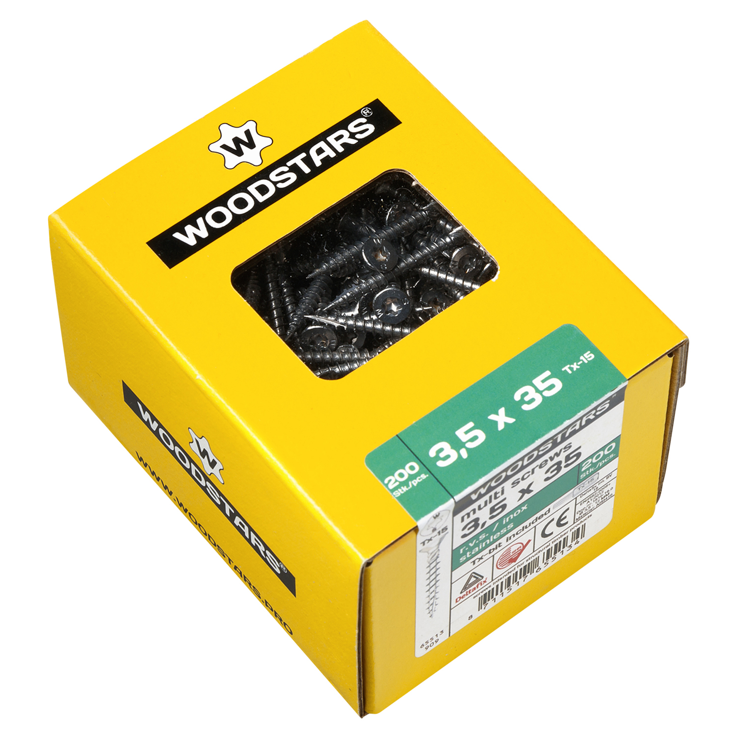 Woodstars innovatieve premium spaanplaatsschroeven zijn met jarenlange ervaring ontwikkeld. De naam Multi verdienen deze schroeven omdat ze breed inzetbaar zijn in alle houtsoorten. Woodstars RVS schroeven worden gefabriceerd uit zeer hoogwaardig roestvaststaal: aisi 410. Schroeven vervaardigd uit deze roestvaststalen soort zijn geschikt voor buitengebruik, weerbestending en vrijwel onbreekbaar. Woodstars zijn geschikt voor de industrie, vakman en professionele klusser. Door de unieke eigenschappen leveren Woodstars veel tijdwinst, gebruiksgemak en energiebesparing op.Woodstars dragen het SHR-keurmerk. SHR is het keurmerk voor de houtverwerkende industrie.Woodstars hebben een extra diepe bit indruk. Deze zorgt voor goede grip van de bit en voorkomt doordraaien. In iedere doos wordt een bit meegeleverd. Bovendien hebben de diameters 4.0, 4.5 en 5.0 millimeter dezelfde aandrijving, namelijk Torx-20. Bij gebruik van verschillende diameters doorelkaar bespaart dit veel tijd doodat er niet van bit gewisseld hoeft te worden.De zaagtanden, snijgleuf, speciale windingen, aanvangsdraad en 6 triangelvormige freesvlakken onder de kop, zorgen dat Woodstars zonder voorboren in zelfs de hardste houtsoorten kan worden toegepast.De gekartelde aanvangsschroefdraad en schachtribben zorgen voor een laag en soepel indraaimoment. De overige indraai verloopt hierdoor ook sneller. Bovendien gaat de accu van de schroefmachine langer mee.Woodstars hebben een speciale snijpunt die het materiaal doorsnijdt. Hierdoor wordt de kans op splijten sterk verminderd. Tevens zorgt deze punt voor een snelle start in het materiaal.Woodstars zijn te herkennen aan een markering in de kop van de schroef met de letters: WS.-