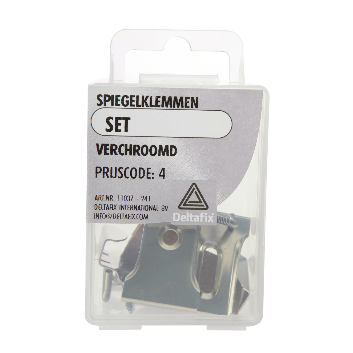 Klemmen om een spiegel in vast te zetten. U kunt kiezen tussen een verchroomde en een nagenoeg onzichtbare transparante set.