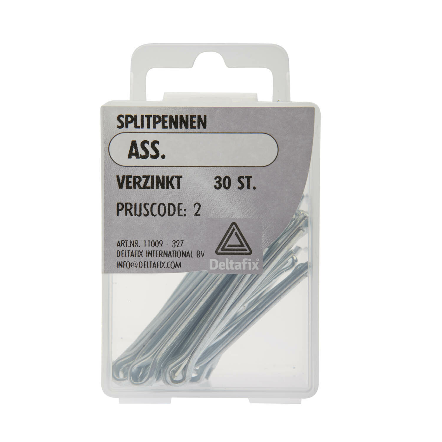 Verzinkt stalen splitpen om bijvoorbeeld twee platen aan elkaar te bevestigen. Dat doet u door de staven van de splitpen door gaten in de platen te steken en uit elkaar te buigen. Een splitpen kan ook voorkomen dat een moer van de schroefdraad loopt. Na het vastdraaien van de moer steekt u de splitpen door een gat in de bout.