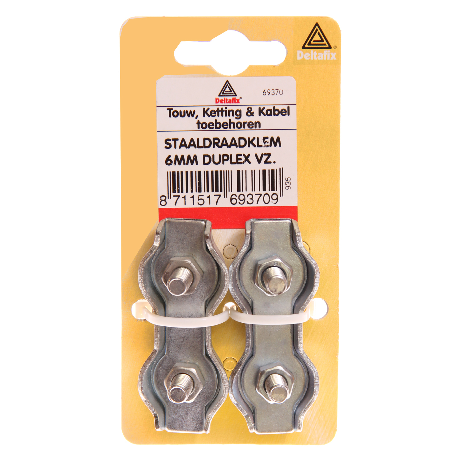 Verzinkt stalen duplex klemmen voor het maken van 2 verbindingen. Om de verbindingen te maken moet u eerst de moeren losdraaien en het afdekplaatje verwijderen. Vervolgens legt u de staalkabel in lus in de duplexklem en draait u de boutjes strak aan.