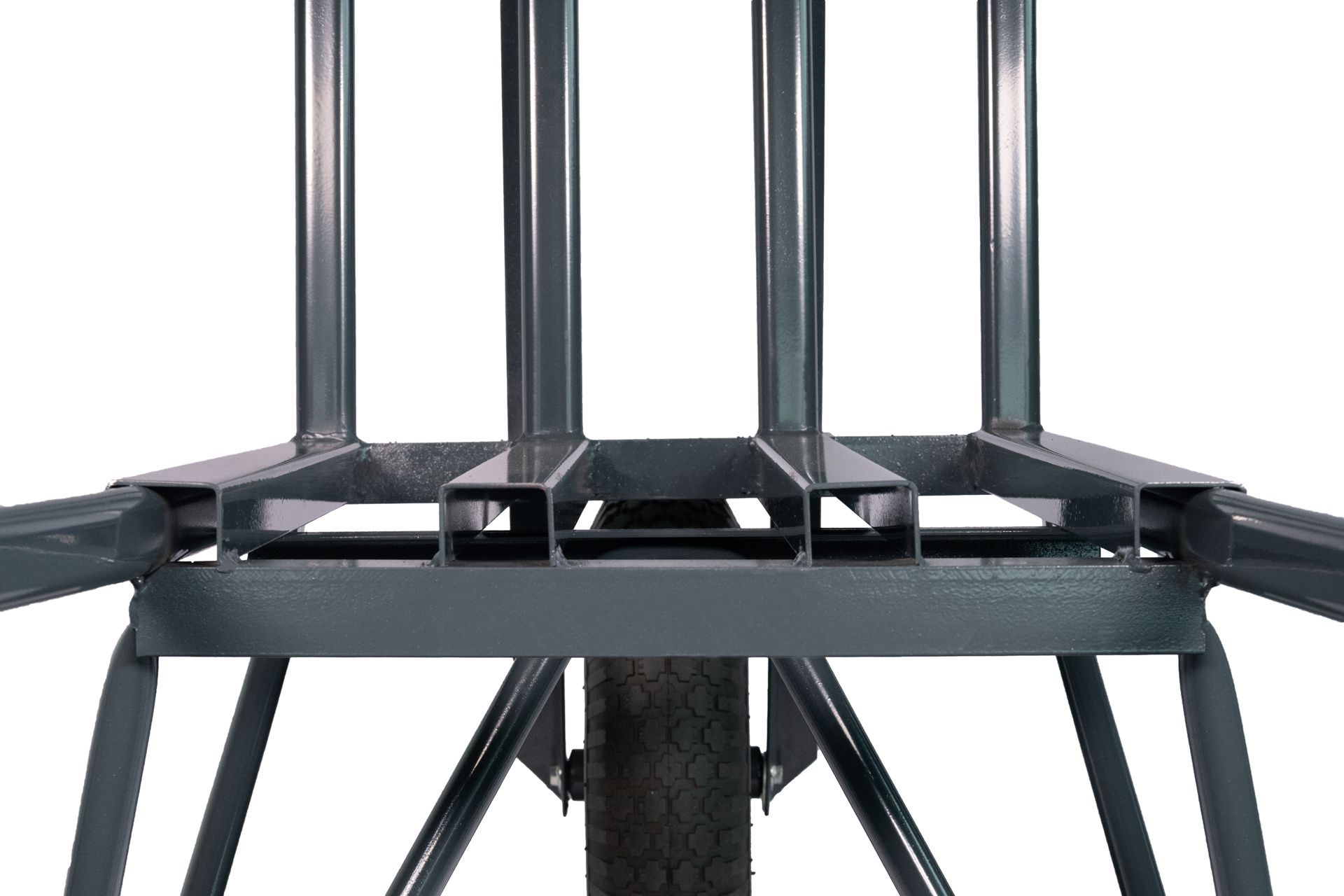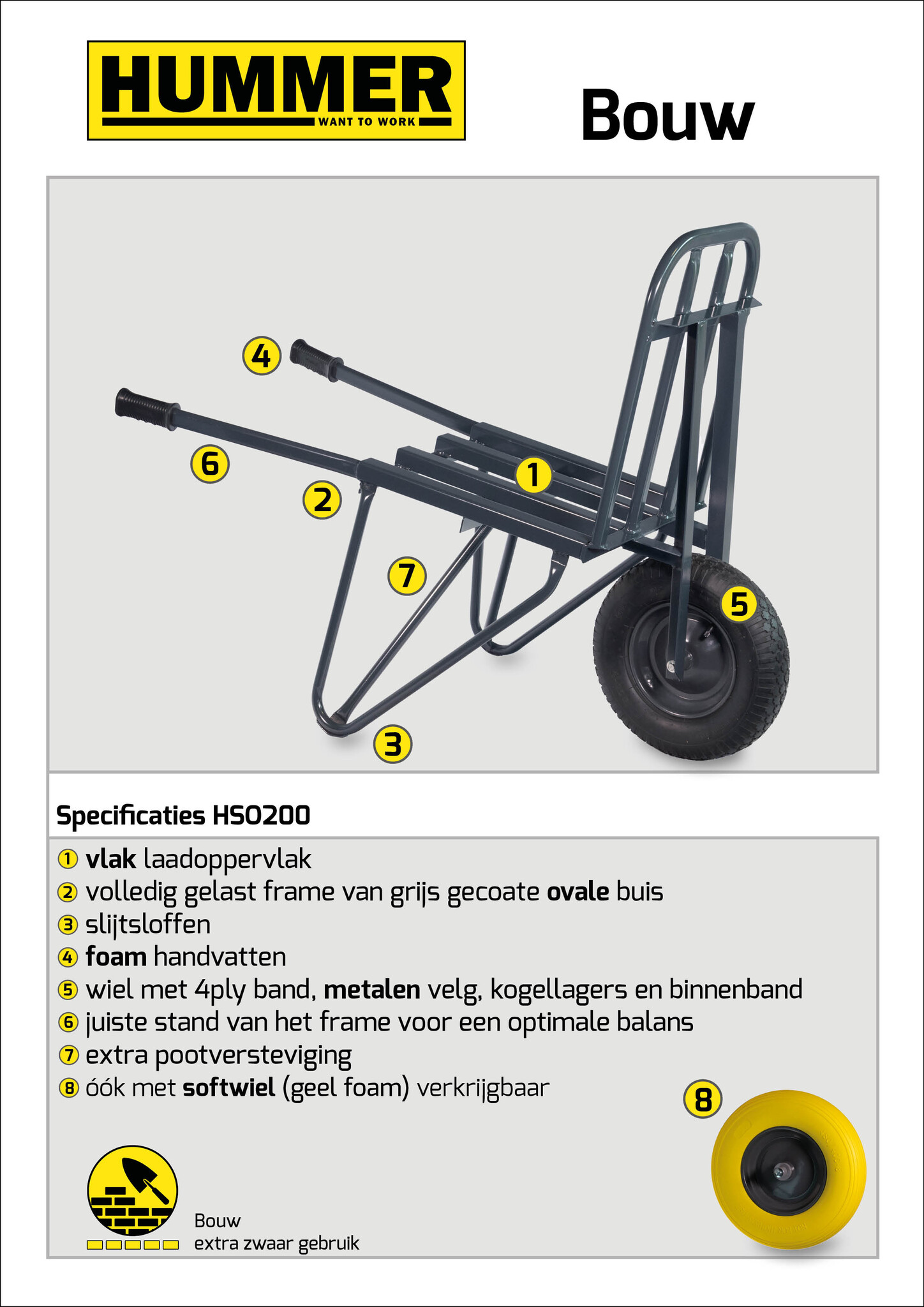 60 steens kruiwagen met vlak laadoppervlak. Volledig gelast frame van grijs gecoate ovale buis, voorzien van slijtsloffen en foamgrip handvatten. Wiel 400×8 4ply met metalen velg, naaldlager en binnenband. Kruiwagen is volledig gecoat in RAL 7016.