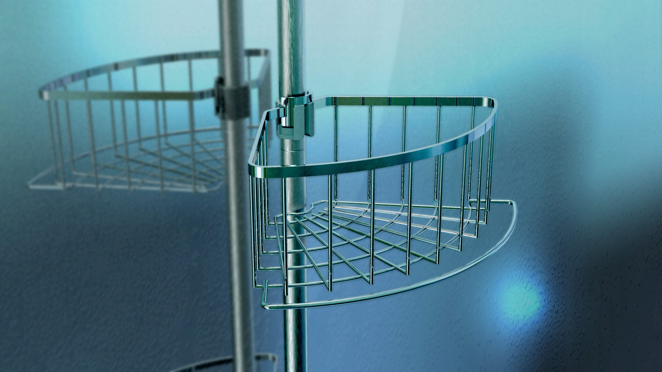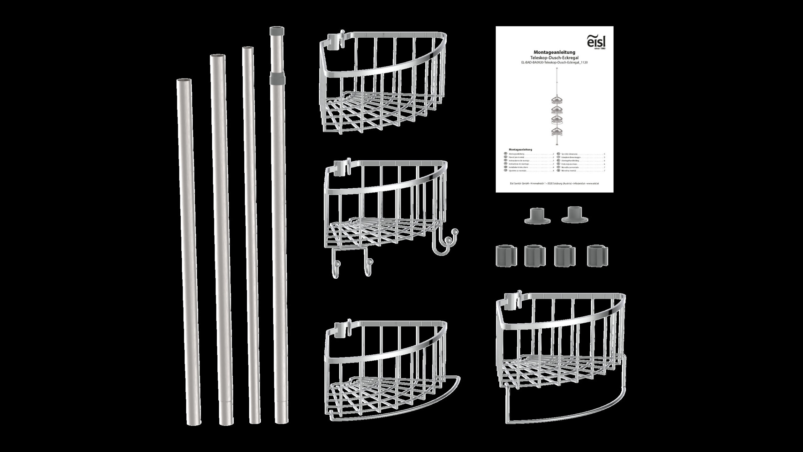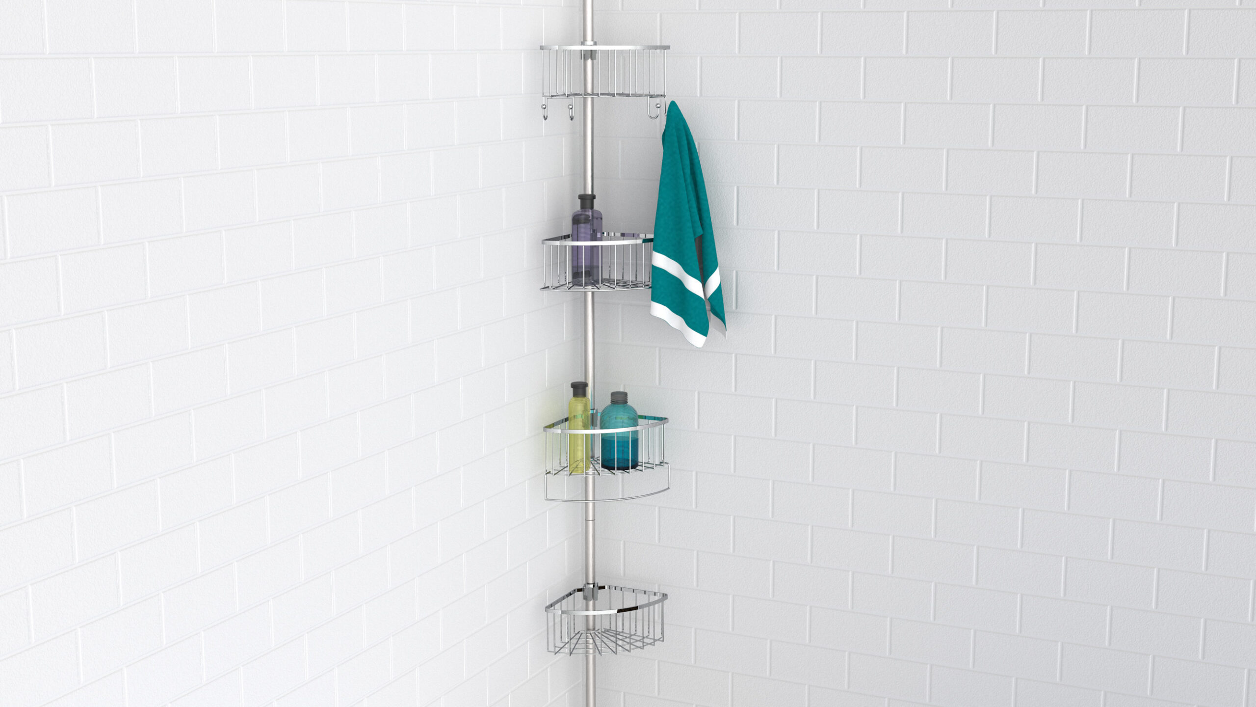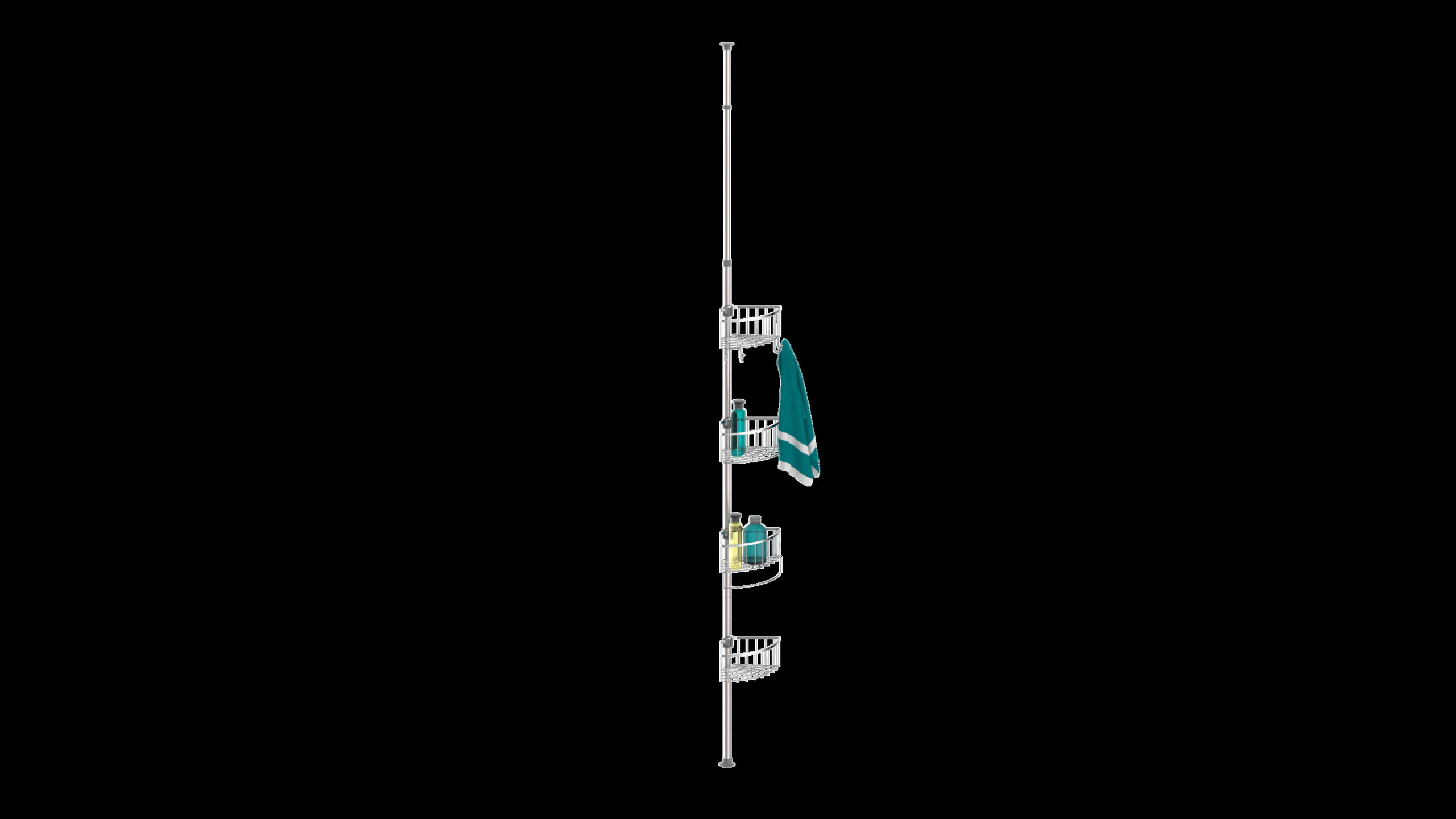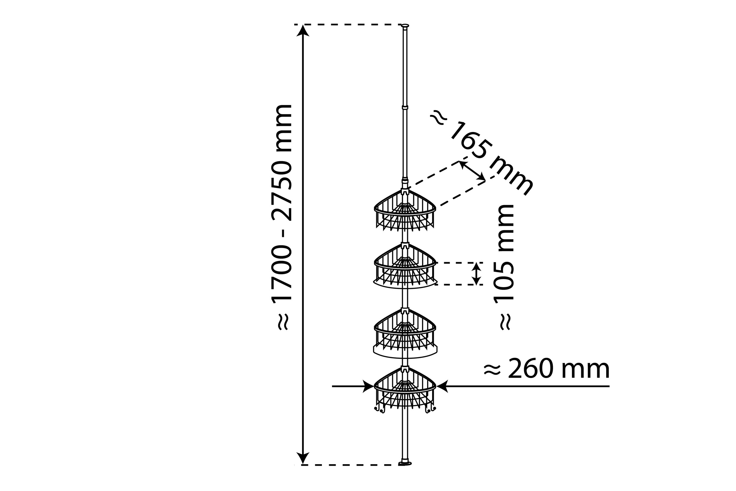 Telescopisch douche hoek rek, Roestvrij staal/chroom • in hoogte verstelbare telescoopstang ca. 1,7 – 2,76 m • 4 uitneembare hoekmanden • eenvoudige installatie door de telescopische stang tussen het plafond en de vloer te klemmen • materiaal: mat RVS, verchroomde manden • Garantie: 2 jaar