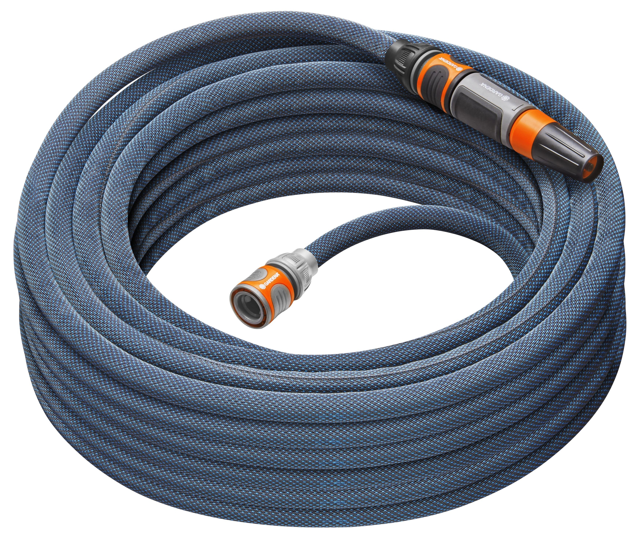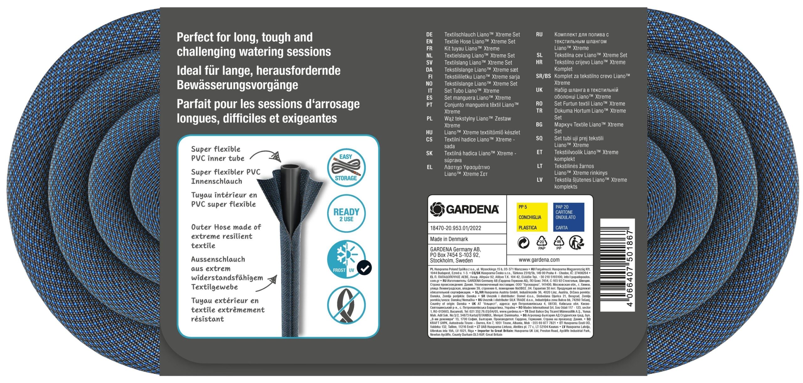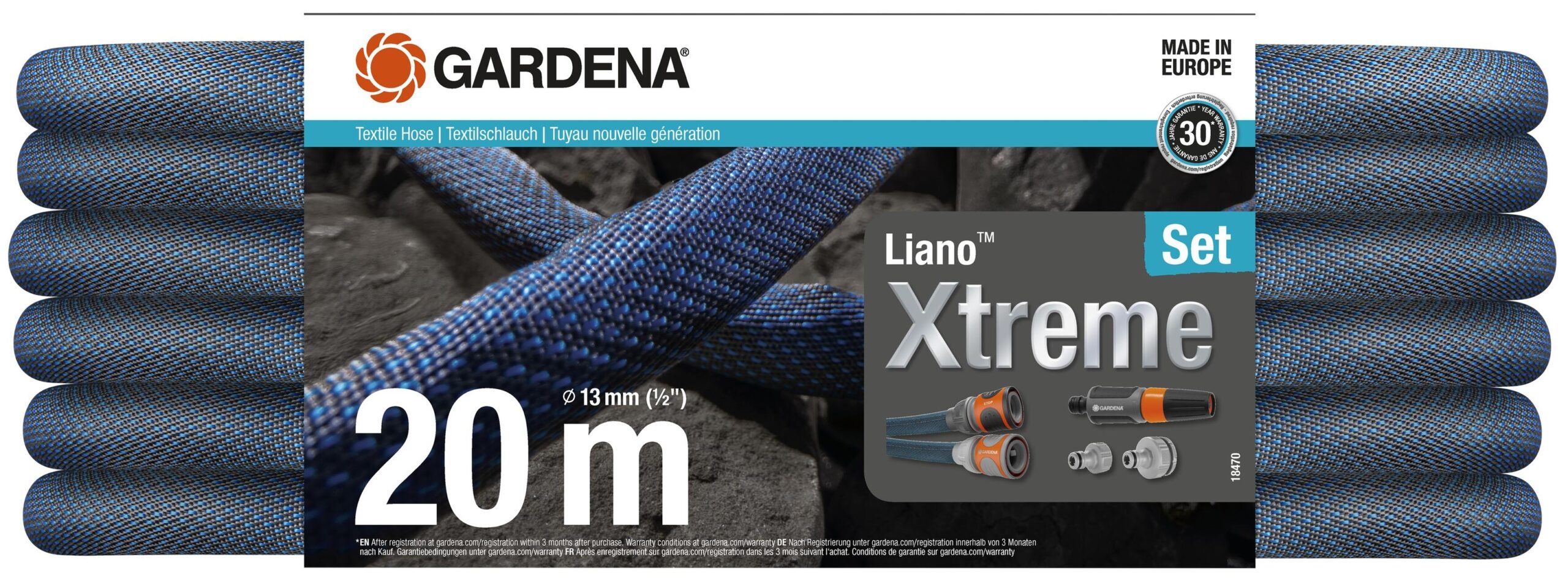Gebruik de Textielslang Liano™ Xtreme 20 m Set van GARDENA voor langdurige en uitdagende bewatering. Met een totale lengte van 20 m is de textielslang met een diameter van 13 mm (1/2") ideaal voor middelgrote tuinen. De Original GARDENA System-accessoires Liano™ Slangstuk en Liano™ Waterstop zijn al voorgemonteerd op de Liano™ Xtreme. Daarnaast bevat de set twee Kraanstukken en een Reinigingspistool. Doordat een van de twee kraanstukken een reduceerstuk bevat, kan je de textielslang aansluiten op drie verschillende kraanformaten. De Liano™ Xtreme dankt zijn uitstekende prestaties, flexibiliteit en hoge bestendigheid tegen externe invloeden aan de zeer flexibele PVC-binnenslang en de innovatieve buitenslang, gemaakt van extreem bestendig textiel. Dit maakt hem duurzaam en klaar voor de veeleisende uitdagingen in je tuin. Hij overwint ruig terrein, keien, rozendoorns of slepen langs ruwe muren zonder te knikken of te blijven haken. Je kan de Liano™ Xtreme langdurig comfortabel gebruiken, dankzij de aangename, slipvaste textuur en het laag gewicht. De vuilafstotende textielslang is tot wel 50% lichter dan conventionele PVC-slangen. Na de bewatering kan je de Liano™ Xtreme ruimtebesparend opbergen, bijvoorbeeld op een plank of in een schuurtje, dankzij zijn goede flexibiliteit. Hij past zich aan aan de beschikbare opbergruimte. De slang is bestand tegen een maximale druk van 35 bar. Dankzij zijn uv- en vorstbestendigheid kan hij het hele jaar door in de tuin blijven. De textielslang is vrij van schadelijke stoffen zoals ftalaten (<0,1%), maar ook cadmium, lood en barium (<0,1%). Na registratie op gardena.com/registration binnen 3 maanden na aankoop geeft GARDENA je een lange fabrieksgarantie van 30 jaar op de hoogwaardige Textielslang Liano™ Xtreme, die is geproduceerd in Europa. Ontwikkeld voor het extreme. Ontworpen voor het alledaagse. Liano™ Textielslangen.