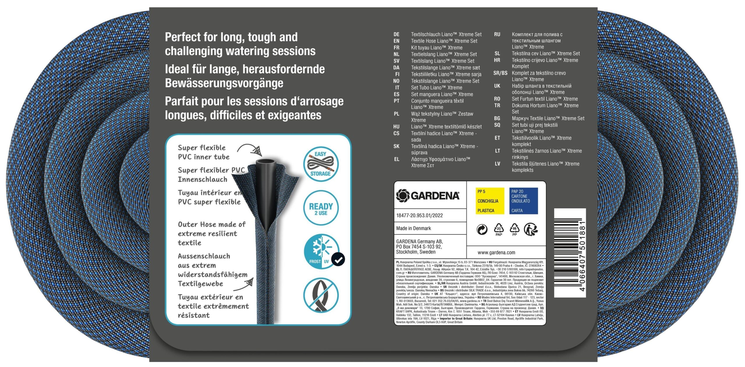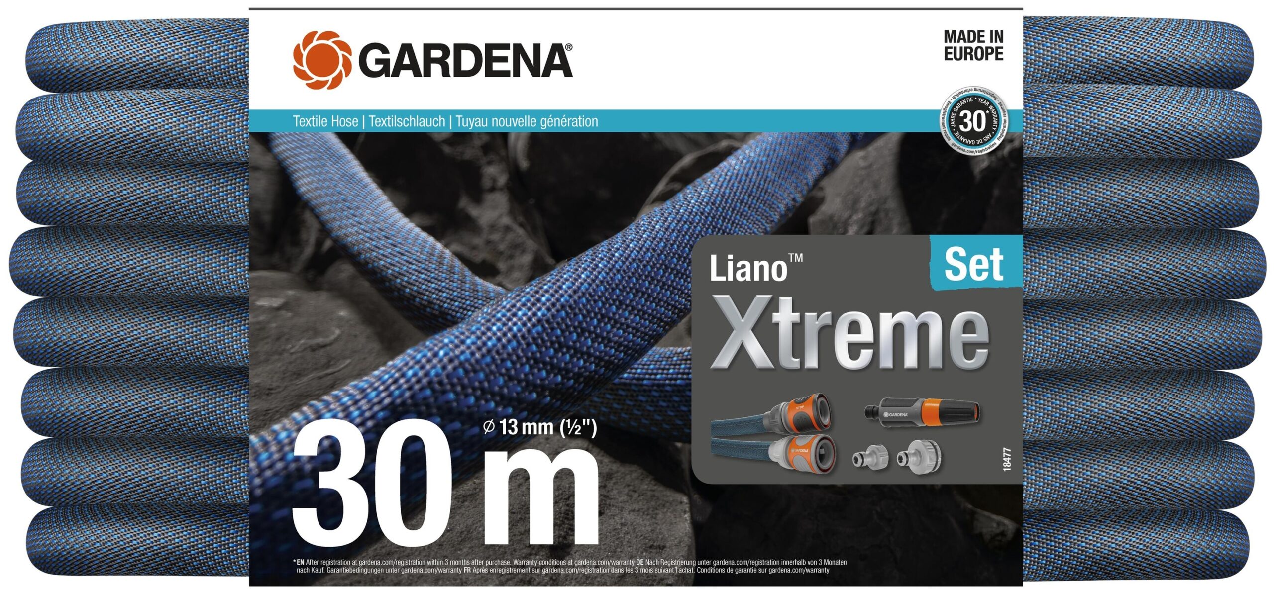 Praktische complete set met 30m lange, stevige textielslang, voor langdurige en uitdagende bewatering. De Textielslang Liano™ Xtreme 30m Set van GARDENA is ideaal voor de langdurige en veeleisende bewatering van je grote tuin. De gebruiksklare set bestaat uit de 30m lange Liano™ Xtreme met een diameter van 13mm (1/2"), de voorgemonteerde Original GARDENA System-onderdelen: het Liano™ Slangstuk, de Liano™ Waterstop, twee Kraanstukken en een Reinigingspistool. Eén van de twee kraanstukken bevat een geïntegreerd reduceerstuk, zodat je de textielslang kan aansluiten op drie verschillende kraangroottes. De stevige Liano™ Xtreme valt op met zijn zeer flexibele PVC-binnenslang en de innovatieve buitenslang, gemaakt van extreem bestendig textiel. Deze combinatie zorgt voor uitstekende prestaties, flexibiliteit en duurzaamheid. De tuinslang is stevig en vuilafstotend en is klaar voor iedere uitdaging. Je kan de Liano™ Xtreme gemakkelijk verplaatsen, omdat hij niet knikt of blijft haken. De textielslang overwint ruig terrein zoals keien, rozendoorns of slepen langs ruwe muren. Dankzij zijn aangename textuur ligt hij comfortabel in de hand. Daarnaast is de Liano™ Xtreme tot wel 50% lichter dan conventionele PVC-slangen. Dit is bijzonder handig in een grote tuin en tijdens langere bewateringssessies. Dankzij zijn elasticiteit kan je de textielslang ruimtebesparend opbergen op de plank of in de garage, want hij past zich aan aan de beschikbare opbergruimte. De barstdruk van de slang is 35 bar. Dankzij de uv- en vorstbestendigheid kan de Liano™ Xtreme het hele jaar door gebruikt worden, ongeacht de weersomstandigheden. Hij is bovendien vrij van schadelijke stoffen zoals ftalaten (<0,1%), maar ook cadmium, lood en barium (<0,1%). De Textielslang Liano™ Xtreme is een kwaliteitsproduct dat is ontwikkeld in Duitsland en GARDENA geeft er 30 jaar fabrieksgarantie op na registratie op gardena.com/registration binnen 3 maanden na aankoop. Ontwikkeld voor het extreme. Ontworpen voor het alledaagse. Liano™ Textielslangen.