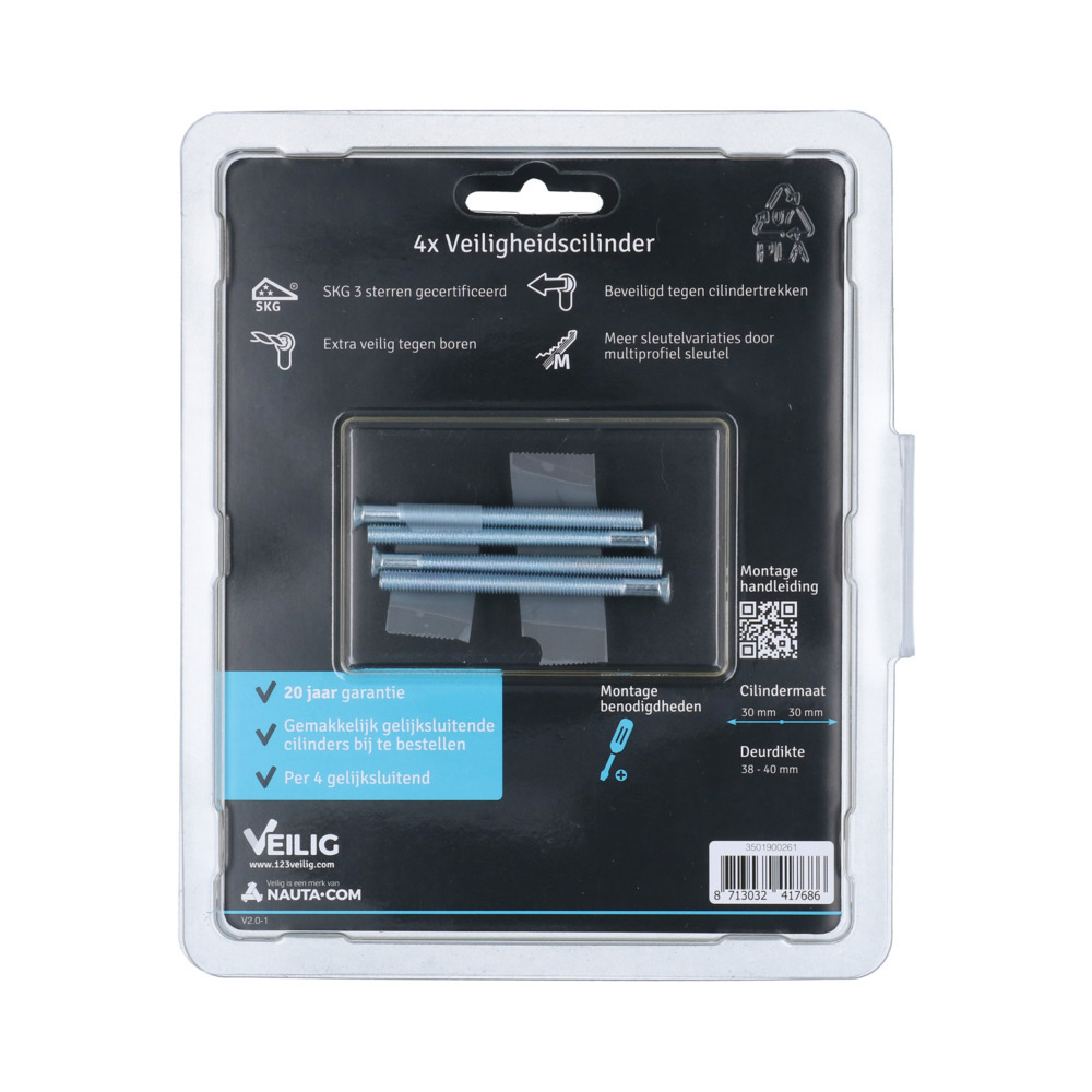 VEILIG veiligheidsprofielcilinder, lengte 30/30, profiel S7, messing vernikkeld, per 4 gelijksluitend, 6 sleutels, skg***, in blister