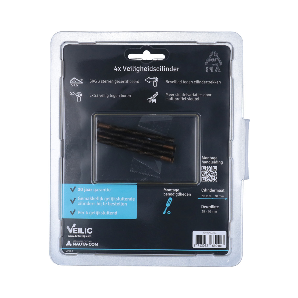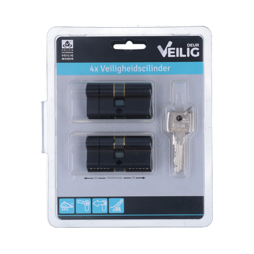 VEILIG veiligheidsprofielcilinder, lengte 30/30, profiel S7, zwart, per 4 gelijksluitend, 6 sleutels, skg***, in blister